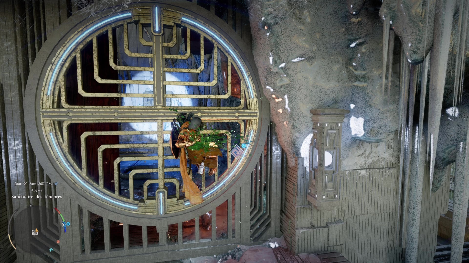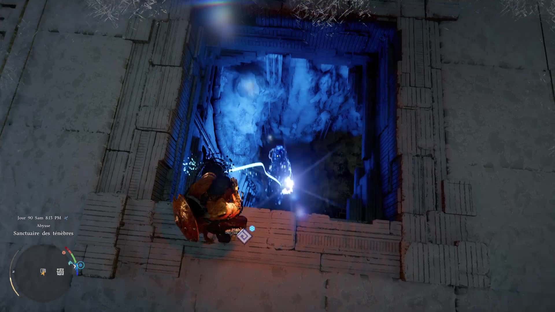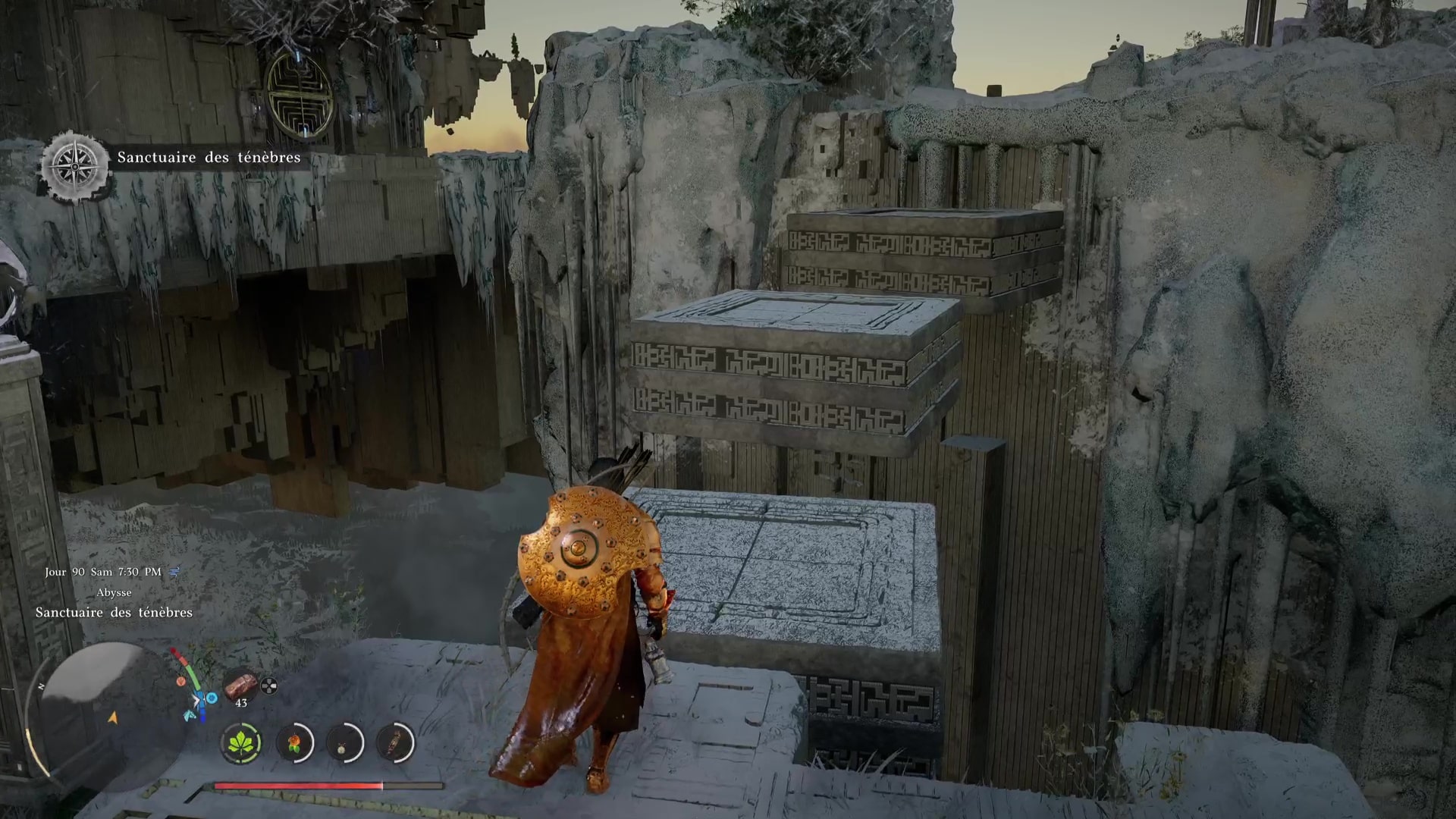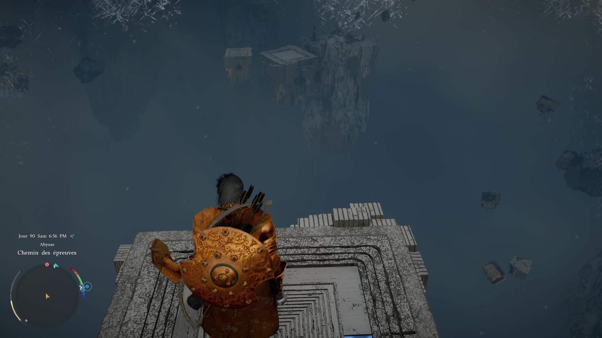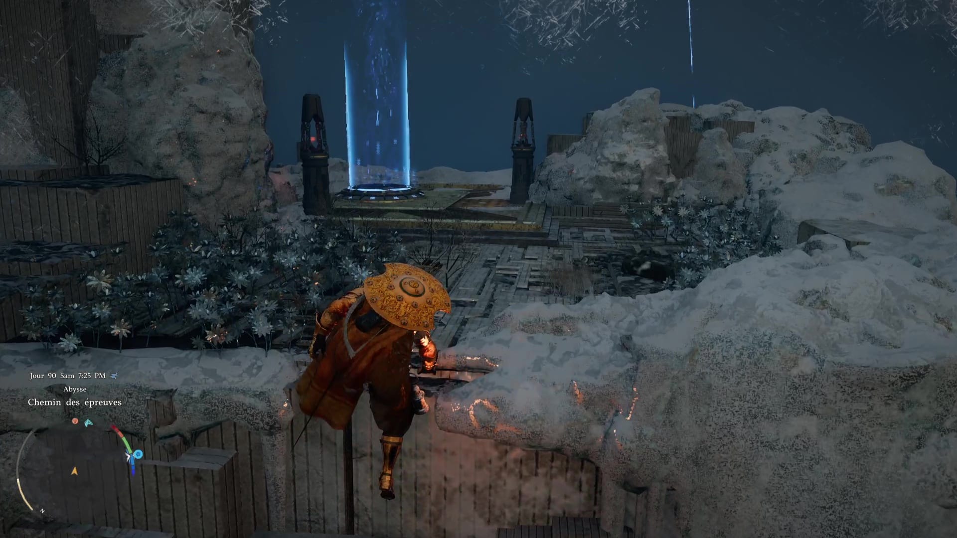 Une fois de l’autre côté, montez au centre du mécanisme et frappez-le avec un coup de paume. Le monolithe de fin de parcours désormais activé, montez au niveau supérieur en grimpant ou via un triple saut de paume, puis allez récupérer l’artefact abyssal auprès du monolithe.