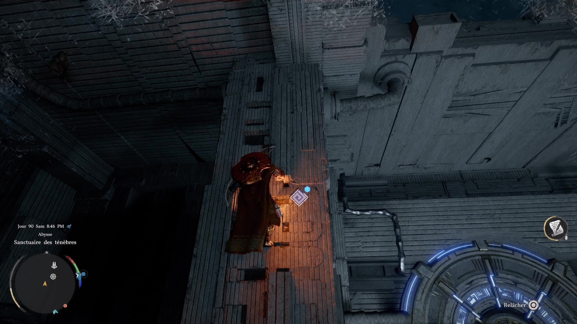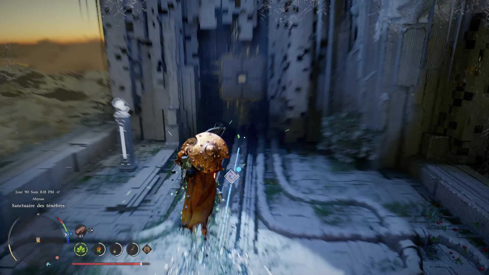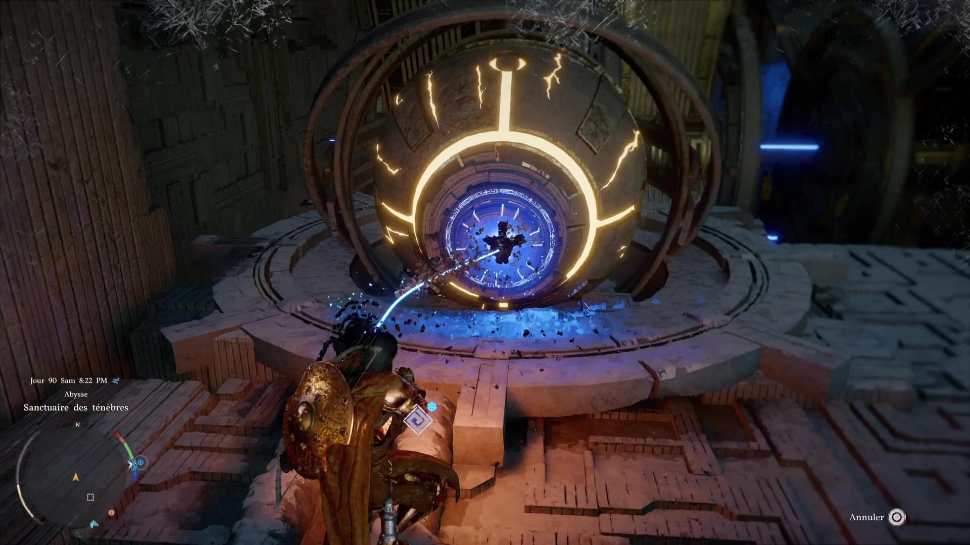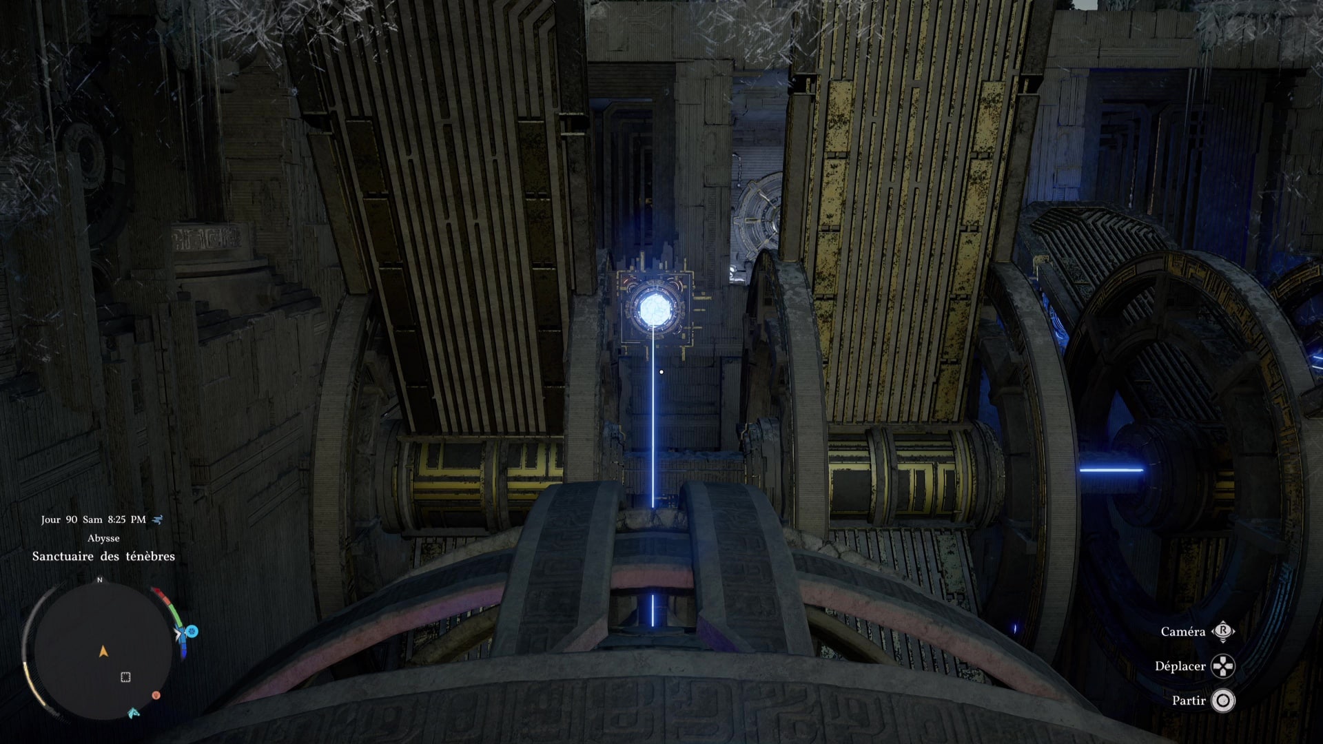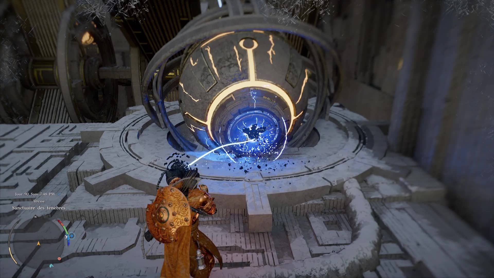 Une fois de l’autre côté, montez au centre du mécanisme et frappez-le avec un coup de paume. Le monolithe de fin de parcours désormais activé, montez au niveau supérieur en grimpant ou via un triple saut de paume, puis allez récupérer l’artefact abyssal auprès du monolithe.