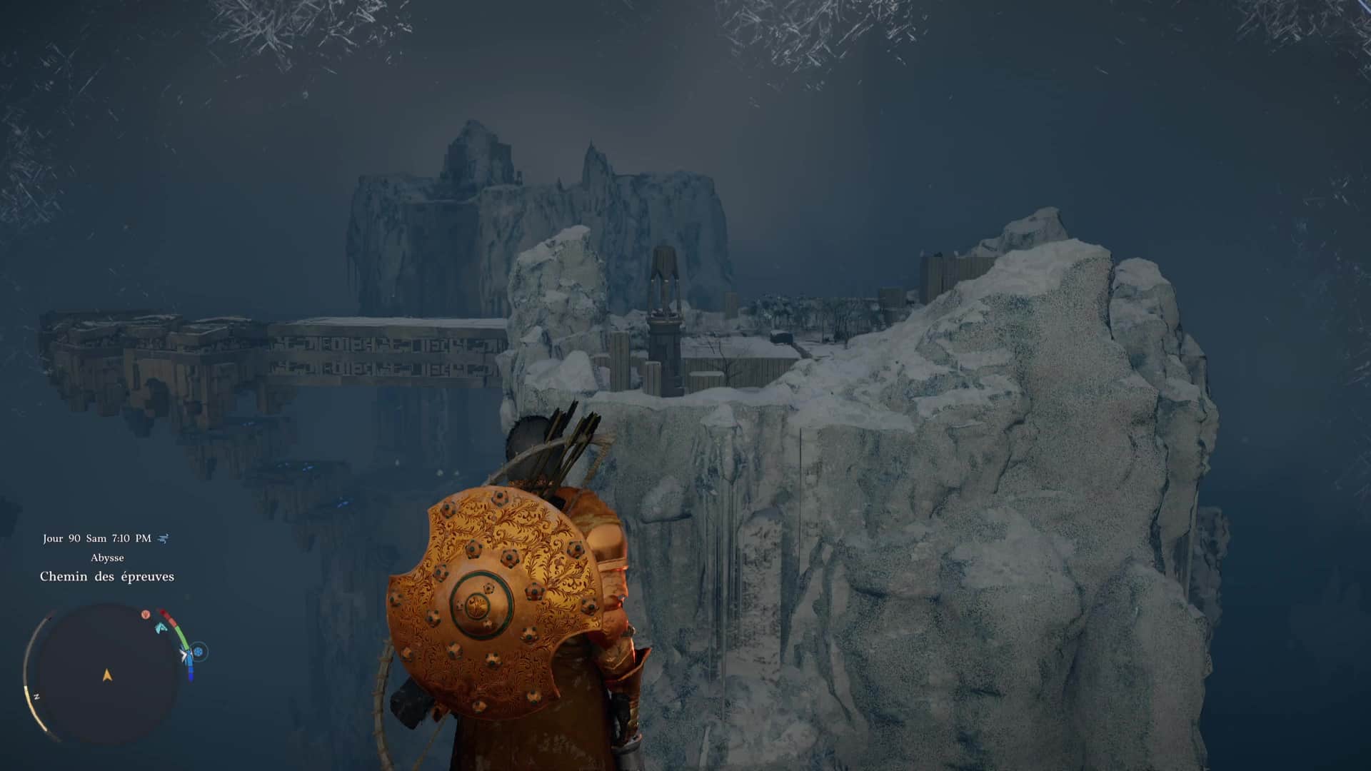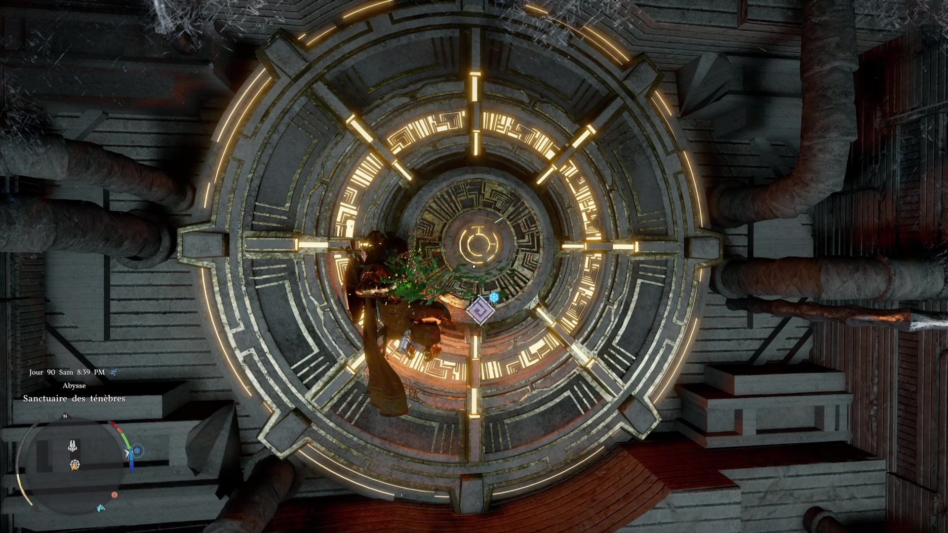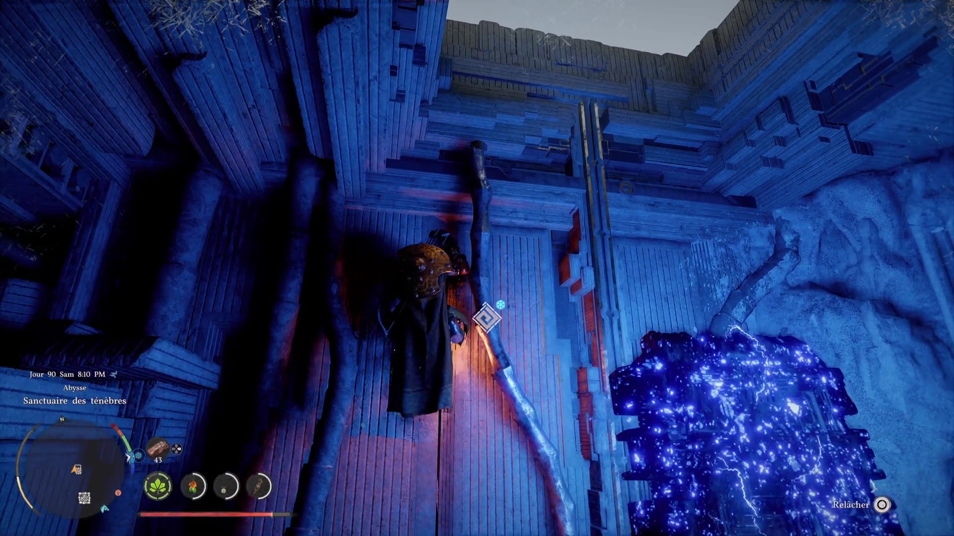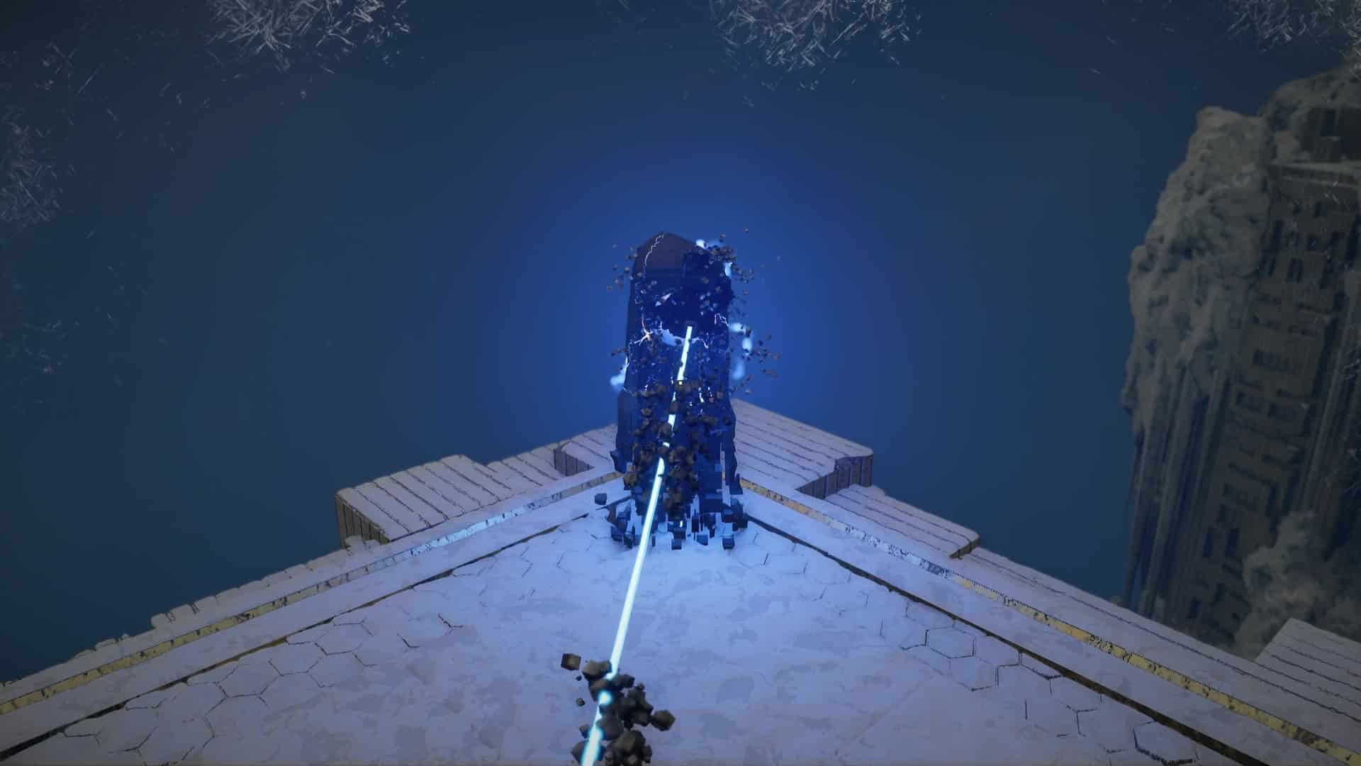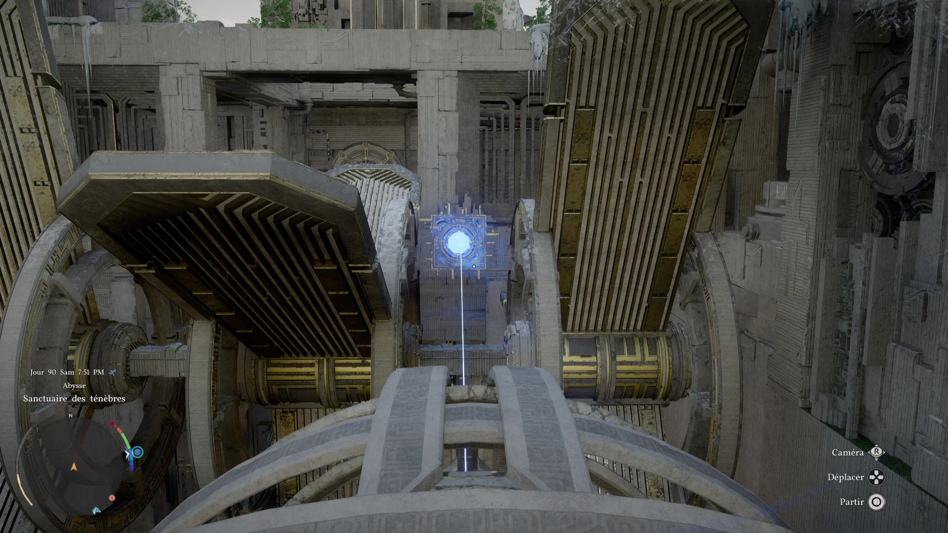Une fois de l’autre côté, montez au centre du mécanisme et frappez-le avec un coup de paume. Le monolithe de fin de parcours désormais activé, montez au niveau supérieur en grimpant ou via un triple saut de paume, puis allez récupérer l’artefact abyssal auprès du monolithe.