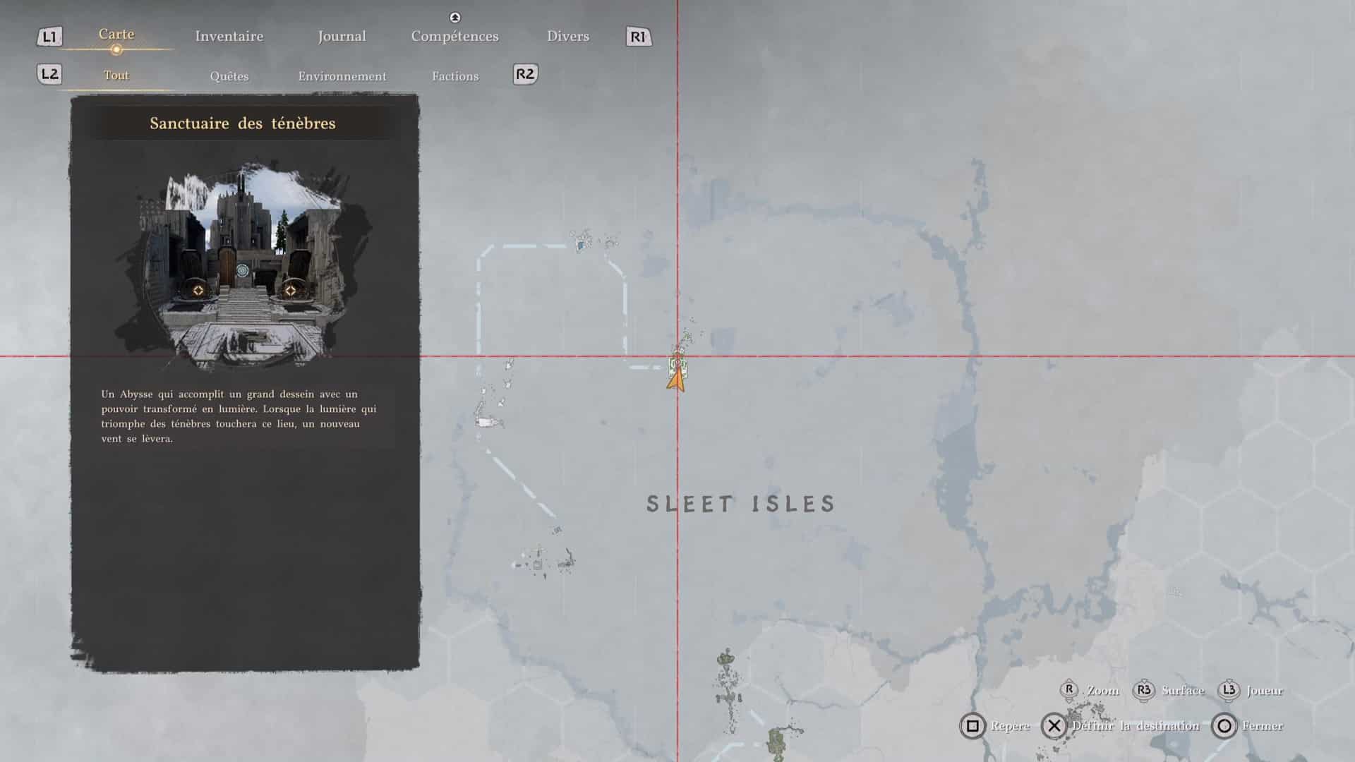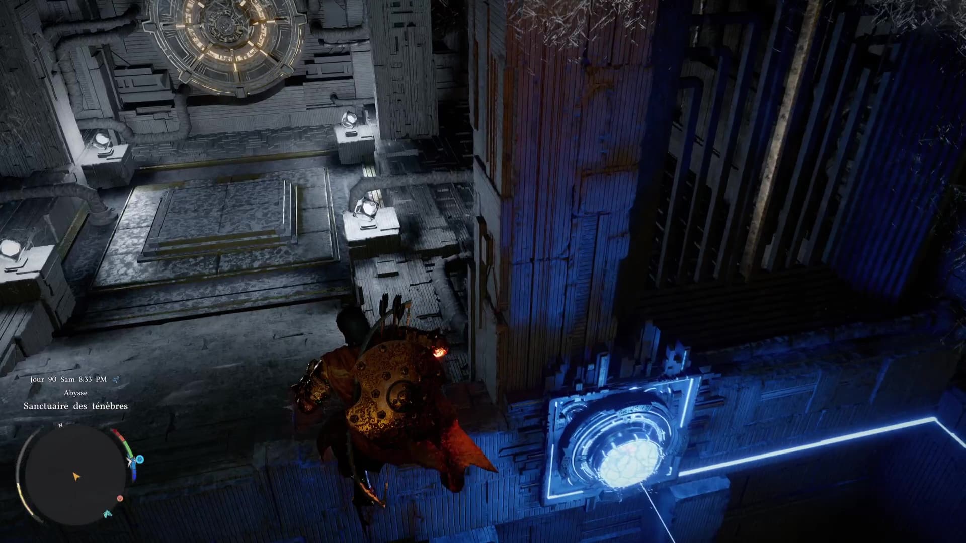 Suivez ensuite le parcours de plateforme en allant de plateforme mobile en plateforme mobile pour finalement arriver à un téléporteur. Placez-vous dessus pour être amené directement dans la zone du Sanctuaire des ténèbres.