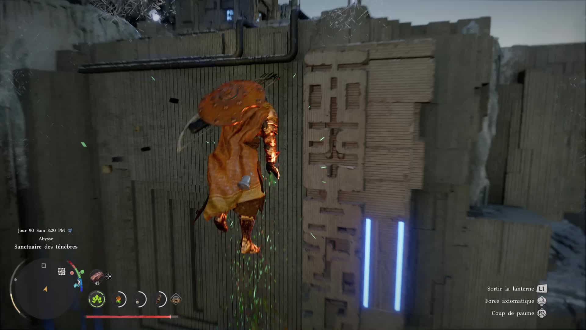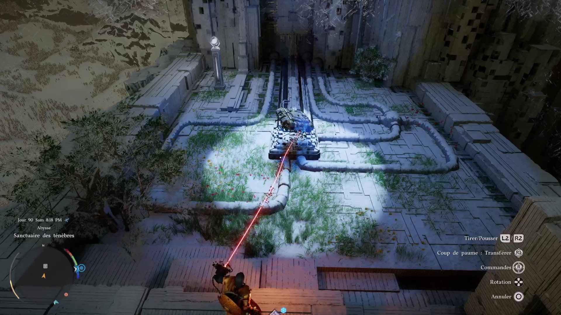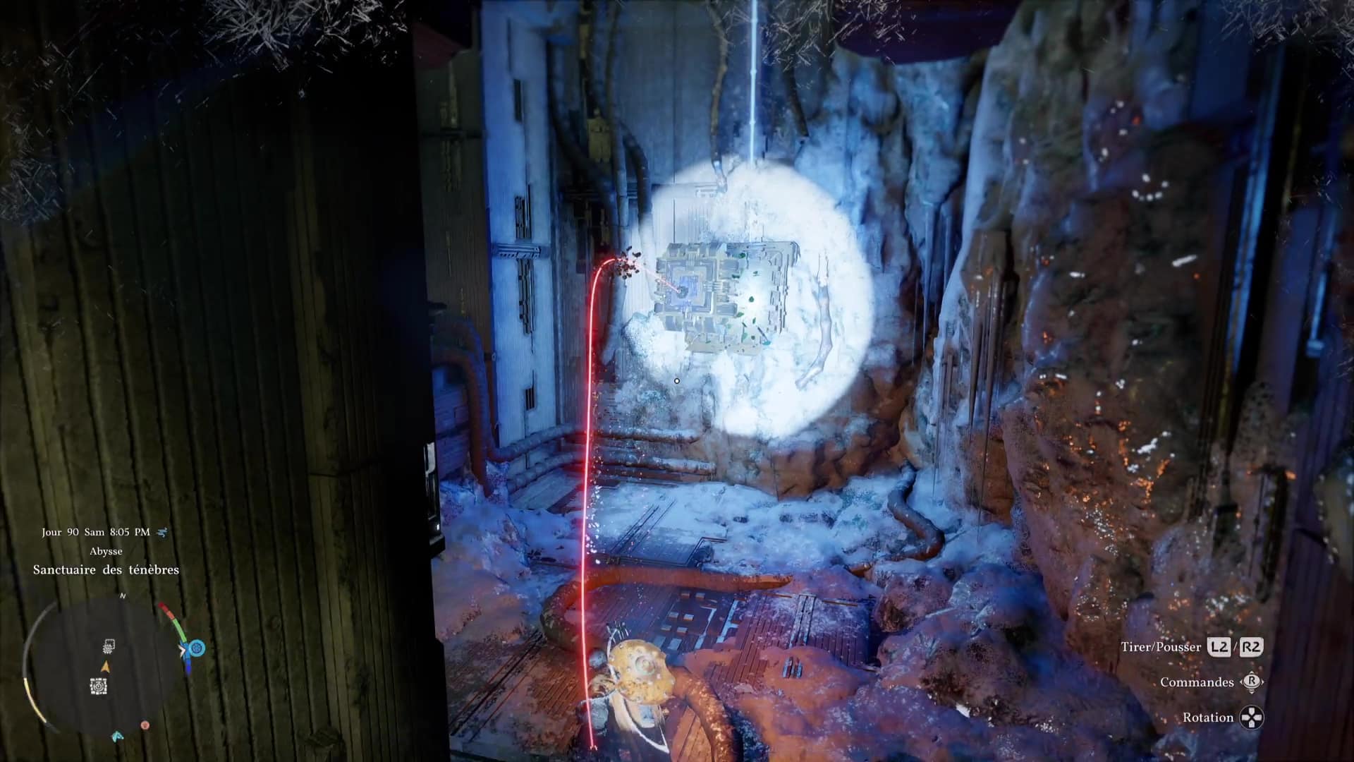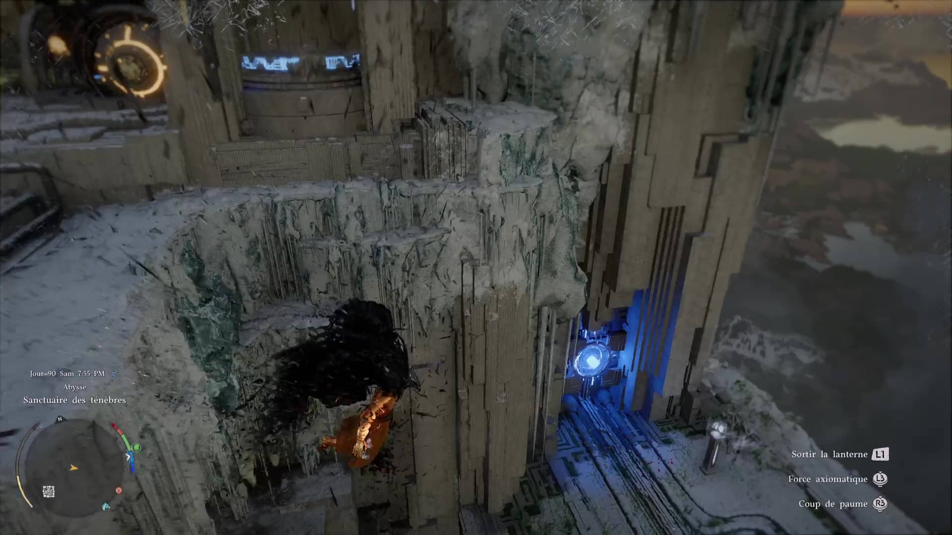 L’énergie va alors être redistribuée à l’orbe géant de gauche. Remontez au niveau supérieur en grimpant ou via un triple saut de paume (saut + plusieurs fois R3/RS). Branchez votre force axiomatique à l’arrière de l’orbe et, comme pour le premier, éclairez l’interrupteur lumineux devant vous.