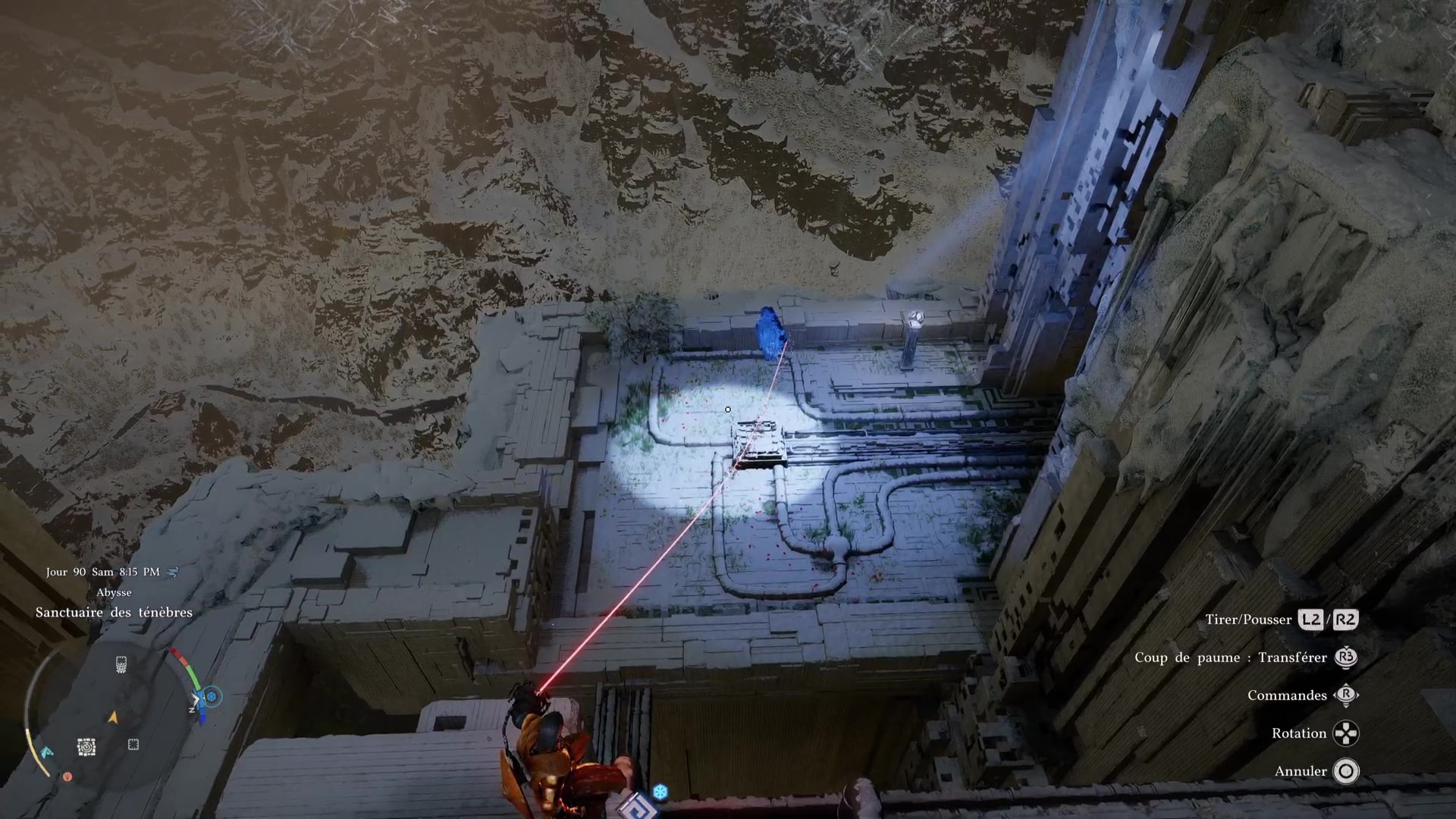 Dirigez-vous ensuite sur la gauche lorsque vous faites face aux deux orbes géants puis poussez la batterie carrée le plus loin possible de vous, et le plus près possible de son emplacement dédié. Sautez et planez pour vous rapprocher et collez la batterie à son emplacement. Enfoncez-la avec un saut de paume.