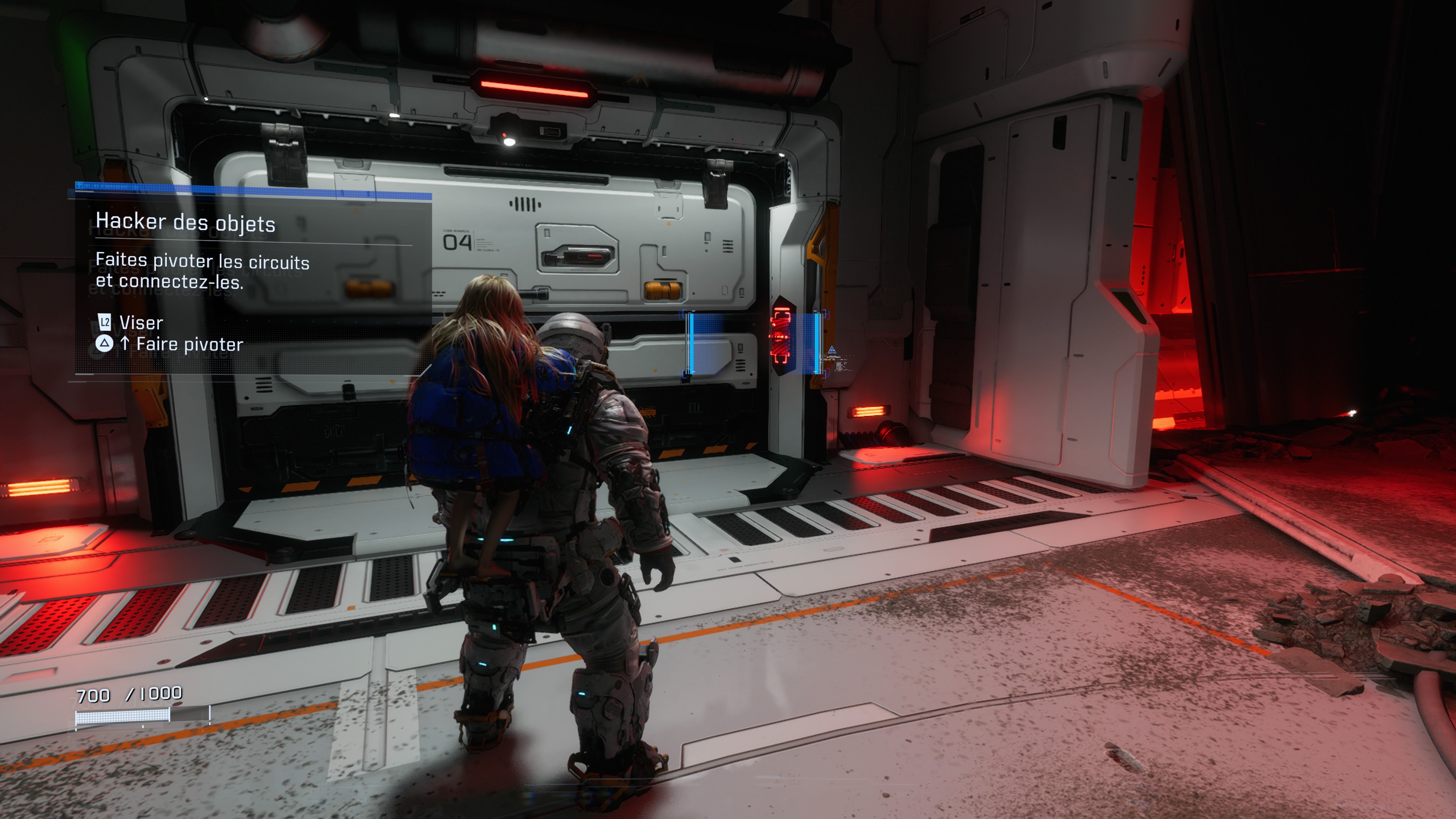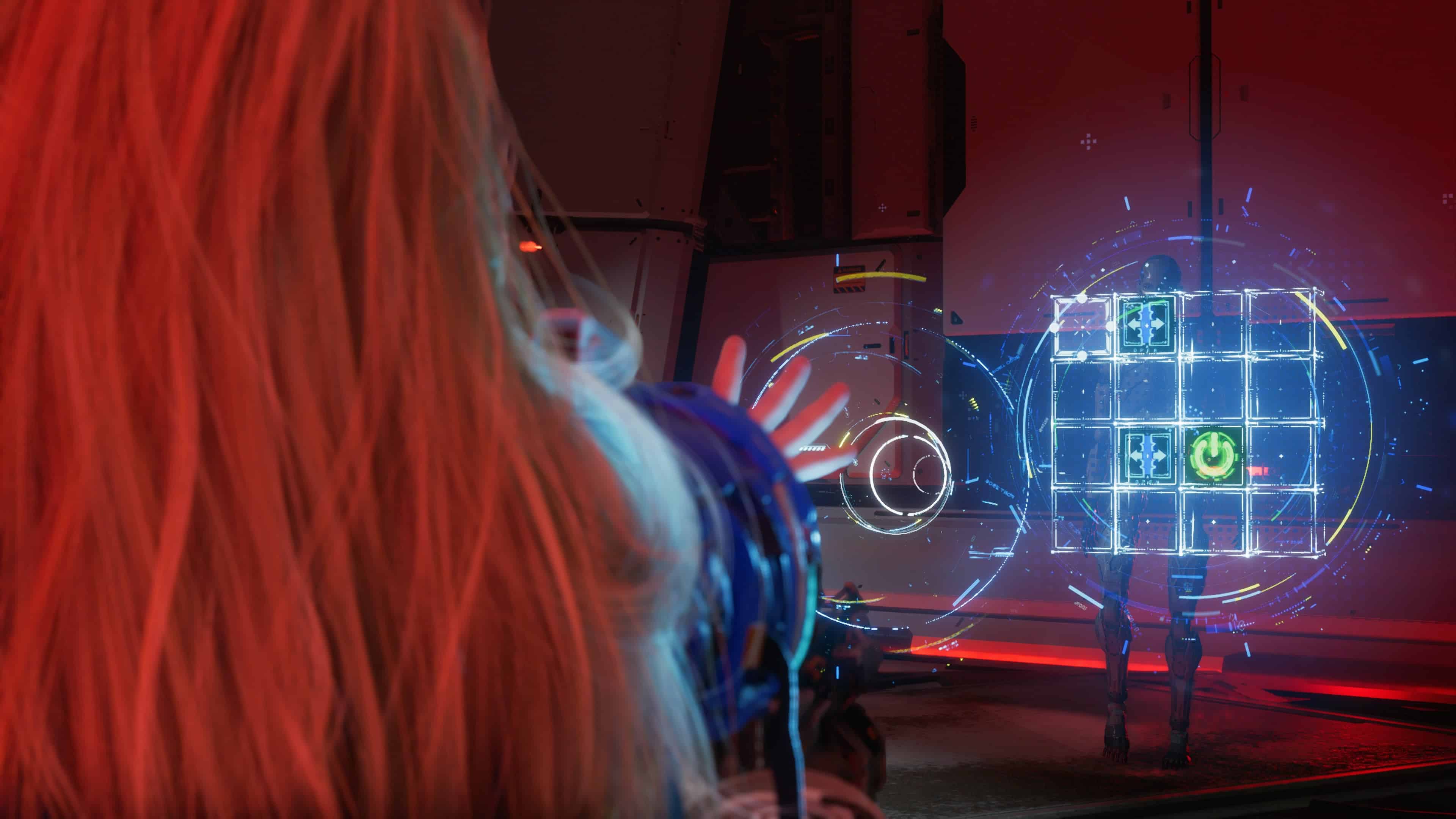 Hors combat, les compétences en hacking de Diana vous aideront à franchir différents obstacles, tels que des portes verrouillées, des lasers, ainsi que des phases de plateformes. Dans ces conditions, le titre vous demandera simplement de pirater des panneaux de contrôle en amont. Toutefois, les « puzzles » qui vous seront proposés ici ne prendront pas la même forme que ceux visibles lors des affrontements. Par exemple, il y en a un où vous devrez faire pivoter un ou plusieurs nœuds de manière à le/les lier à une sorte de noyau central, tandis qu’un autre vous invitera à entrer une série de commandes dans le bon ordre pour réussir le hacking.