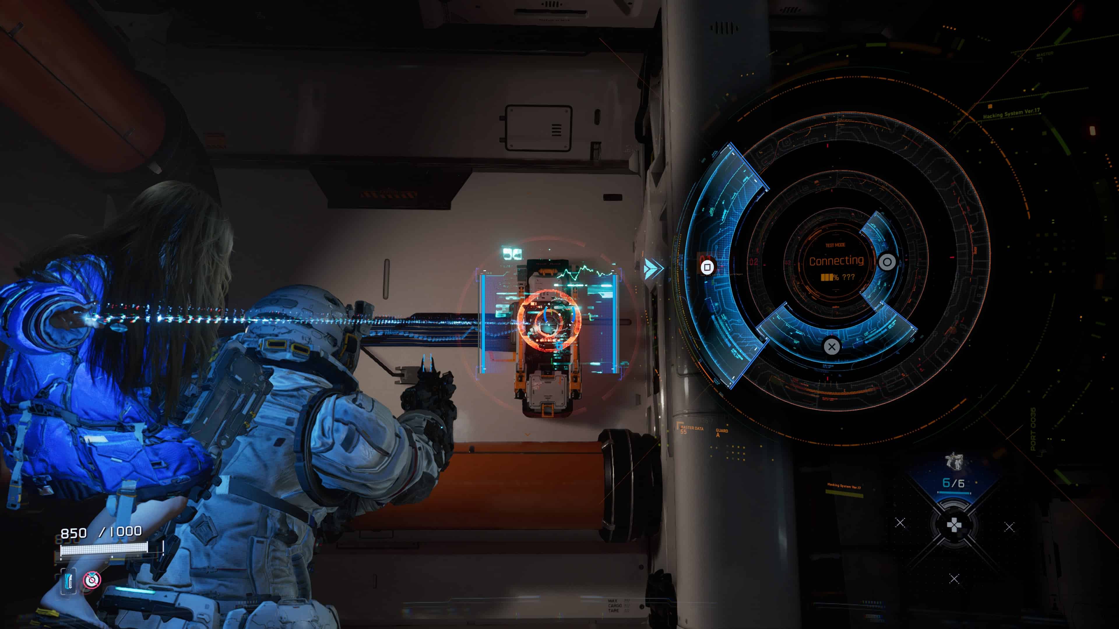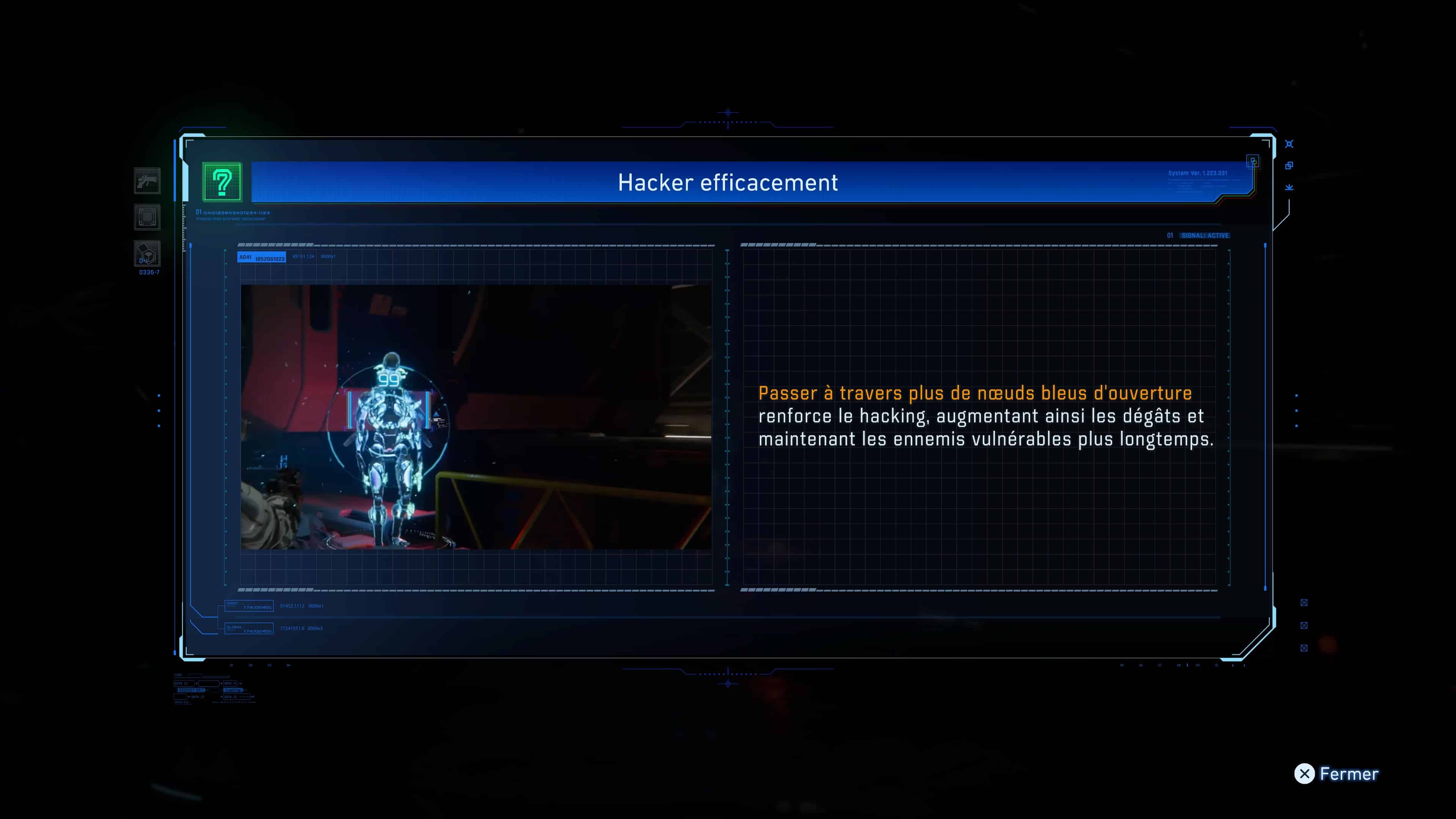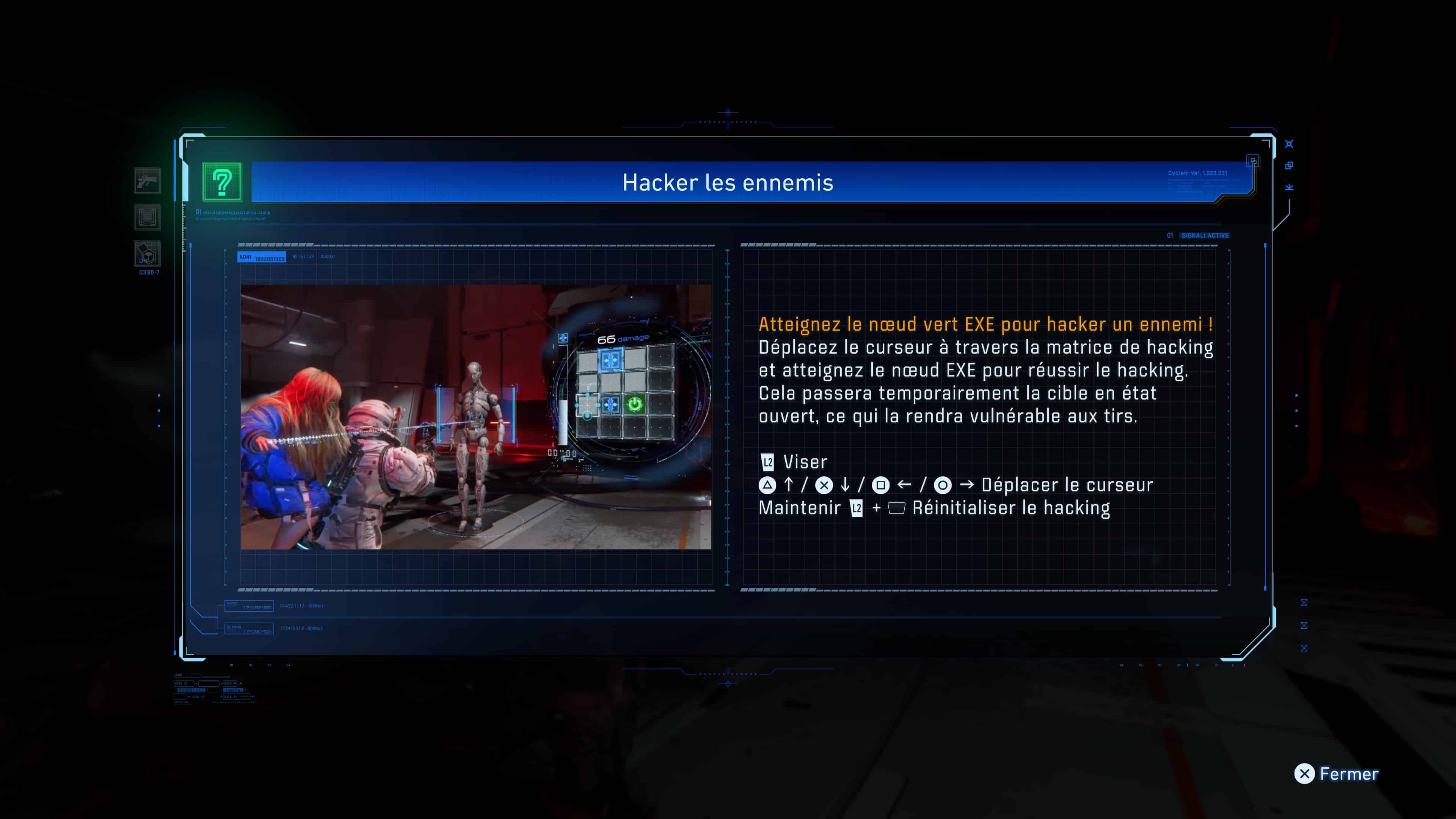 Pour cela, il faut commencer par viser une cible spécifique, ce qui fait alors apparaitre l’équivalent d’un « mini-jeu » ou d’un « puzzle » à résoudre à l’écran. Prenant la forme d’une sorte de matrice composée d’un certain nombre de cases, vous devez ensuite y déplacer un curseur, de façon à ce qu’il atteigne la case verte visible dedans qui est synonyme de hacking réussi (aussi appelée « nœud EXE » en jeu). En récompense, votre adversaire vous révèlera l’existence de ses points faibles sur lesquels tirer avec les armes de Hugh, en vue de vous en débarrasser bien plus facilement.