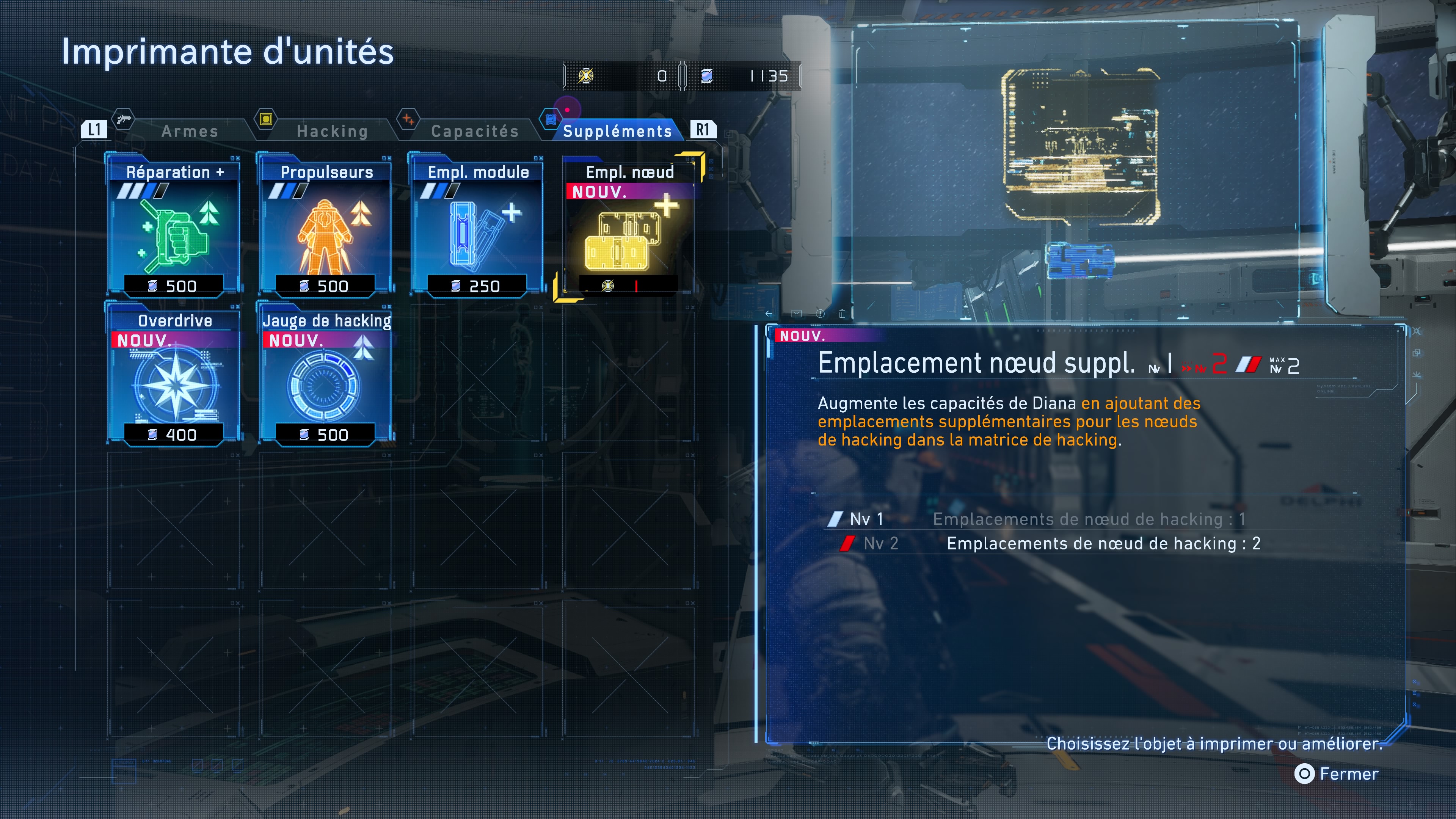 C’est essentiellement au Refuge, le hub vous servant de lieu de repos pendant votre périple, que vous pouvez améliorer les compétences en hacking de Diana. En effet, grâce à l’Imprimante d’unités, il est possible de débloquer et renforcer ses capacités en échange de Lunum pur et de lunafibre (précision du scanner, mode offensif, ajout d’emplacements de nœuds spéciaux supplémentaires…). La console d’Amélioration du firmware située juste à coté a aussi son utilité puisqu’elle peut augmenter la quantité des dégâts de hacking et la durée de piratage des ennemis ciblés, en y dépensant des Composants d’amélioration dans l’onglet « Hacking ».