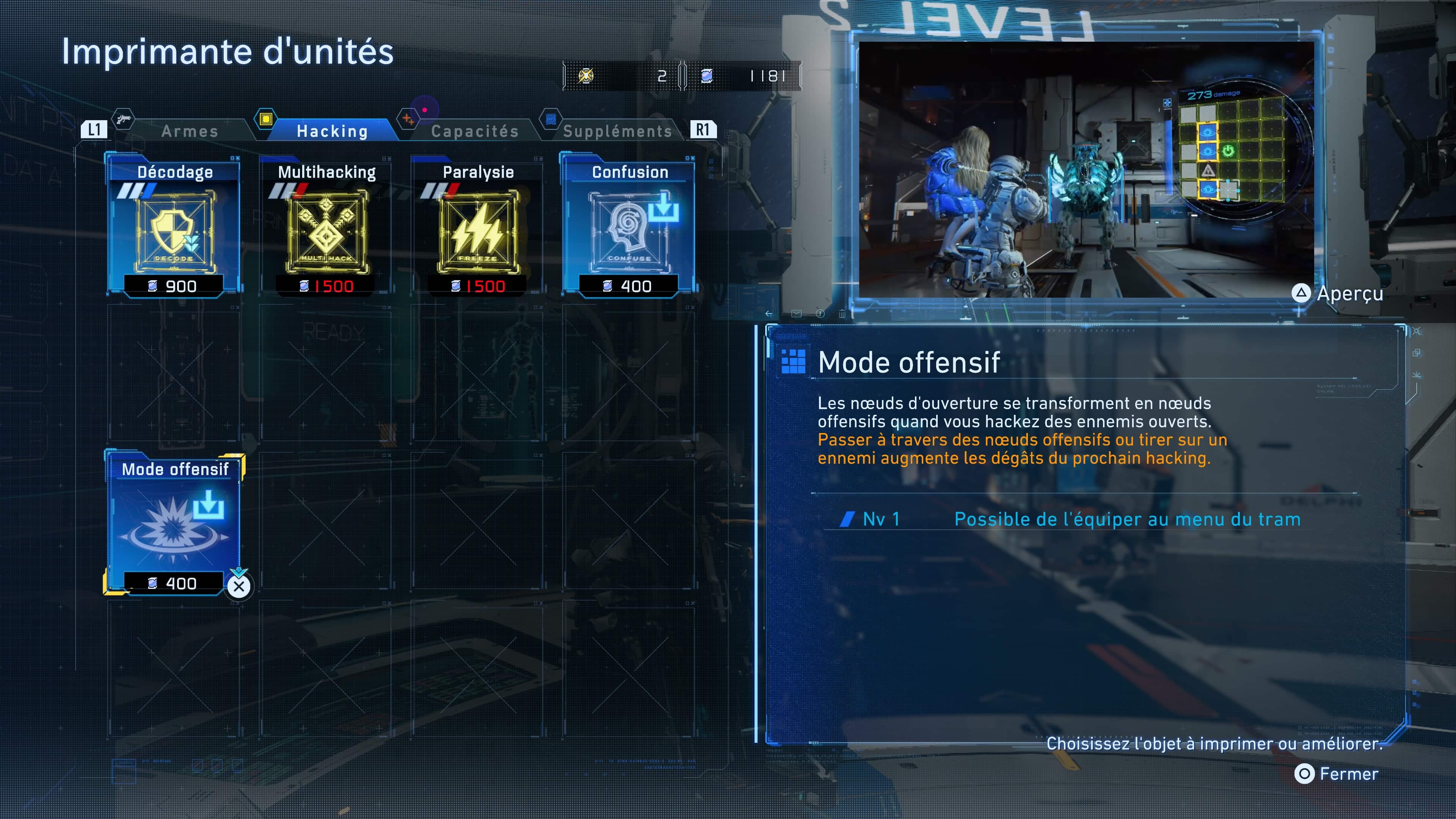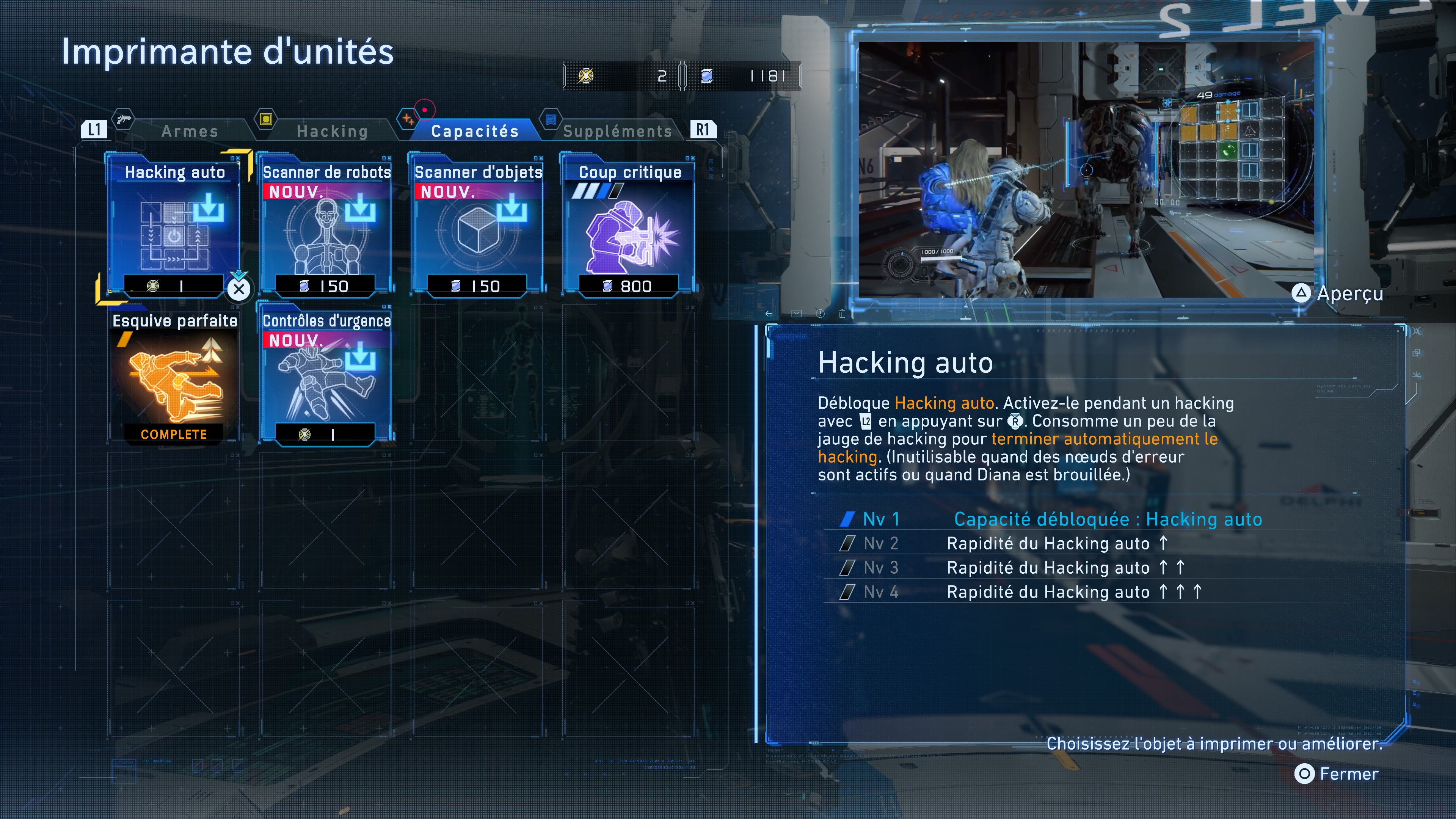Arrivé à un certain stade de l’aventure, il est effectivement possible d’acquérir une compétence vous permettant de hacker automatiquement un ennemi en combat. Sobrement intitulé « Hacking auto », vous devrez dépenser un fragment de Lunum pur à l’Imprimante d’unités située au Refuge pour le débloquer (onglet « Capacités »). Mais attention, vous serez tout de même obligés de lancer le « puzzle » de piratage au préalable. Cela consommera aussi une partie de la jauge de hacking de Diana et ce programme mettra un certain temps pour fonctionner correctement et complètement. Heureusement, vous pourrez améliorer sa rapidité d’exécution en échange de lunafibre, toujours depuis le Refuge.