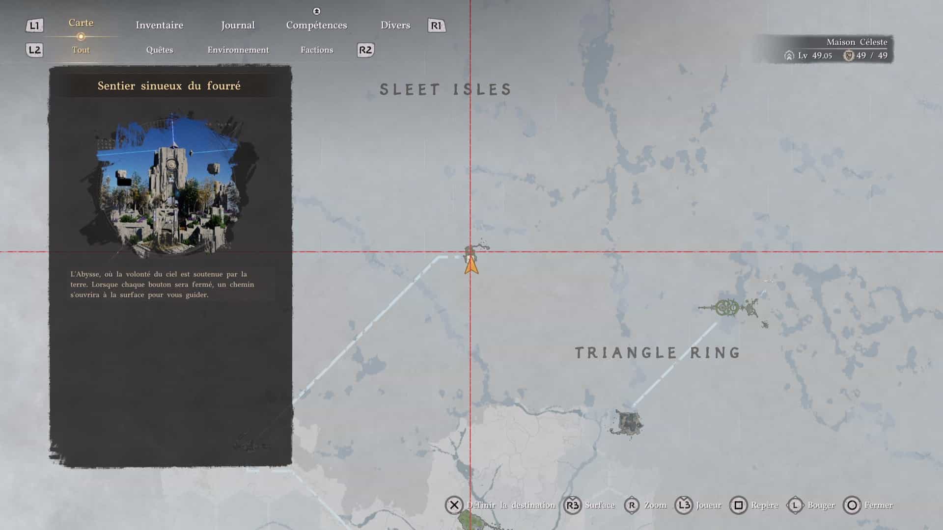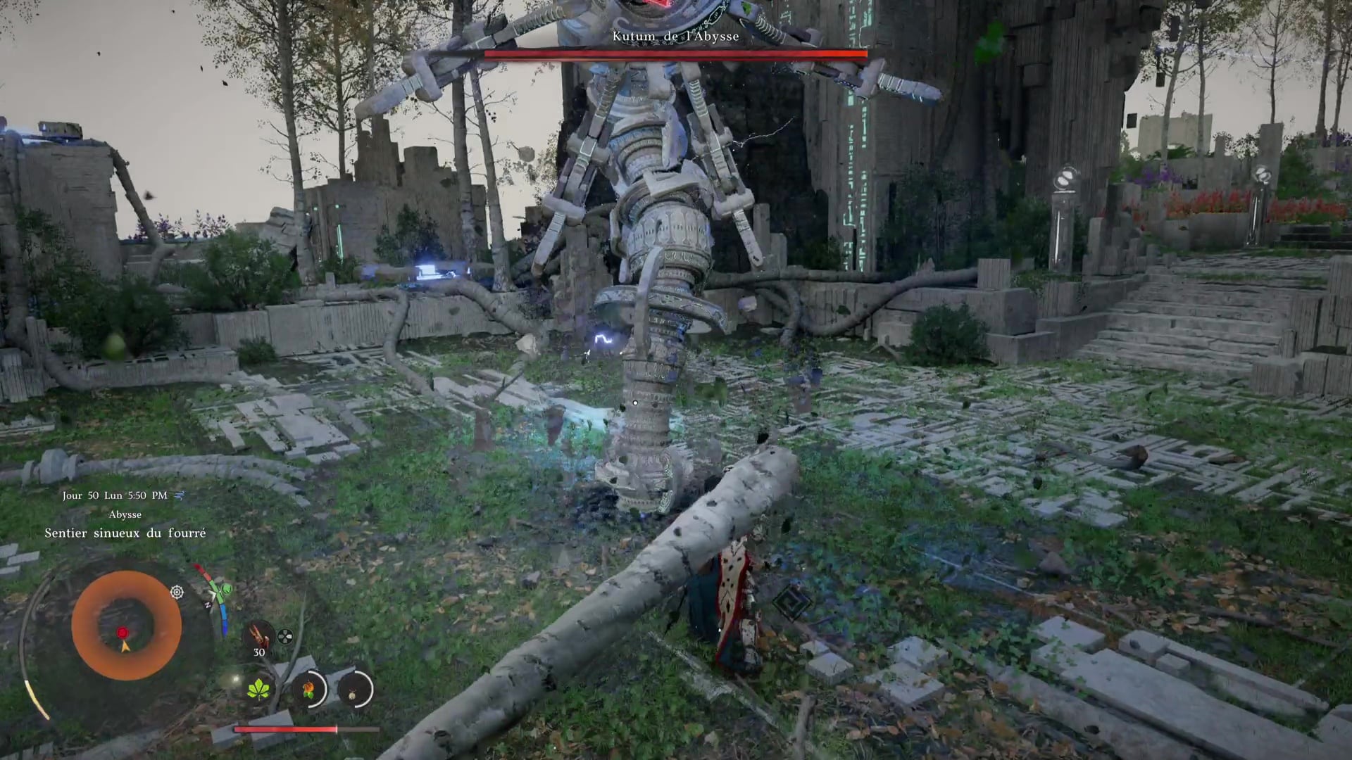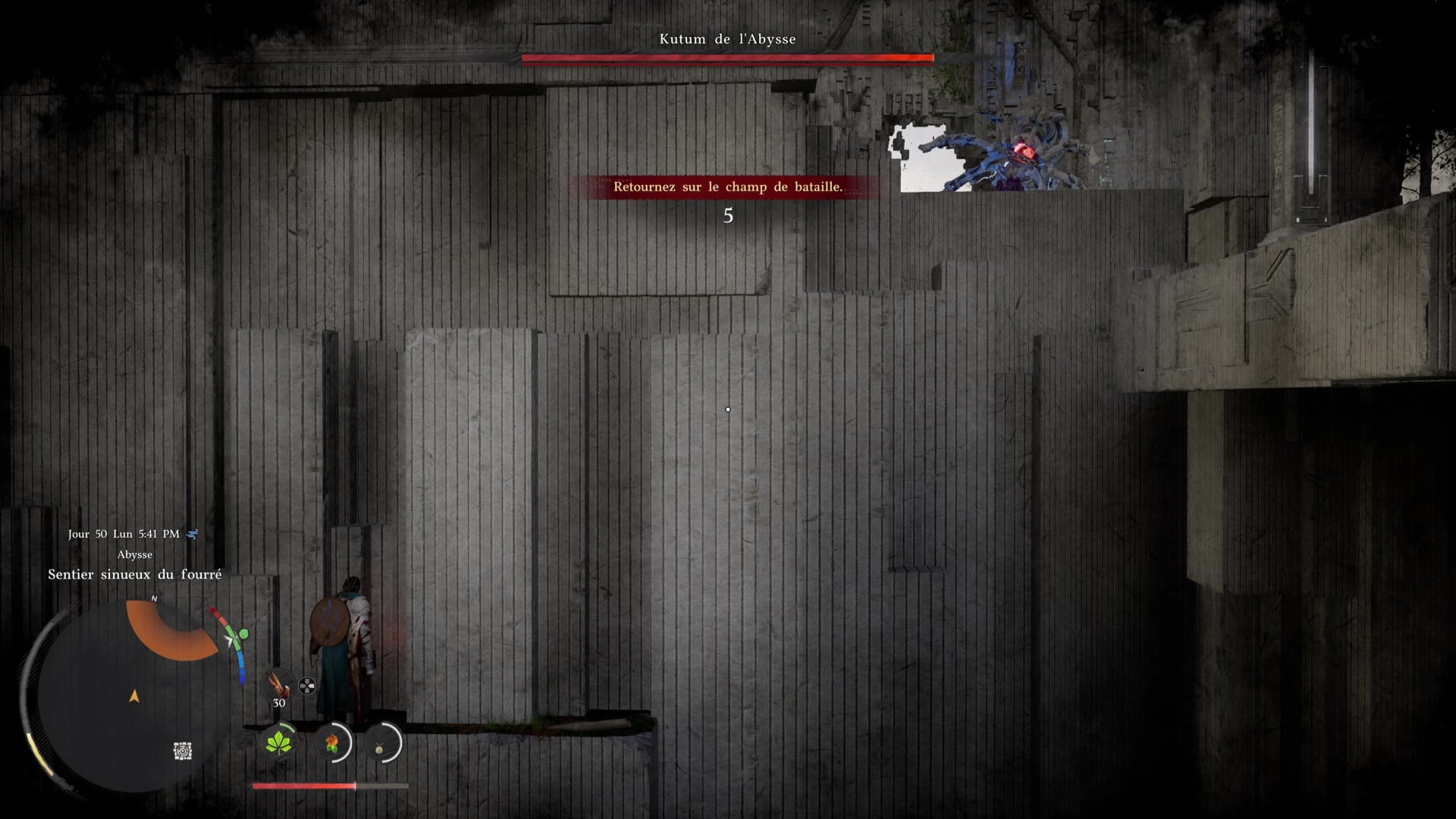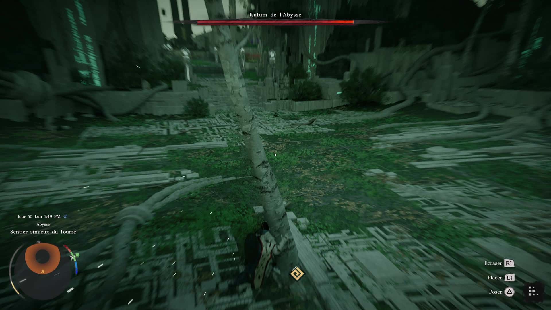 Tout en veillant à ne pas déclencher le combat avec Kutum, et depuis la dalle de Nexus abyssal de l’île, allez sur la gauche vers les deux arbres les plus proches. Si Kutum vous prend pour cible, cachez-vous et faites en sorte que le compte à rebours des 30 secondes (qui se déclenche lorsque l’on s’éloigne trop du boss), arrive à son terme.