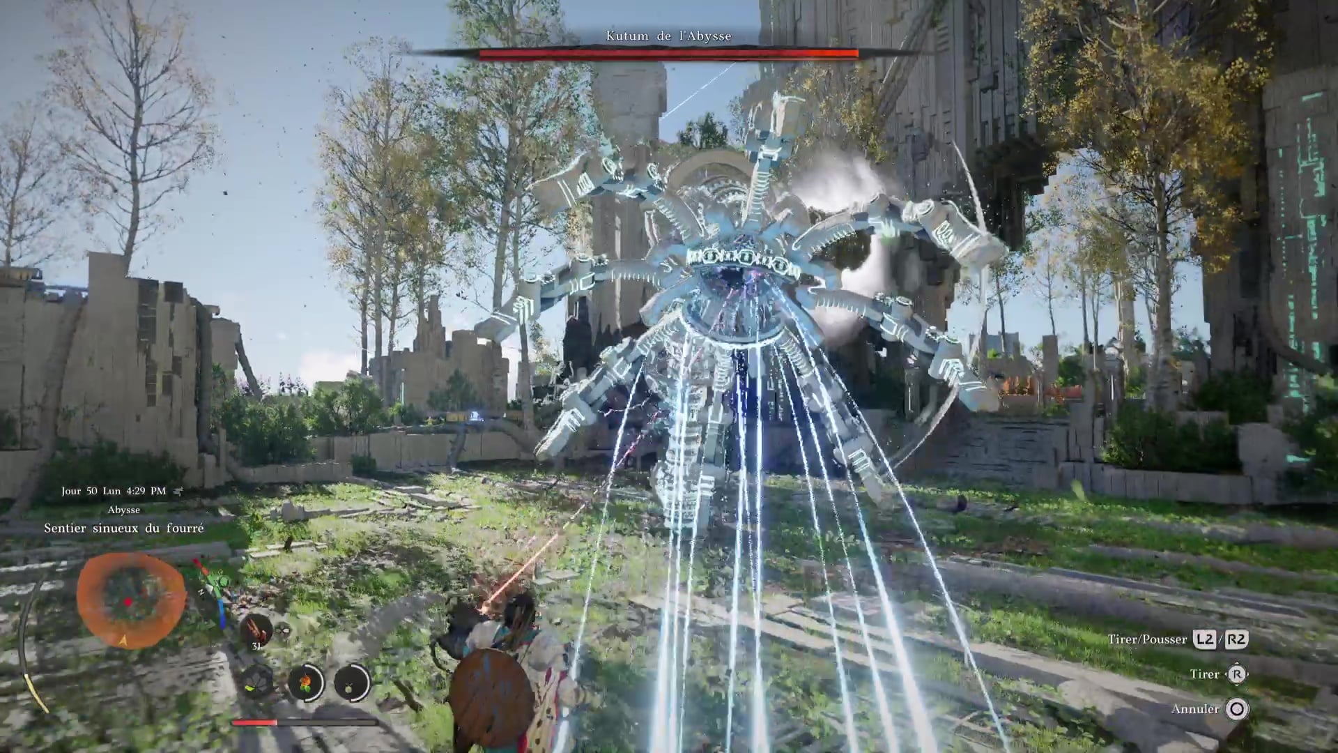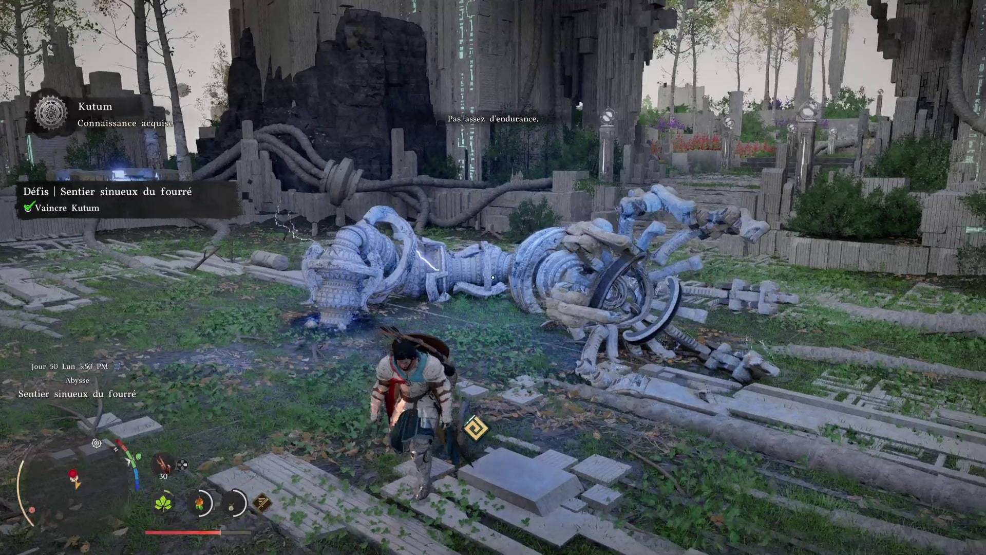 Dès que Kutum réapparait, courez vers lui et appuyez sur R1/RB pour lui éclater le tronc dessus. Effectué avec le bon timing, ce coup tuera instantanément Kutum. Vous voilà maintenant tranquille pour réussir le puzzle du Sentier sinueux du fourré.