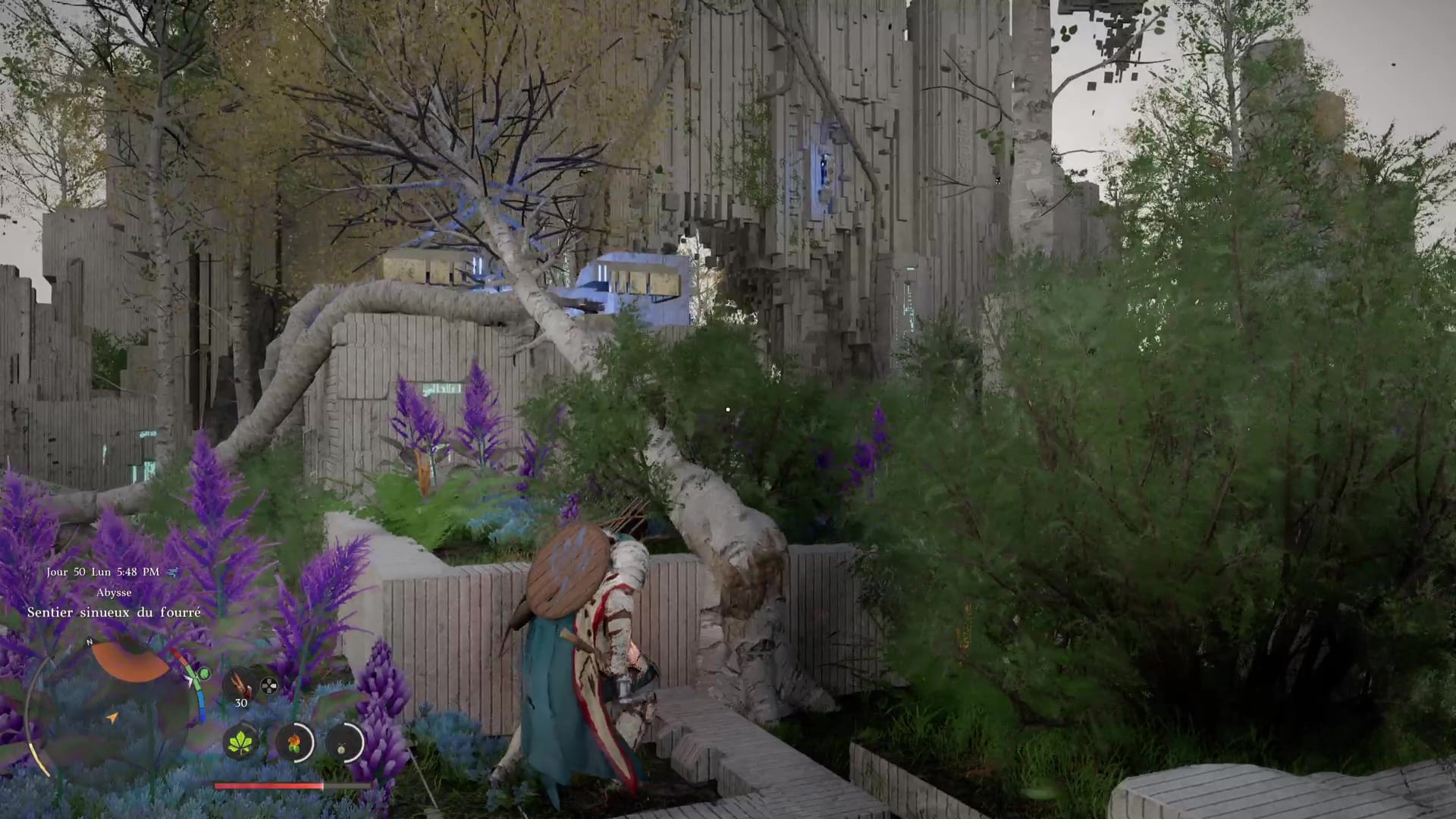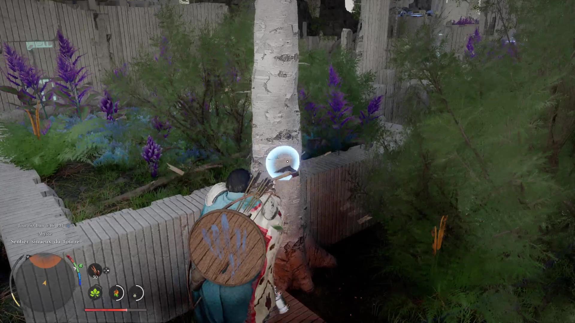 Hors de danger, mettez-vous à côté de l’arbre qui est le plus éloigné de l’arène et coupez le tronc avec une hache pour le faire tomber vers l’arène de boss. Avant de passer à la suite, si vous n’avez pas un losange d’endurance + une moitié, équipez-vous d’un plat qui vous redonne de l’endurance.