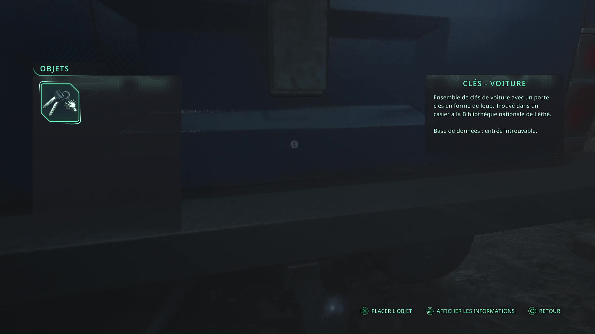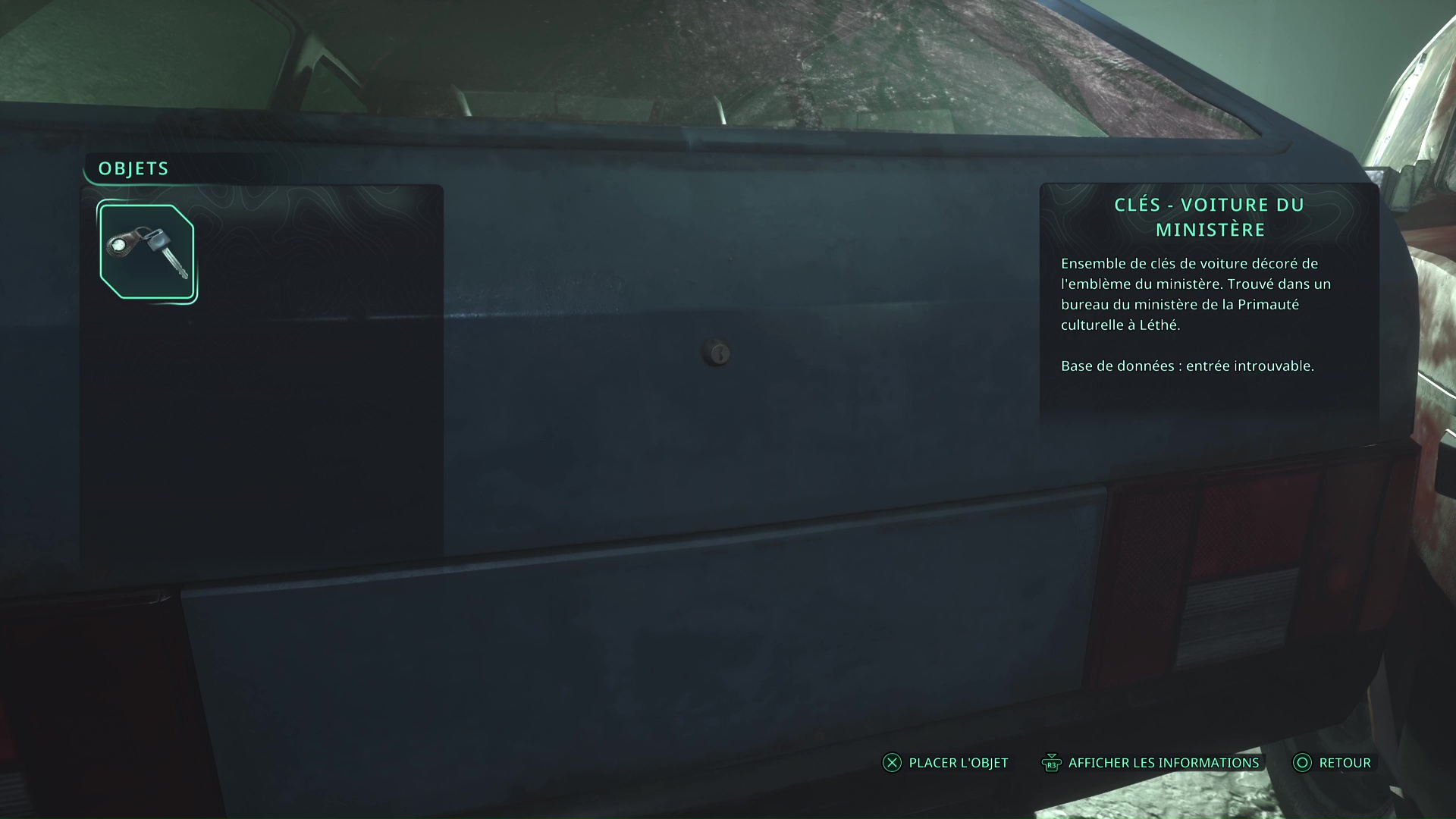 Avec ces clés, retournez tout en bas du parking, là où vous avez récupéré le Badge – Ministère, et approchez de la voiture bleue à gauche de l’ambulance. Ouvrez le coffre grâce aux Clés – Voiture du ministère pour obtenir le Bâton Lymbique – Extase, X.