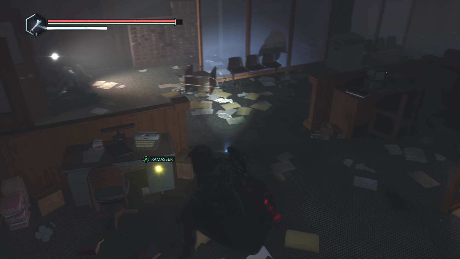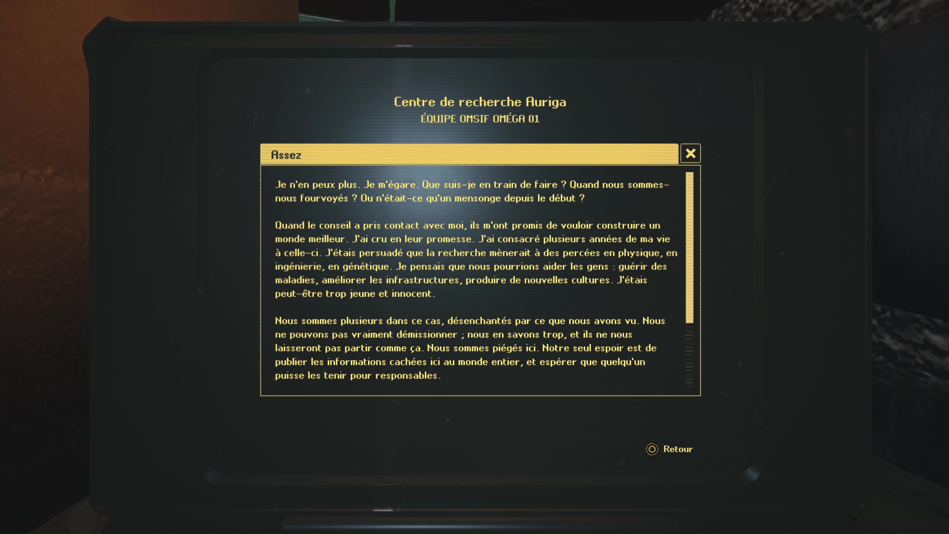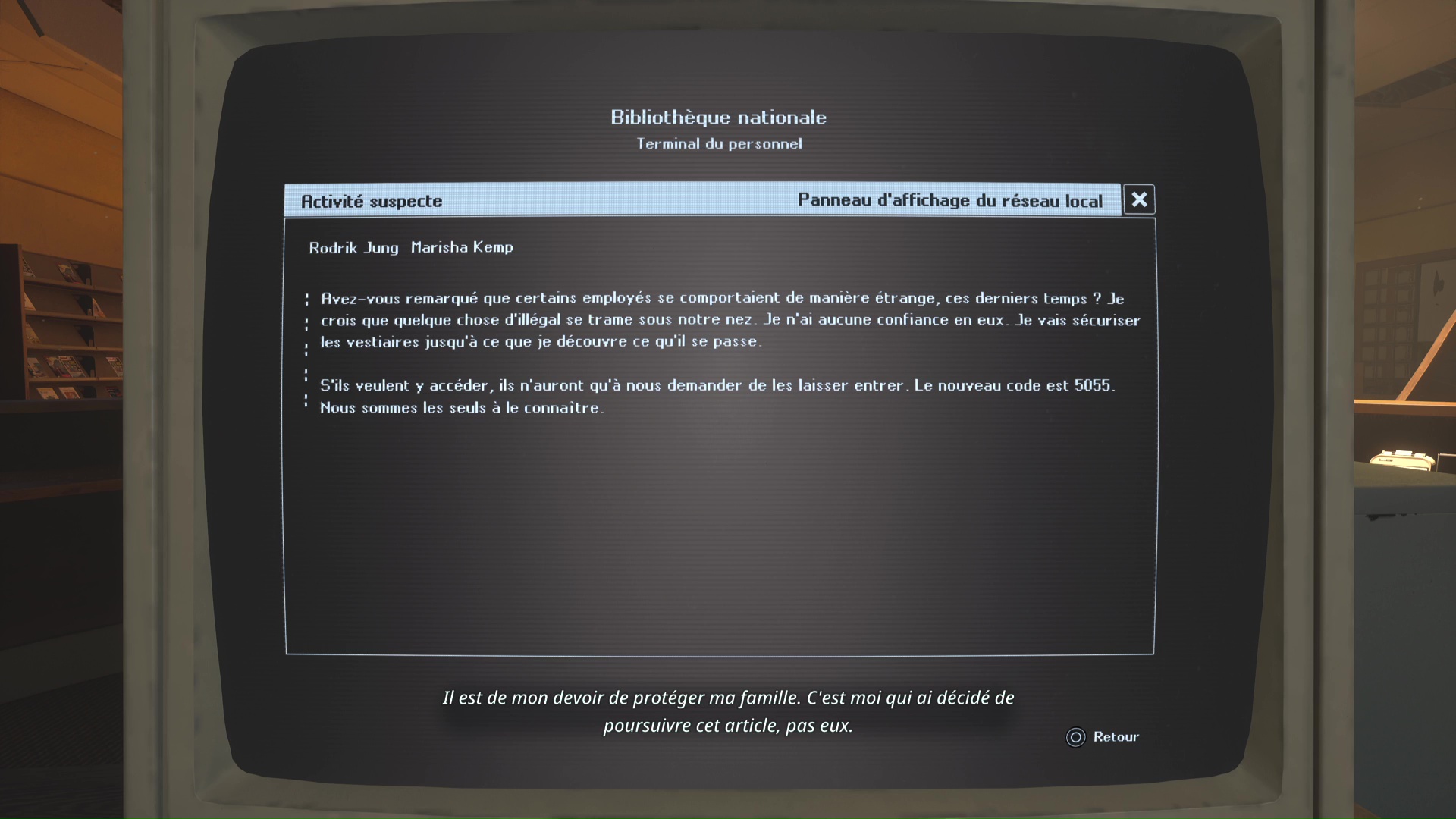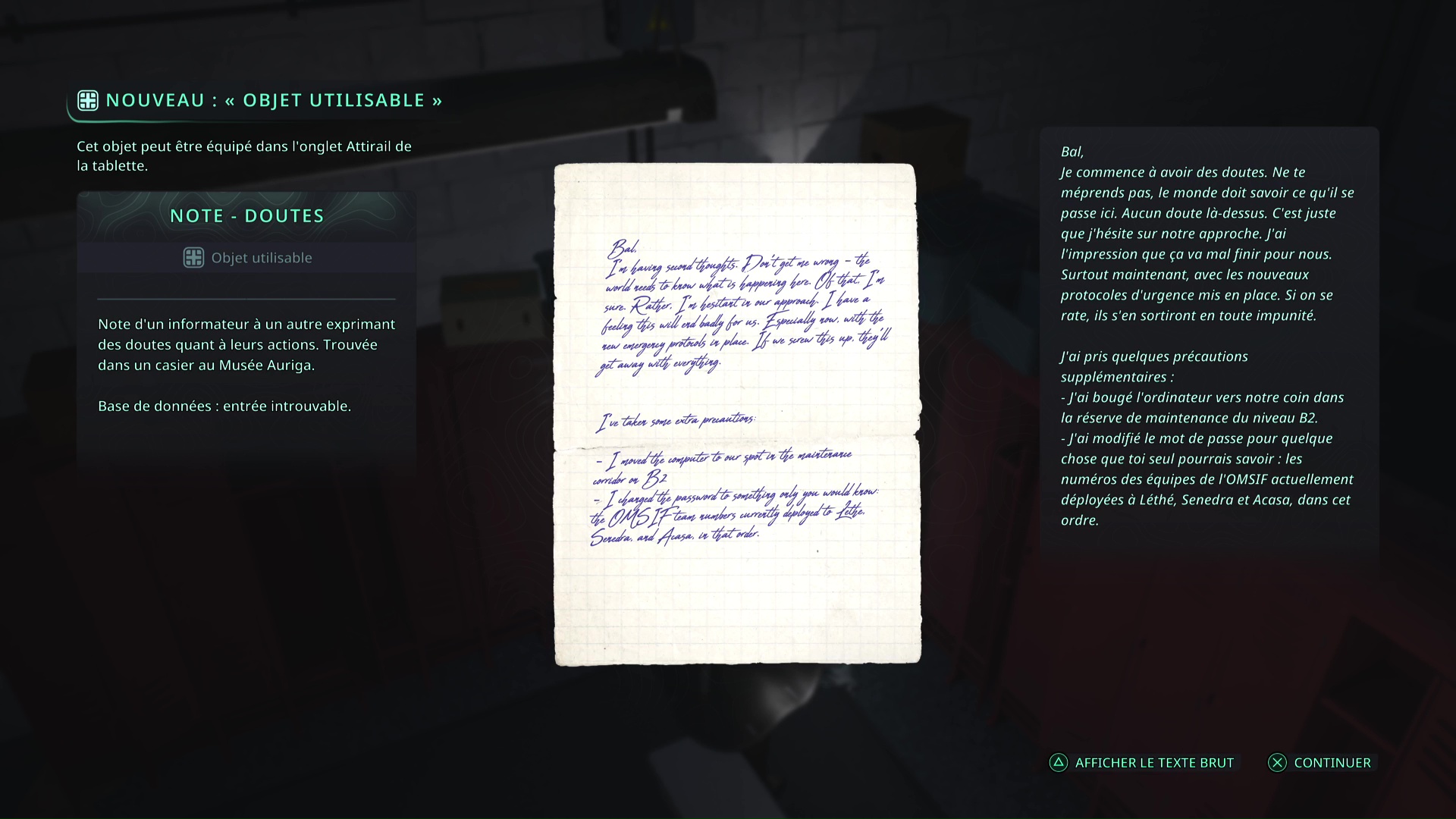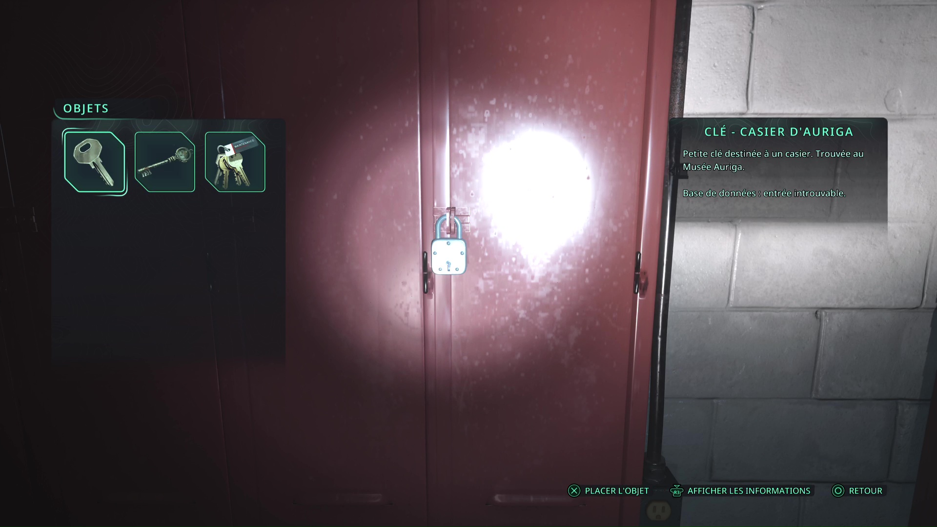 Revenez au début de l’étage, dans une salle où il y a des casiers rouges. Déverrouillez celui qui est fermé en insérant la clé. Vous y êtes : vous avez récupéré la Note – Doutes.