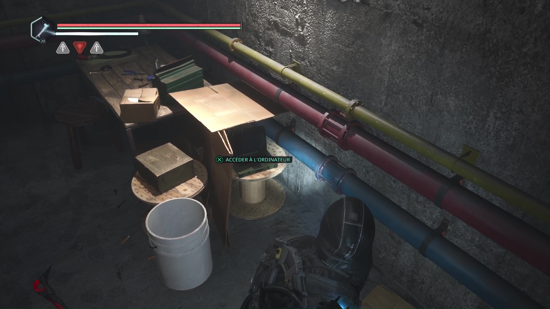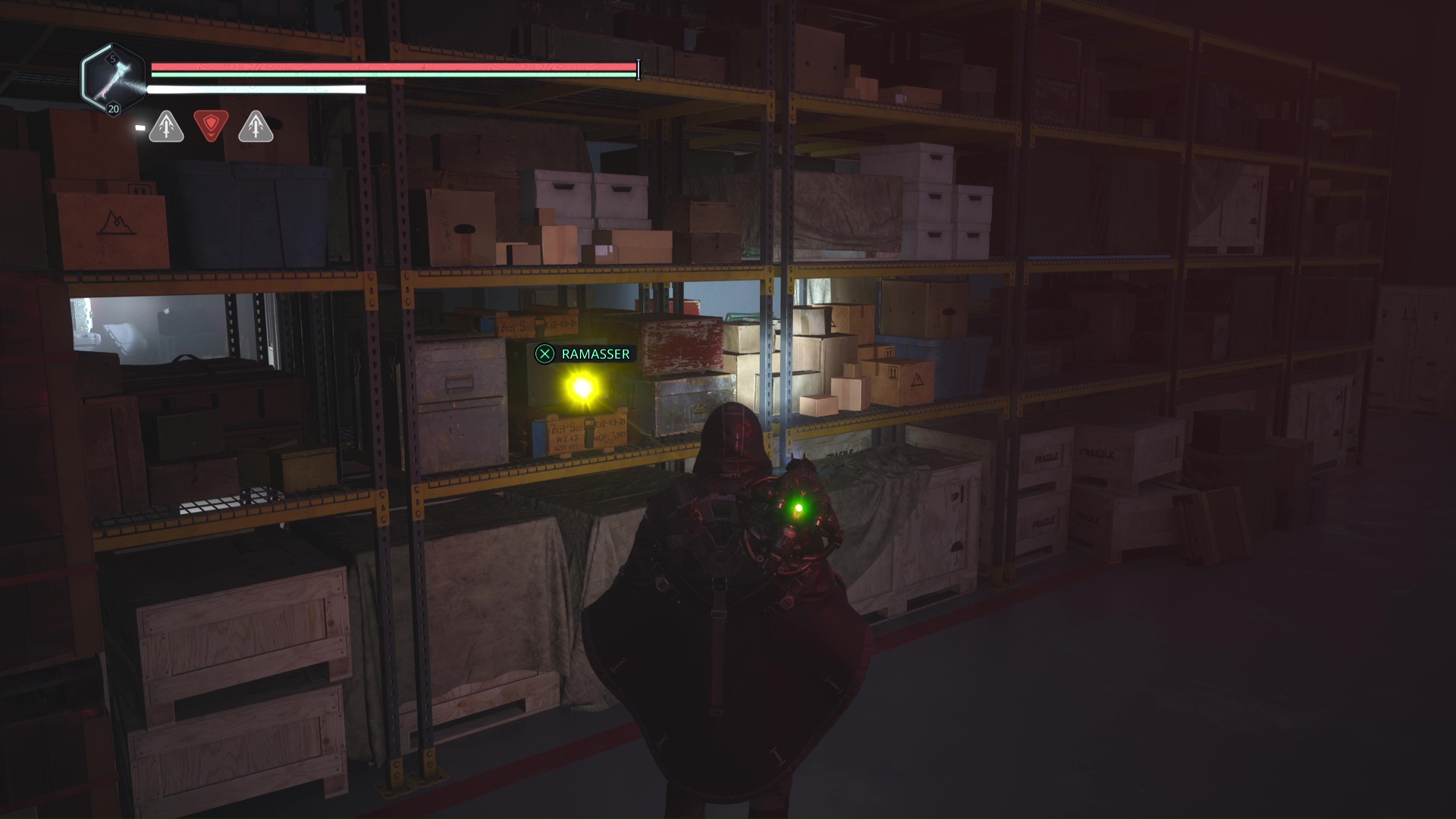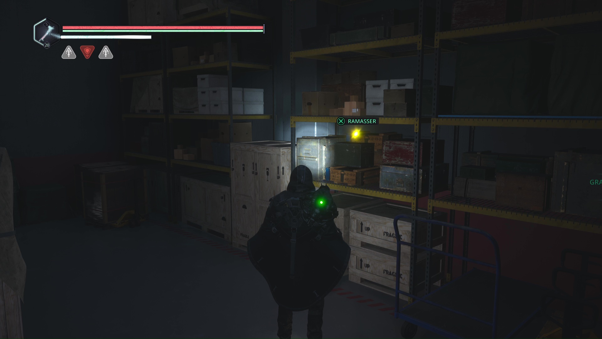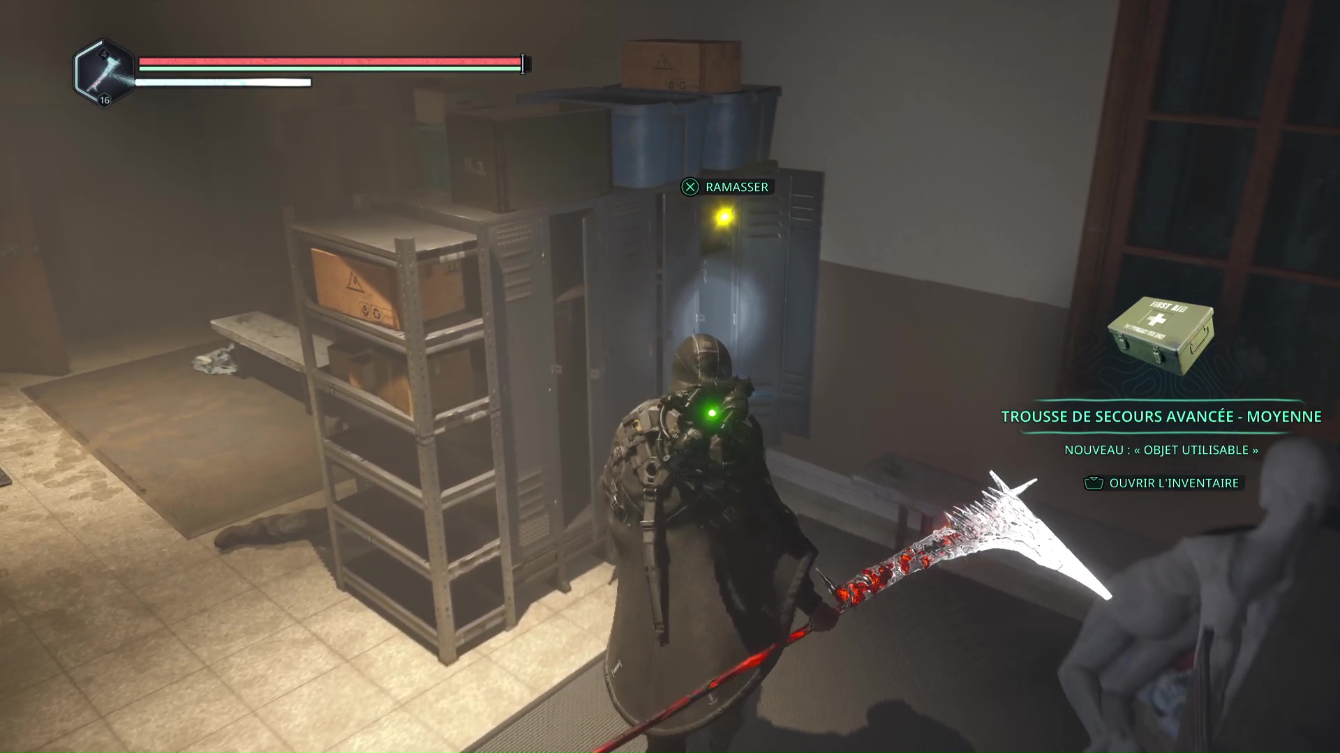 Rendez-vous au point de sauvegarde à l’étage B2. Franchissez ensuite la petite passerelle et allez sur la gauche pour passer à travers une double porte rouge (le levier rouge de maintenance doit donc être activé). Ouvrez ensuite la porte verrouillée en face grâce aux Clés – Entretien et avancez jusqu’à une table avec des cartons juste à côté.