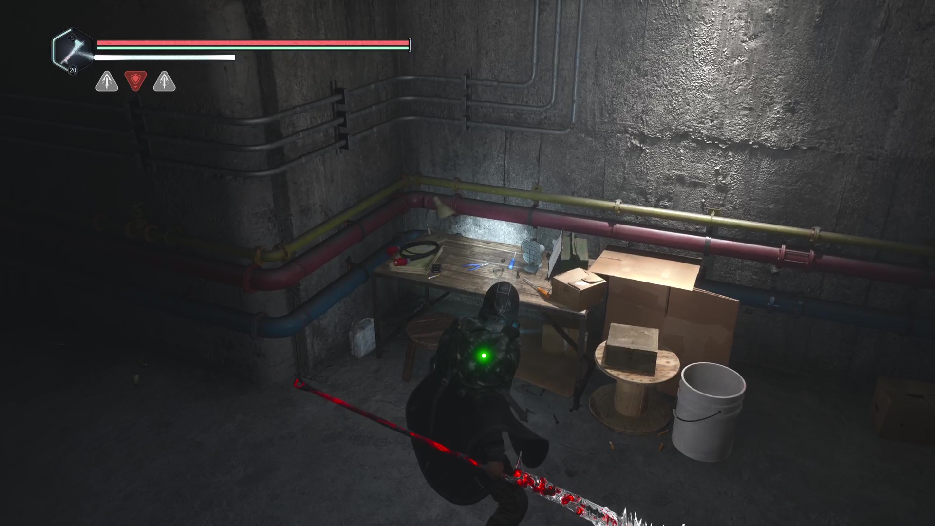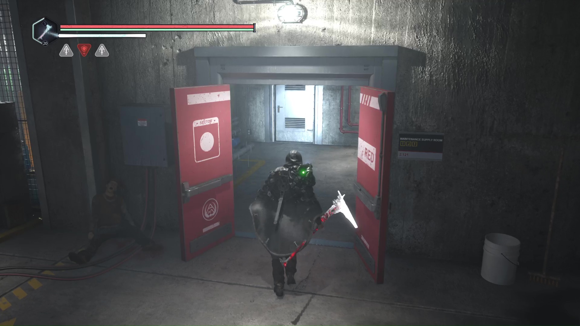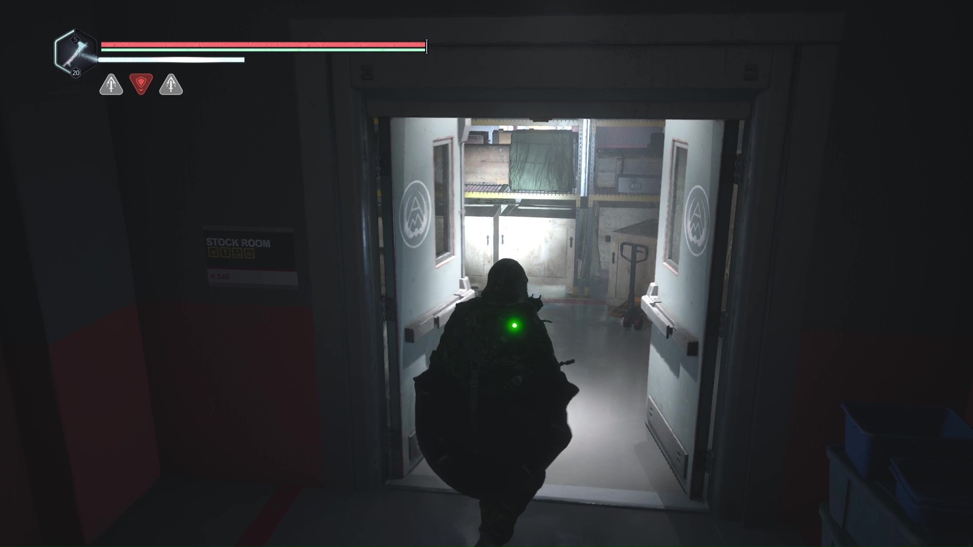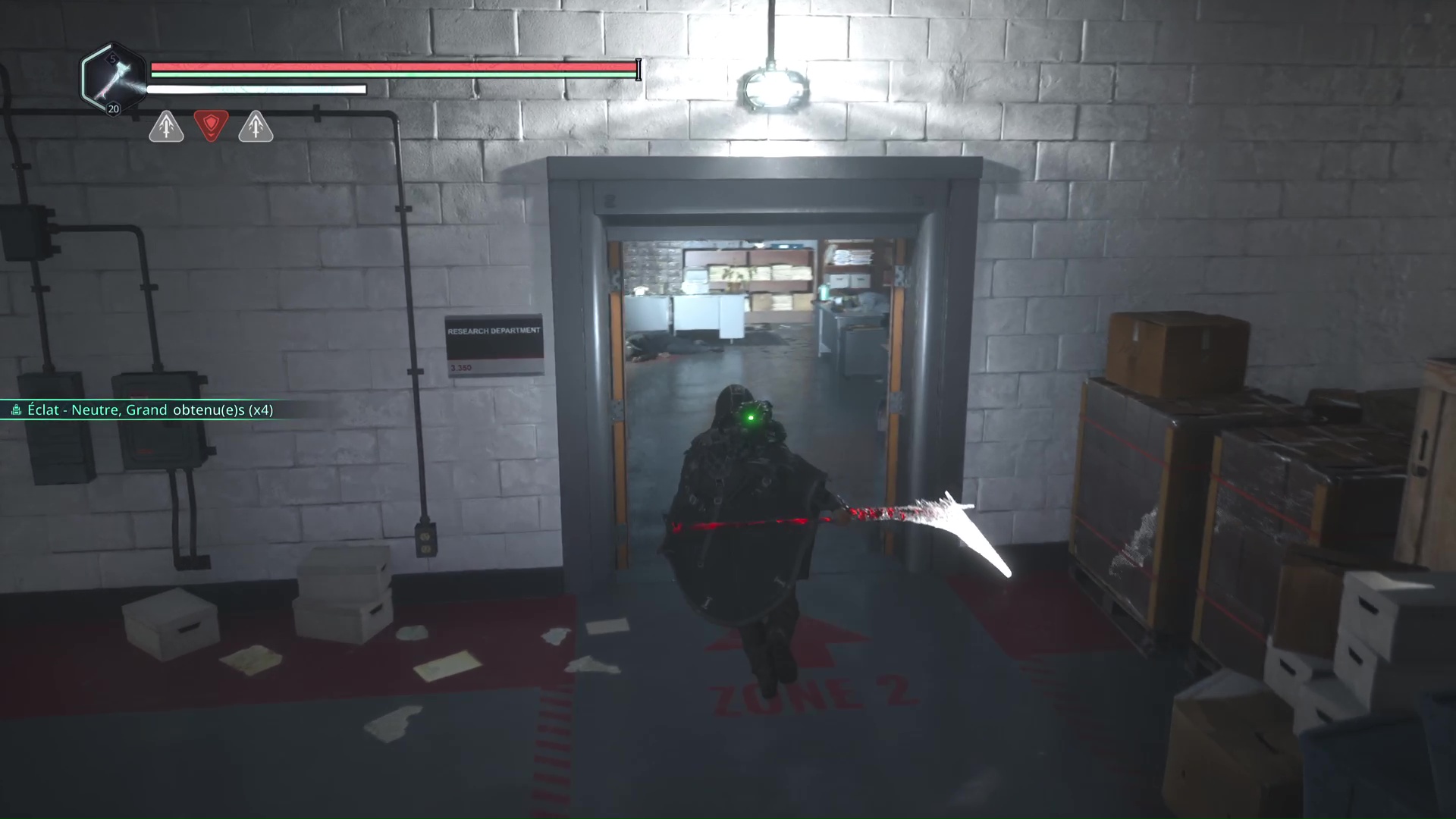 Rendez-vous au point de sauvegarde à l’étage B2. Franchissez ensuite la petite passerelle et allez sur la gauche pour passer à travers une double porte rouge (le levier rouge de maintenance doit donc être activé). Ouvrez ensuite la porte verrouillée en face grâce aux Clés – Entretien et avancez jusqu’à une table avec des cartons juste à côté.