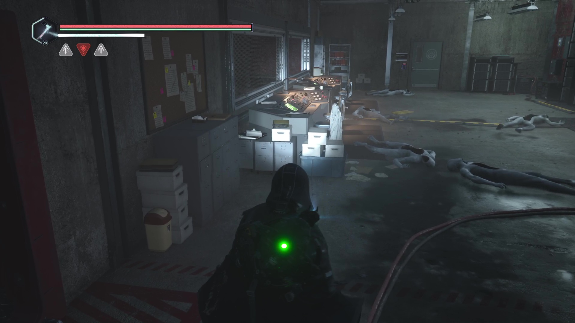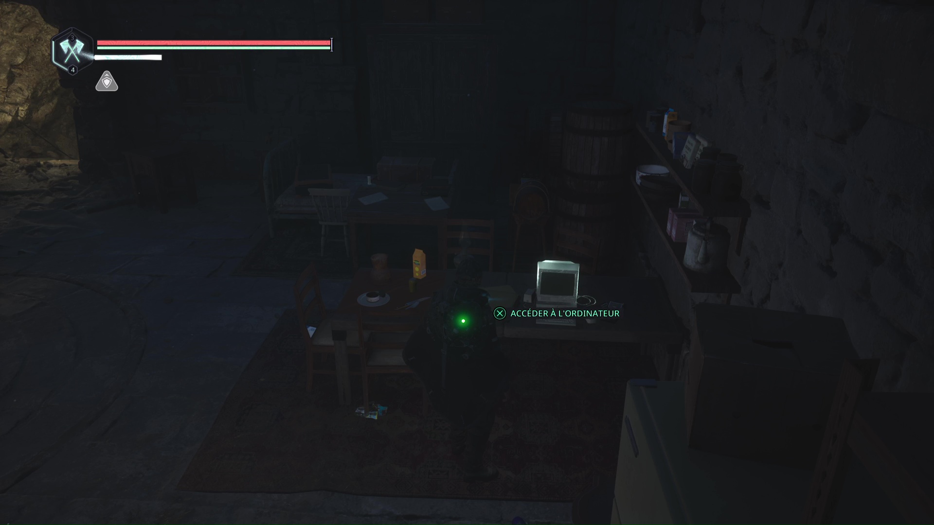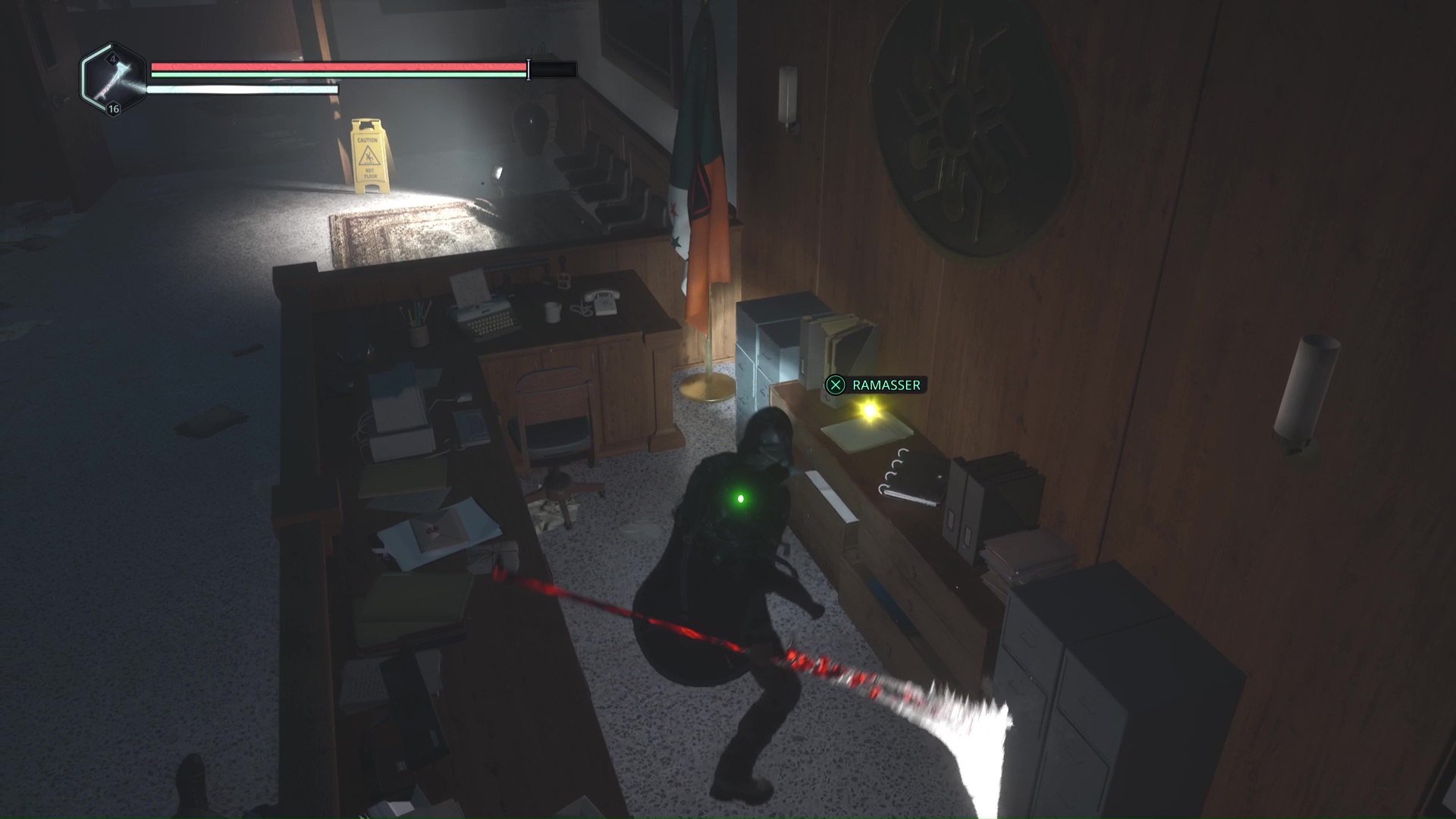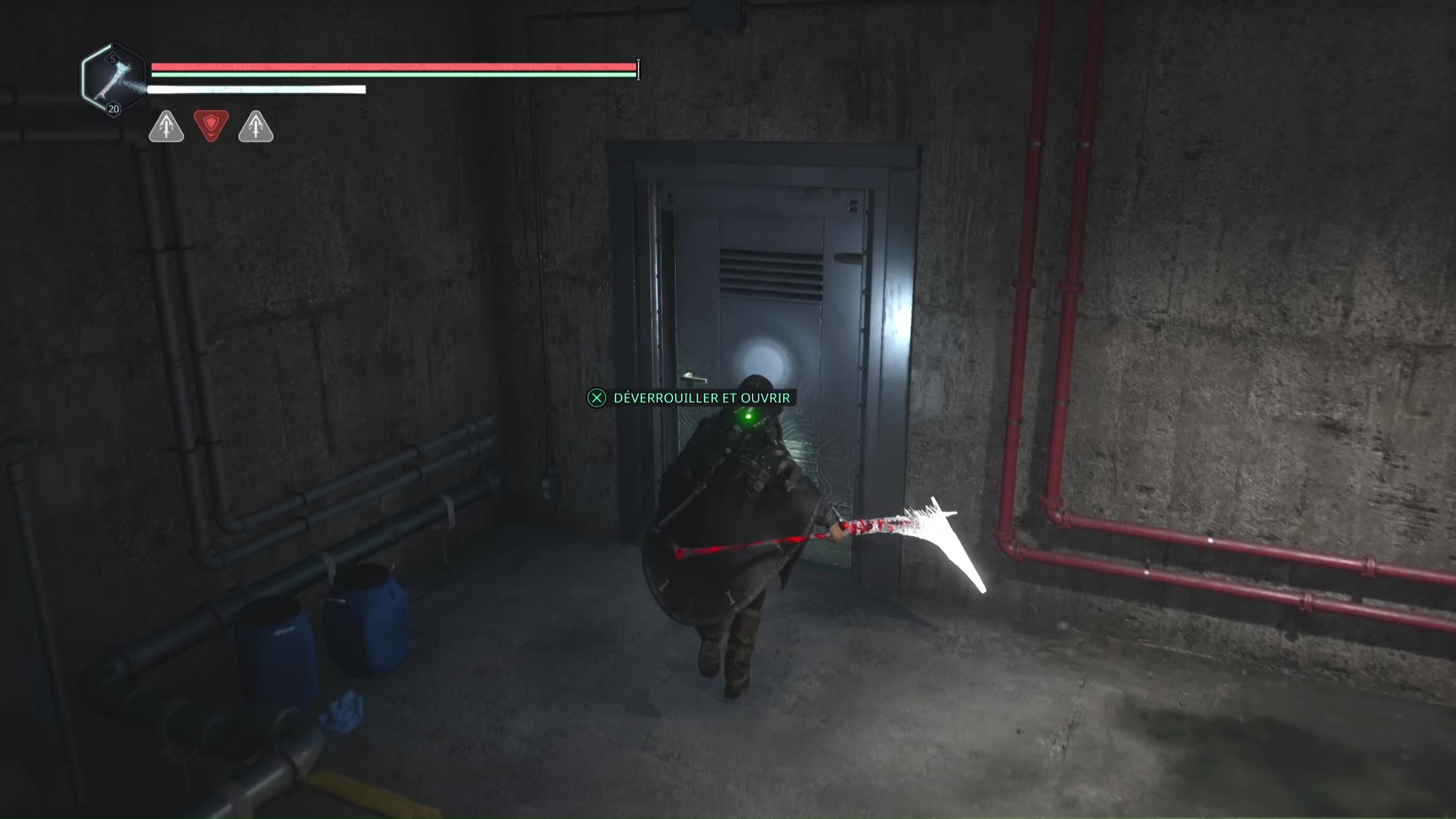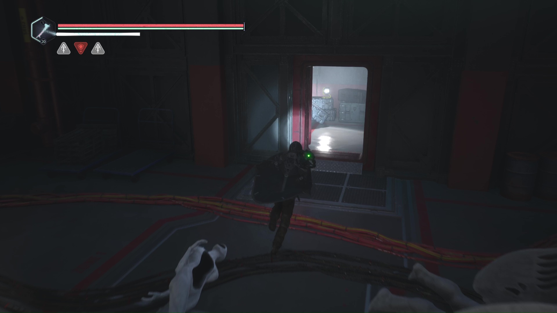 Rendez-vous au point de sauvegarde à l’étage B2. Franchissez ensuite la petite passerelle et allez sur la gauche pour passer à travers une double porte rouge (le levier rouge de maintenance doit donc être activé). Ouvrez ensuite la porte verrouillée en face grâce aux Clés – Entretien et avancez jusqu’à une table avec des cartons juste à côté.