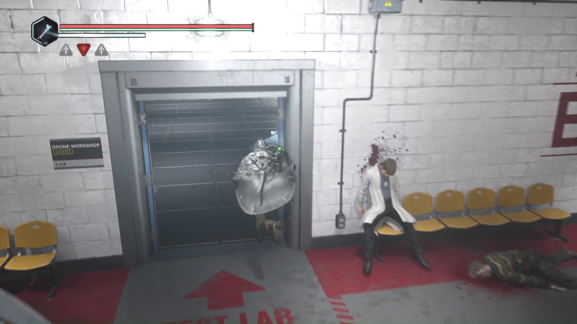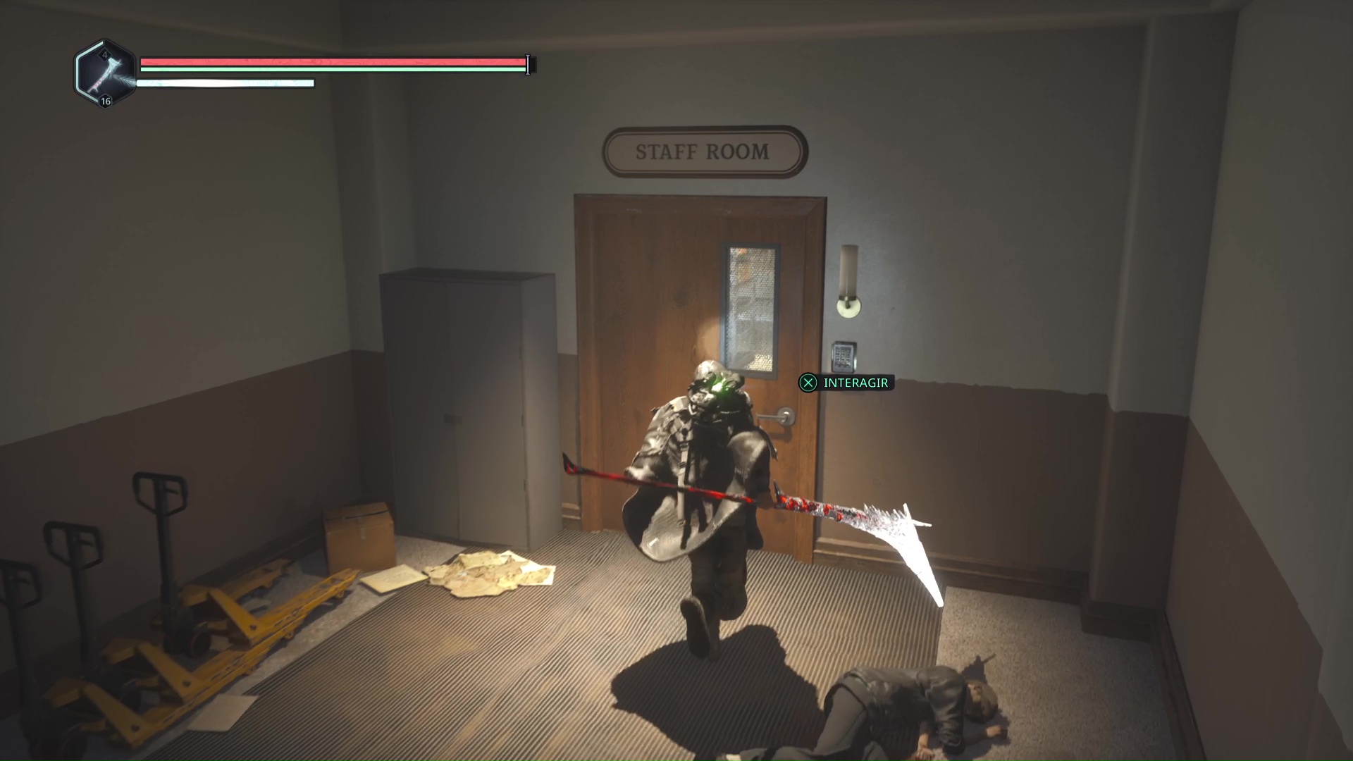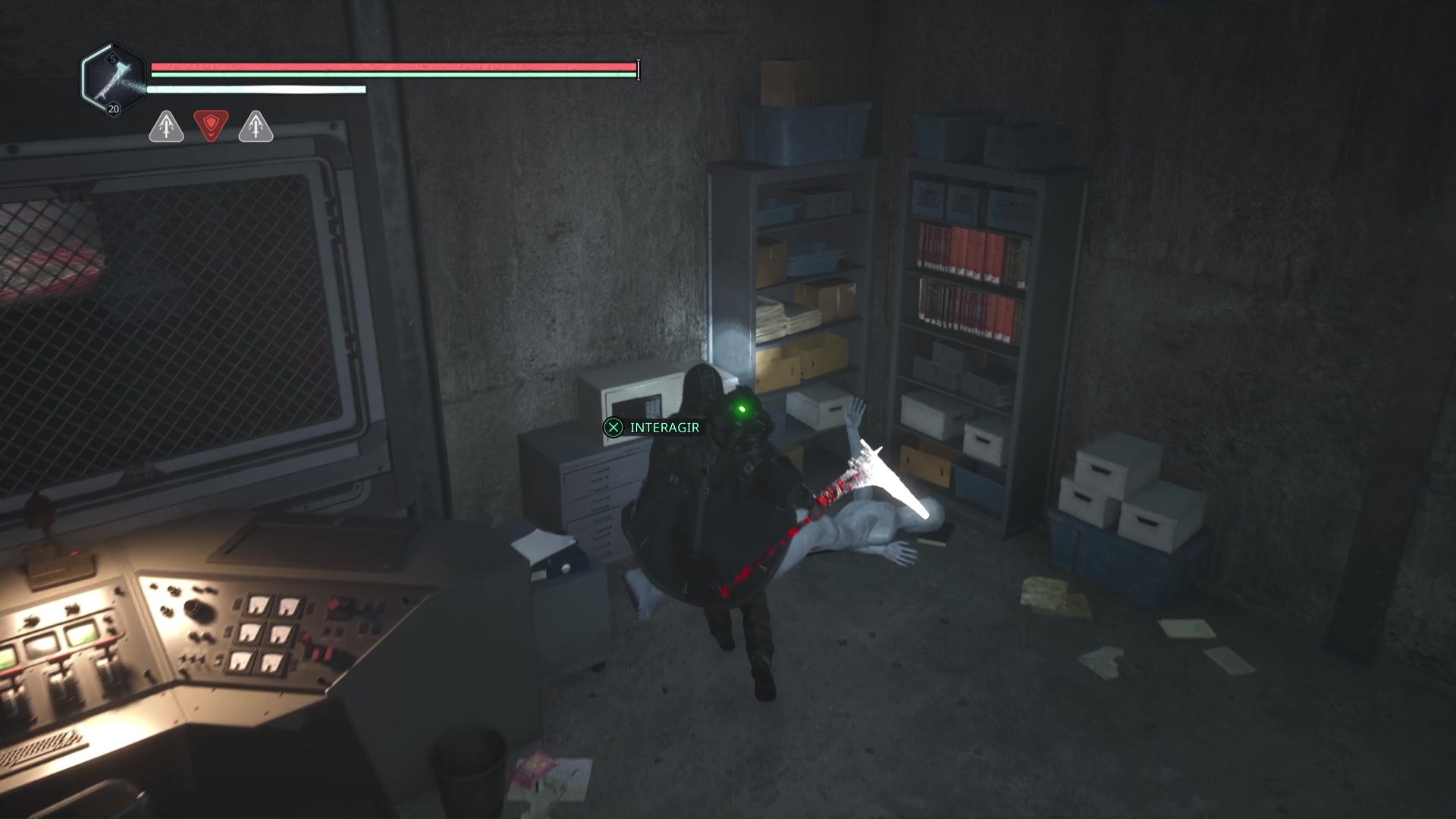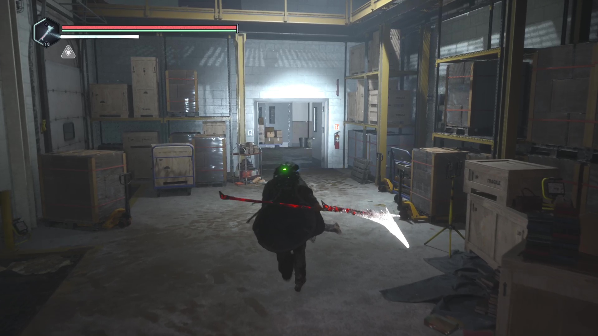 Rendez-vous au point de sauvegarde à l’étage B2. Franchissez ensuite la petite passerelle et allez sur la gauche pour passer à travers une double porte rouge (le levier rouge de maintenance doit donc être activé). Ouvrez ensuite la porte verrouillée en face grâce aux Clés – Entretien et avancez jusqu’à une table avec des cartons juste à côté.