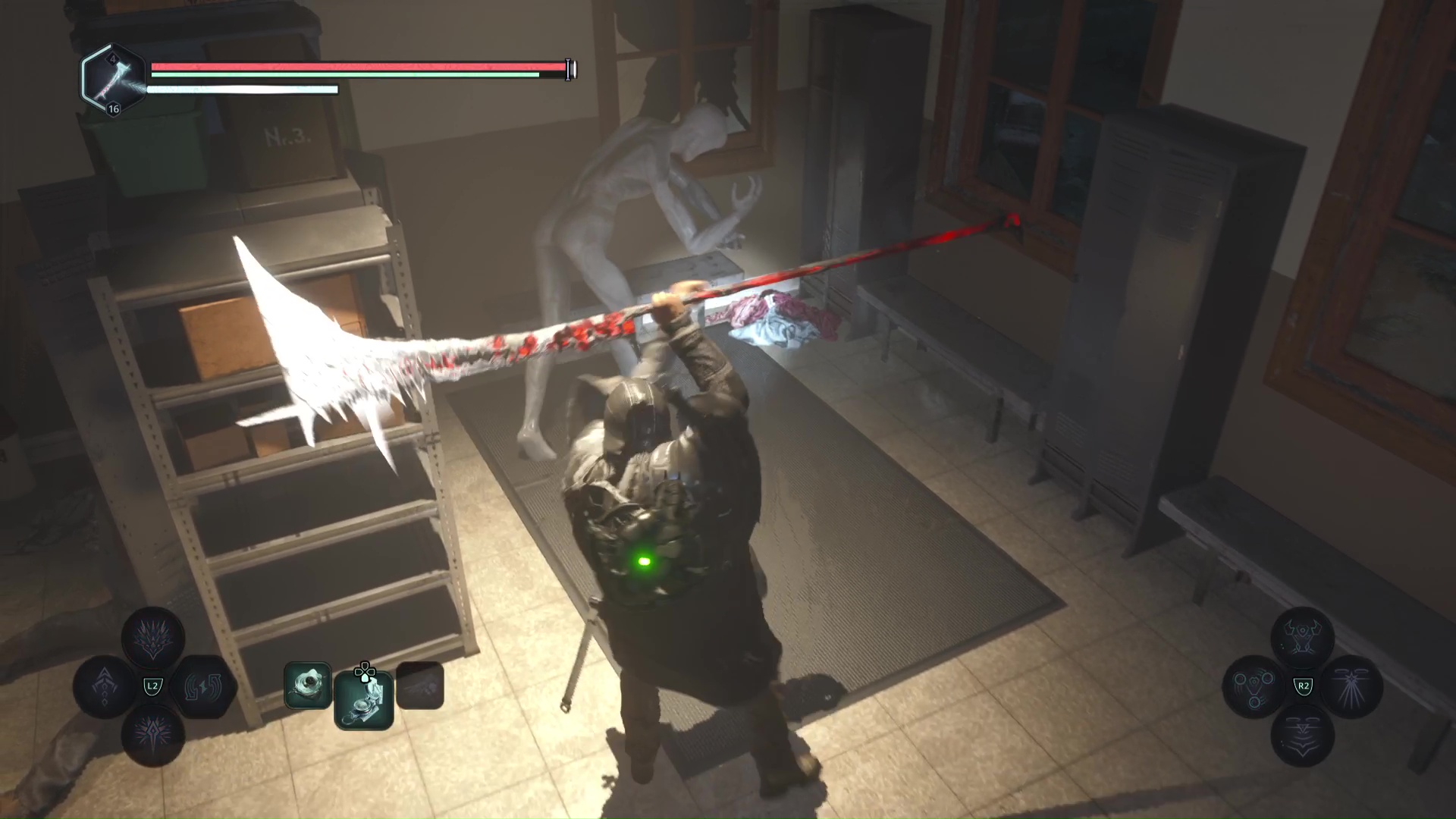 La seule entrée mentionne l’accès aux vestiaires. Sortez de la pièce, allez à l’étage et présentez-vous devant les vestiaires puis entrez le code 5055. Eliminez les Hollow Walkers à l’intérieur.