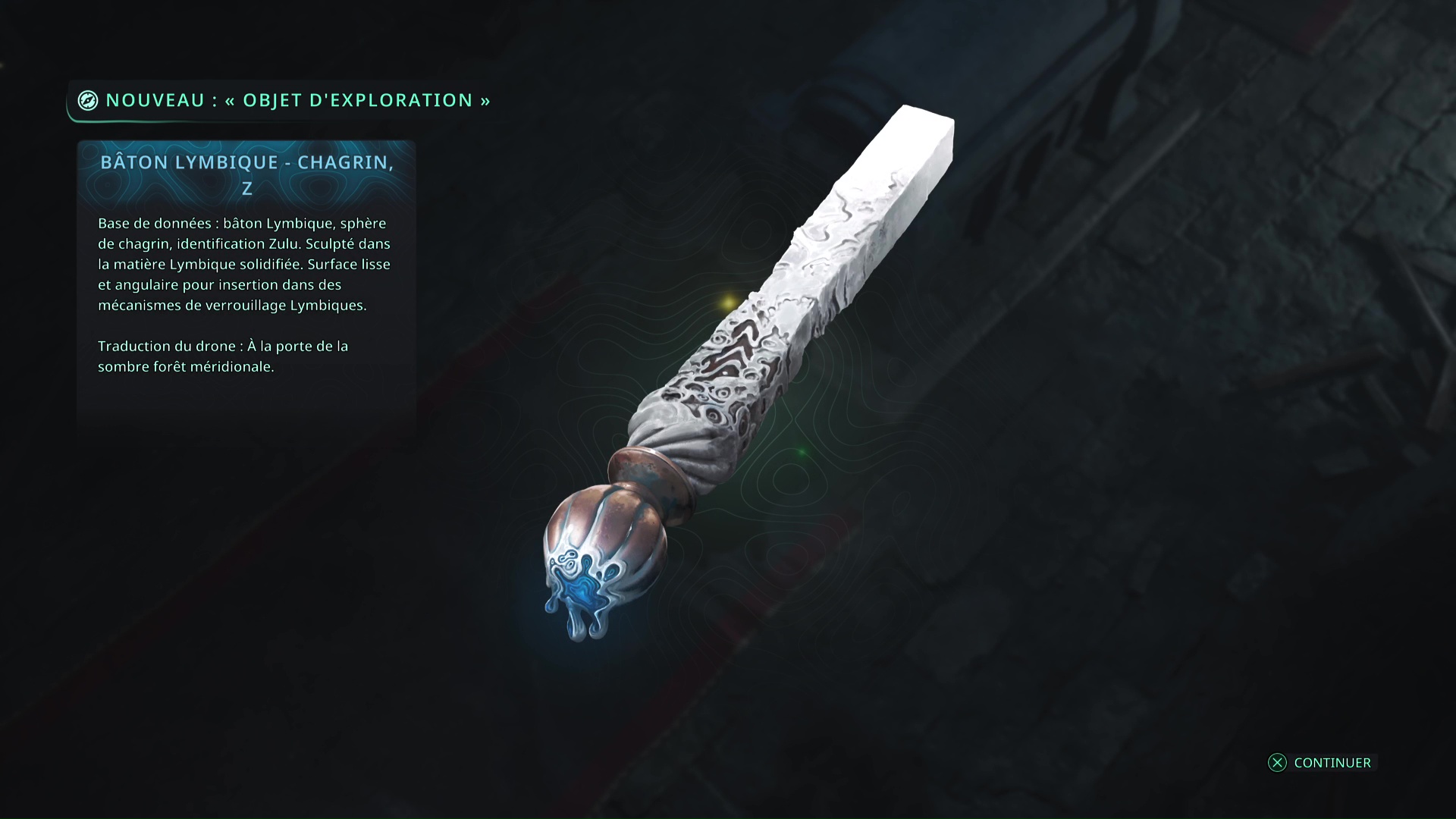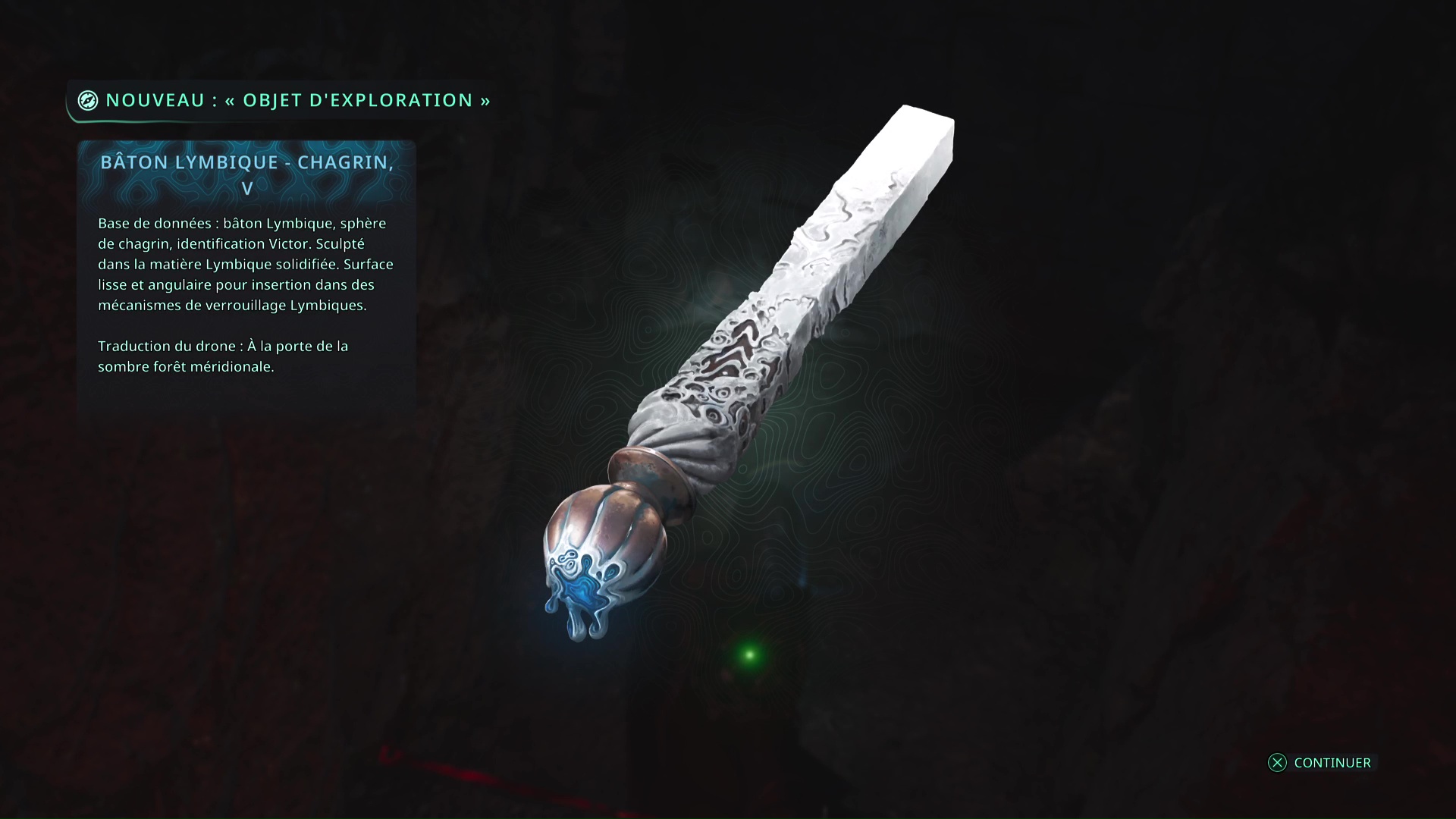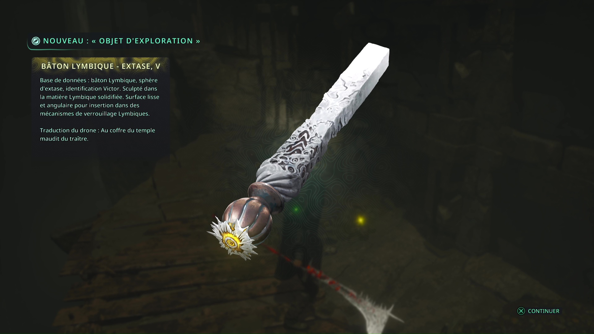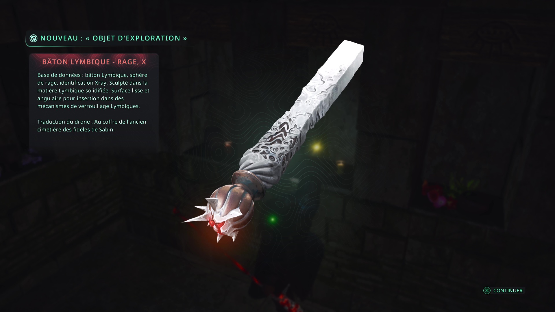 Faites quelques pas pour vous retrouver au milieu de la salle et voir un point doré brillant au-dessus de votre tête. Ramassez-le, il s’agit du Bâton Lymbique – Chagrin, X et de la Note – RHO-021.