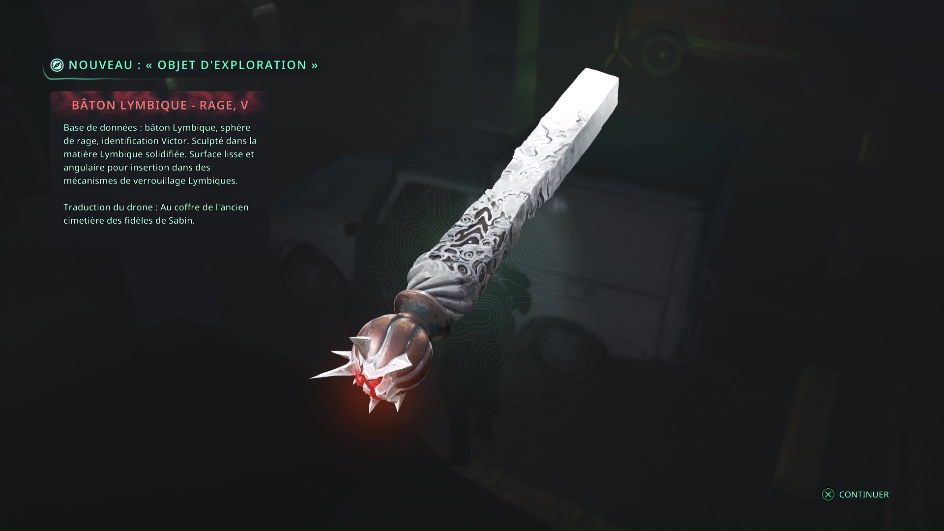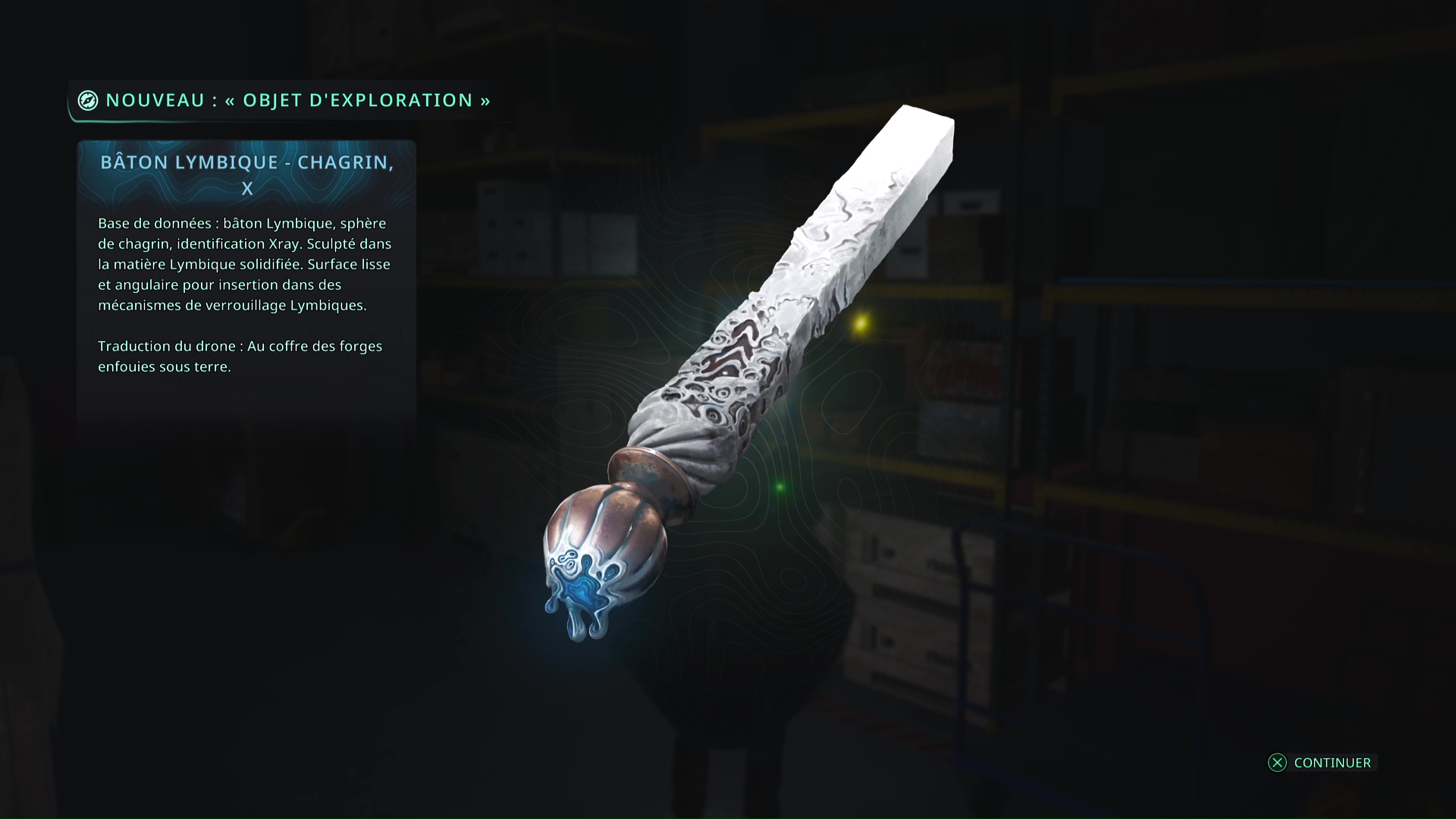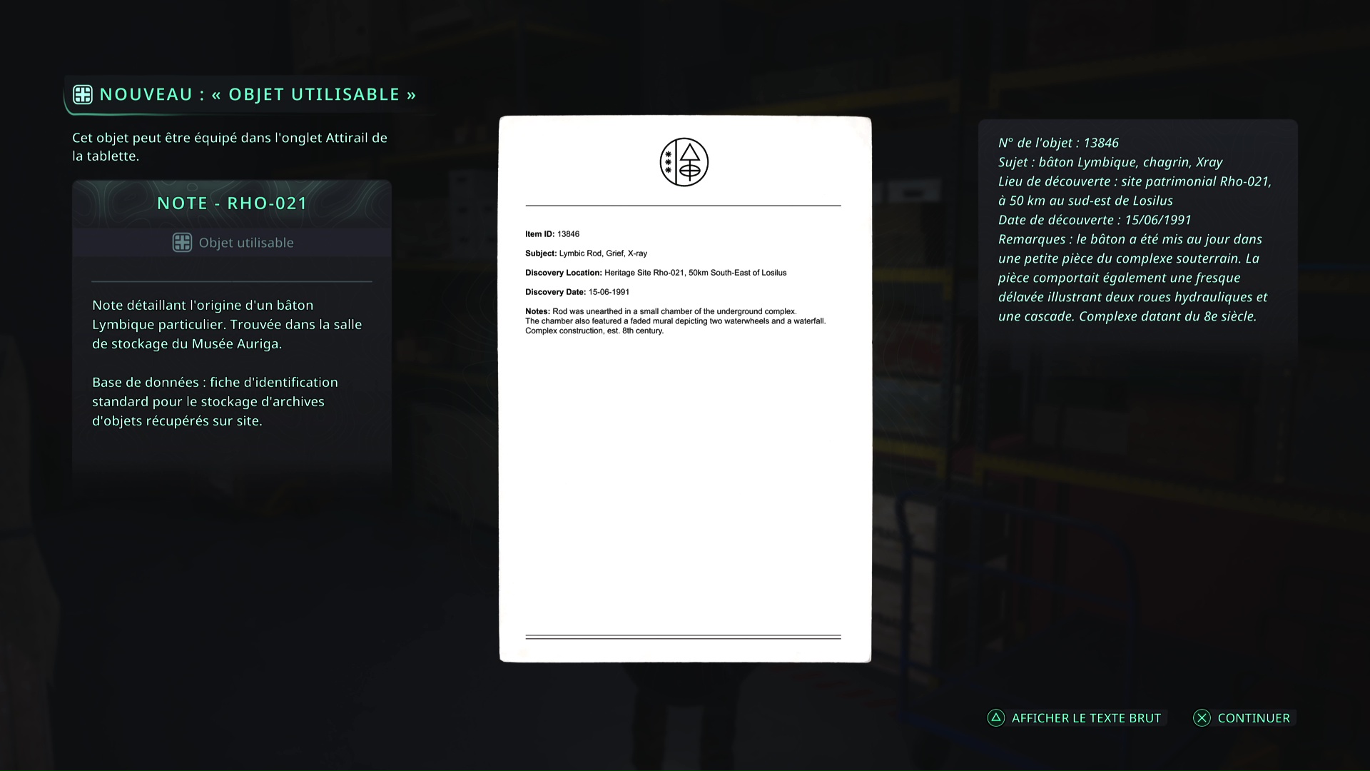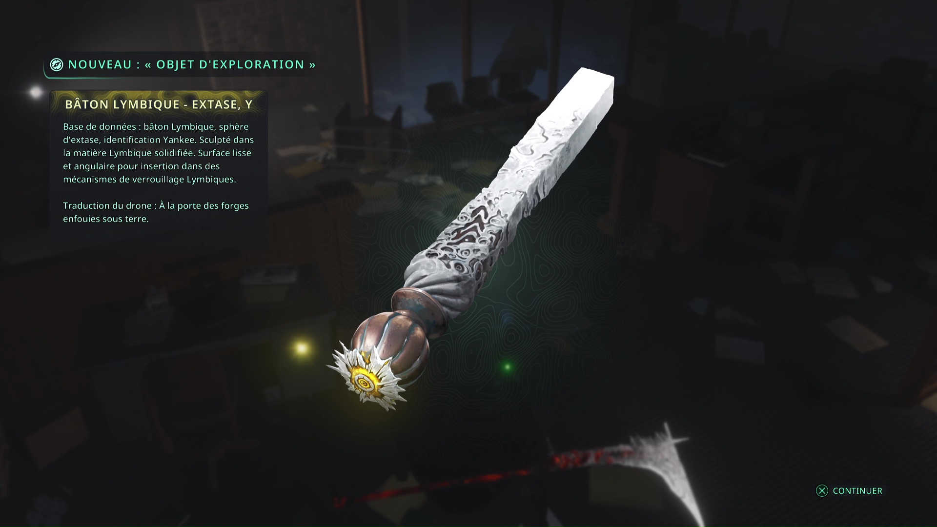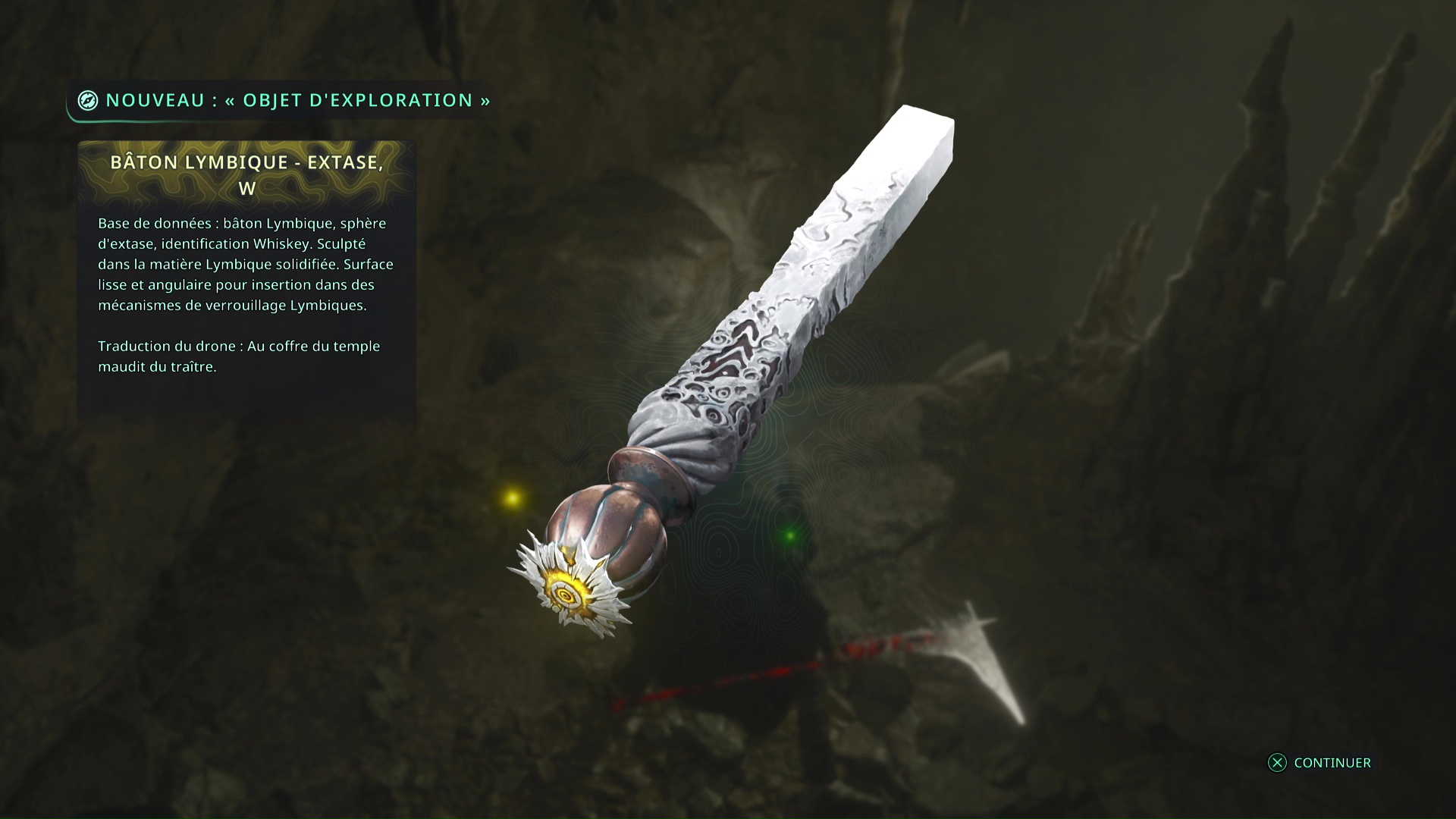 Faites quelques pas pour vous retrouver au milieu de la salle et voir un point doré brillant au-dessus de votre tête. Ramassez-le, il s’agit du Bâton Lymbique – Chagrin, X et de la Note – RHO-021.