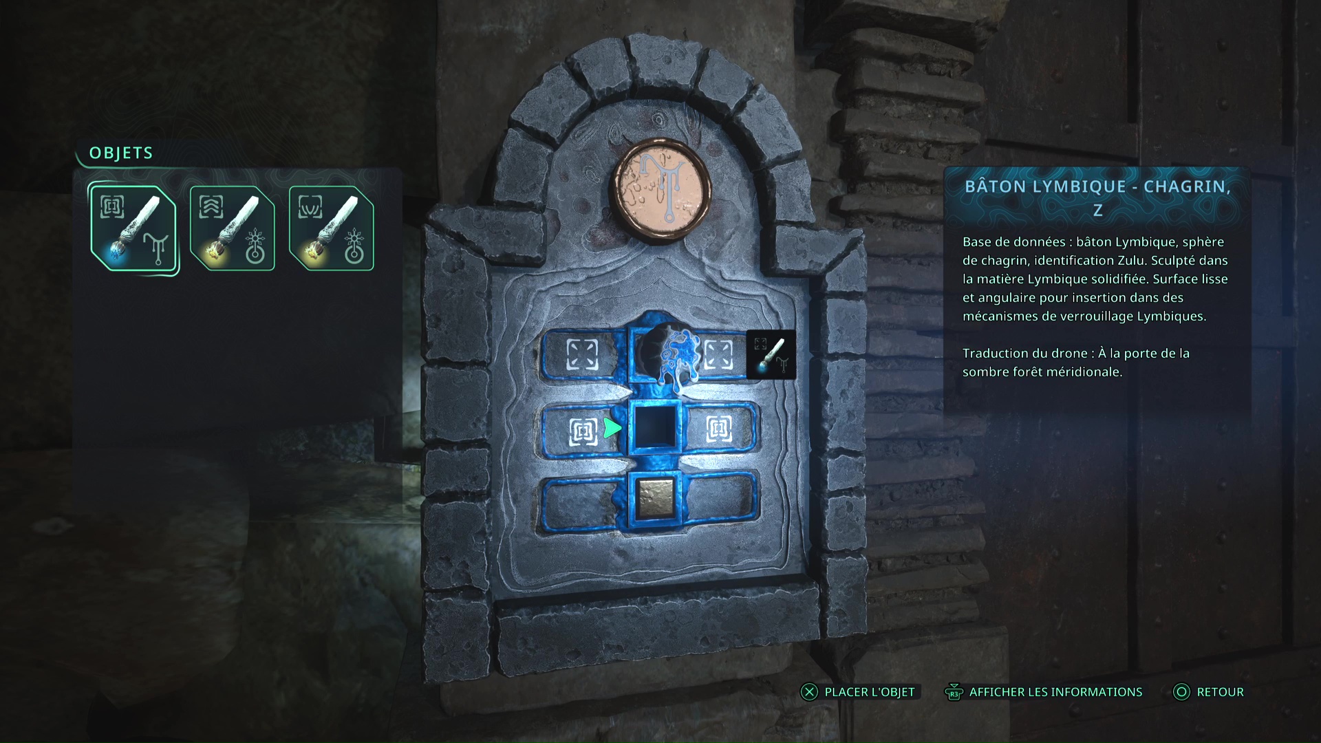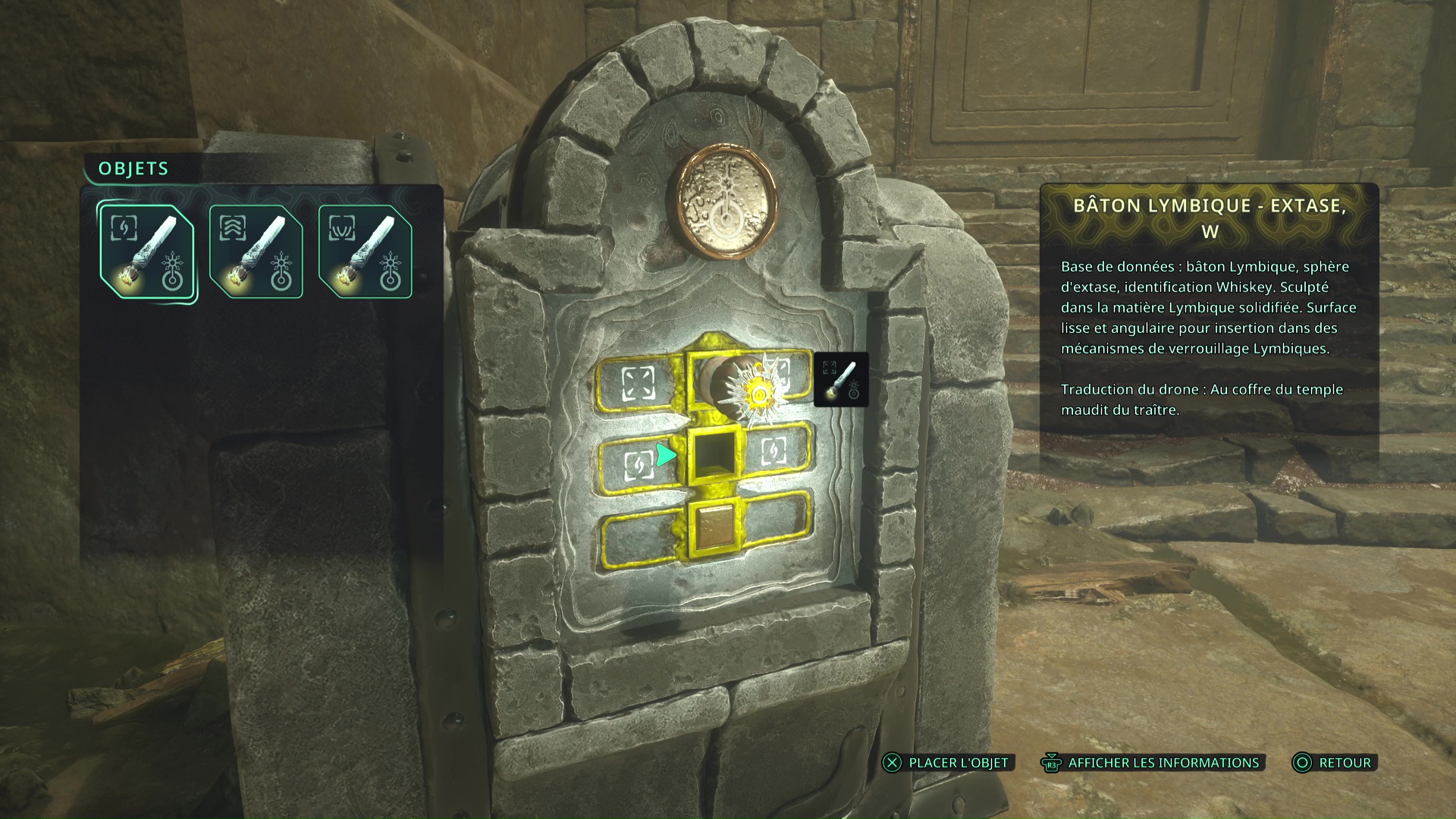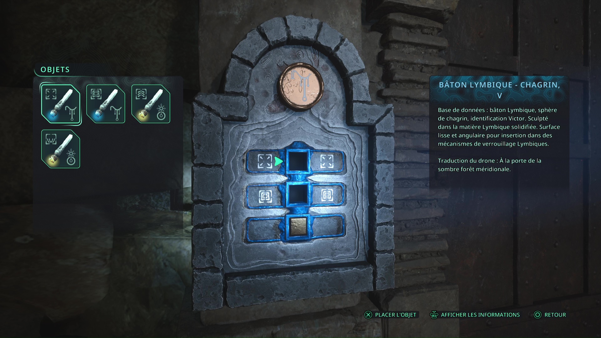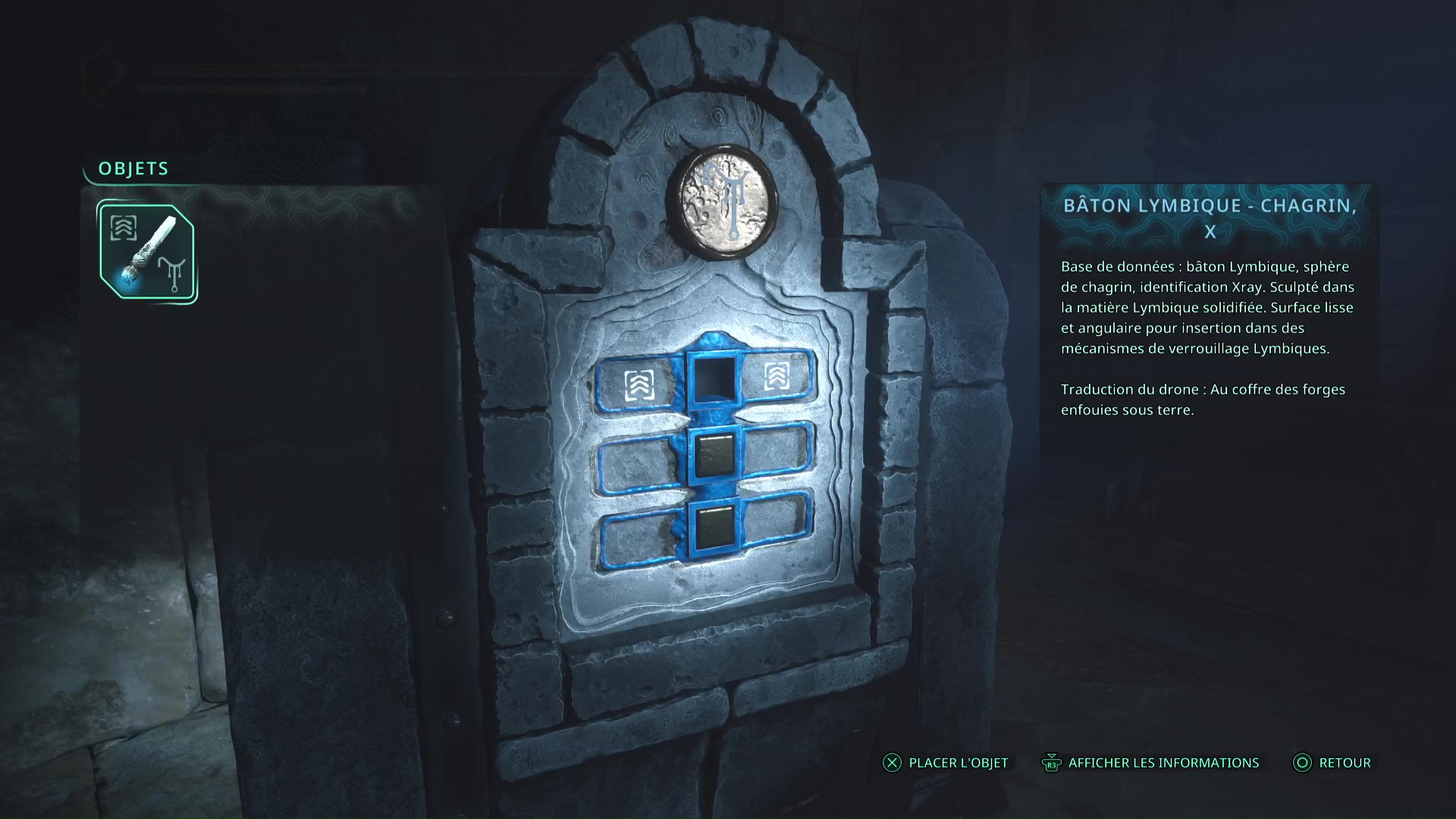 Faites quelques pas pour vous retrouver au milieu de la salle et voir un point doré brillant au-dessus de votre tête. Ramassez-le, il s’agit du Bâton Lymbique – Chagrin, X et de la Note – RHO-021.