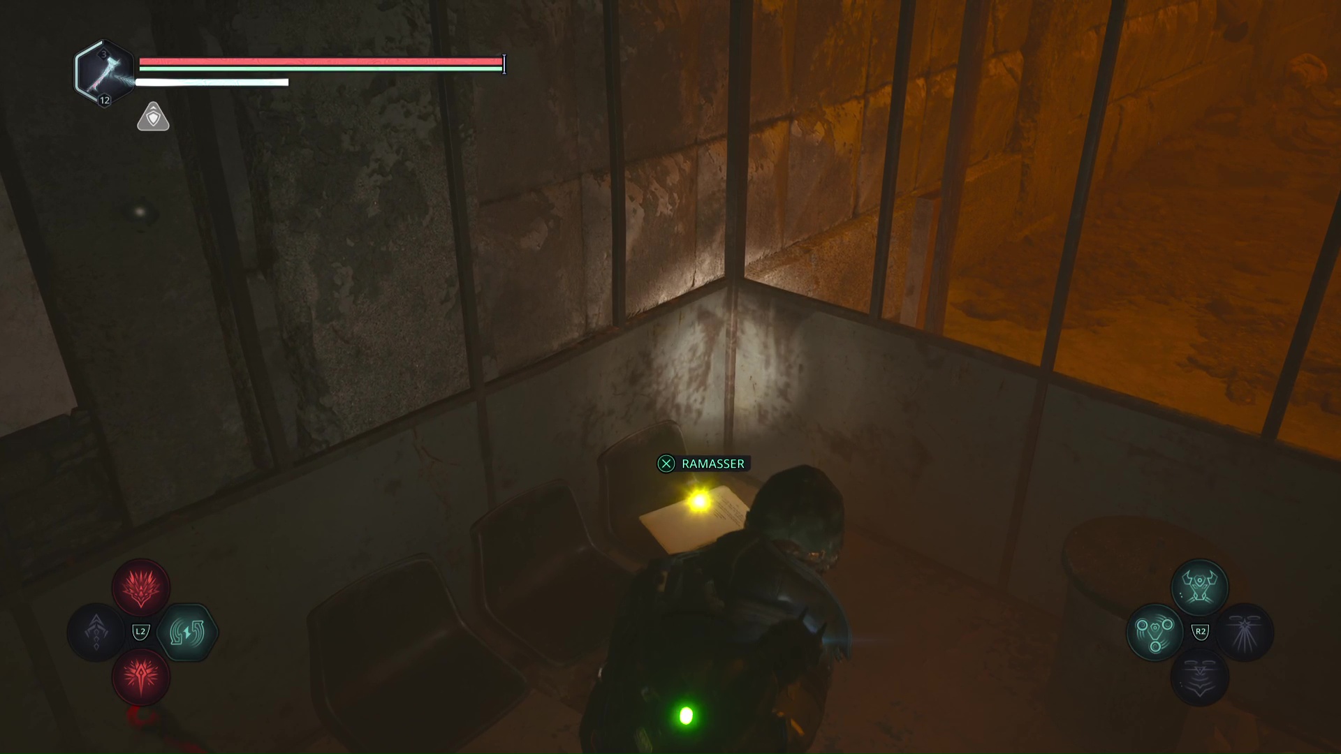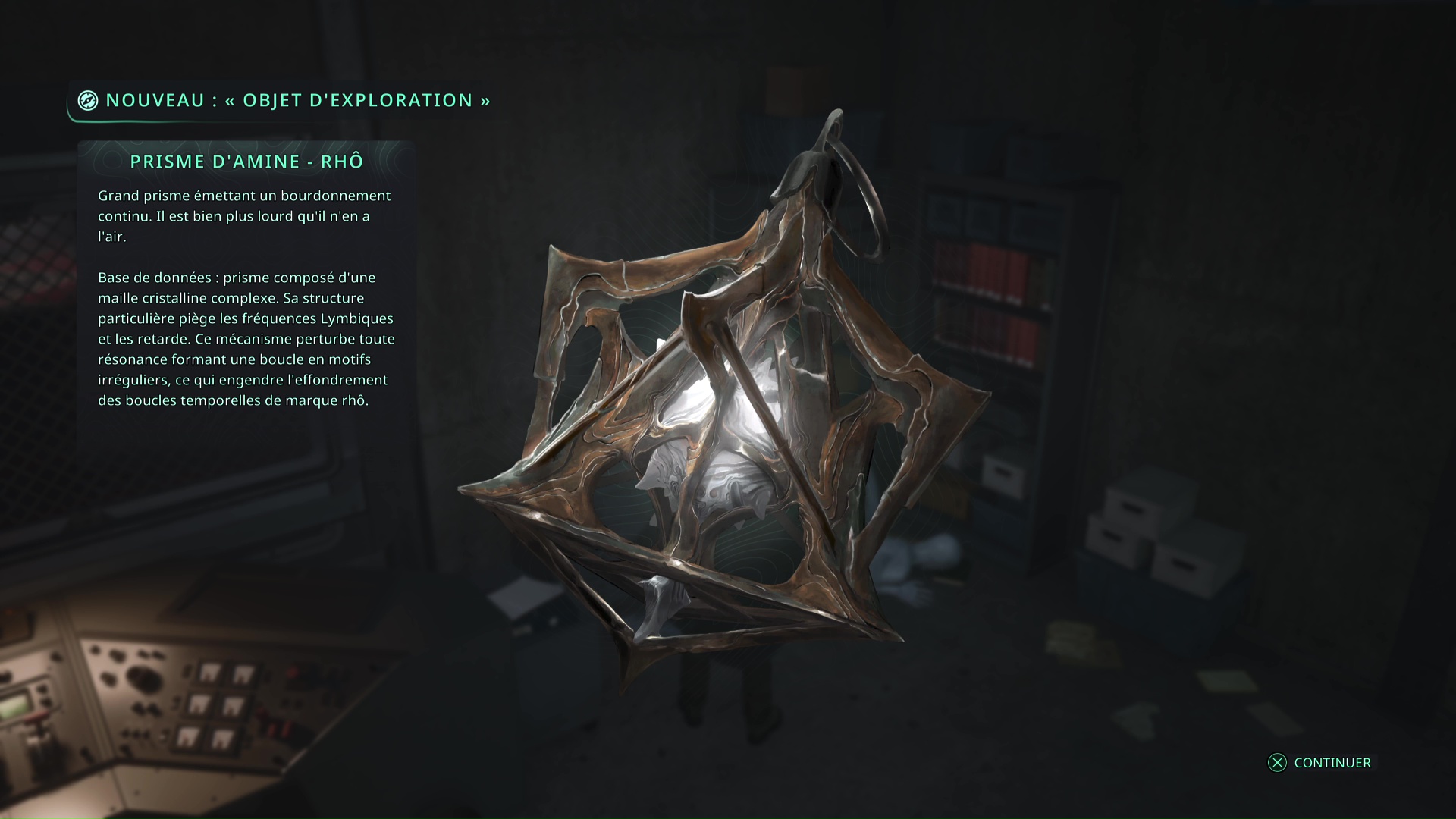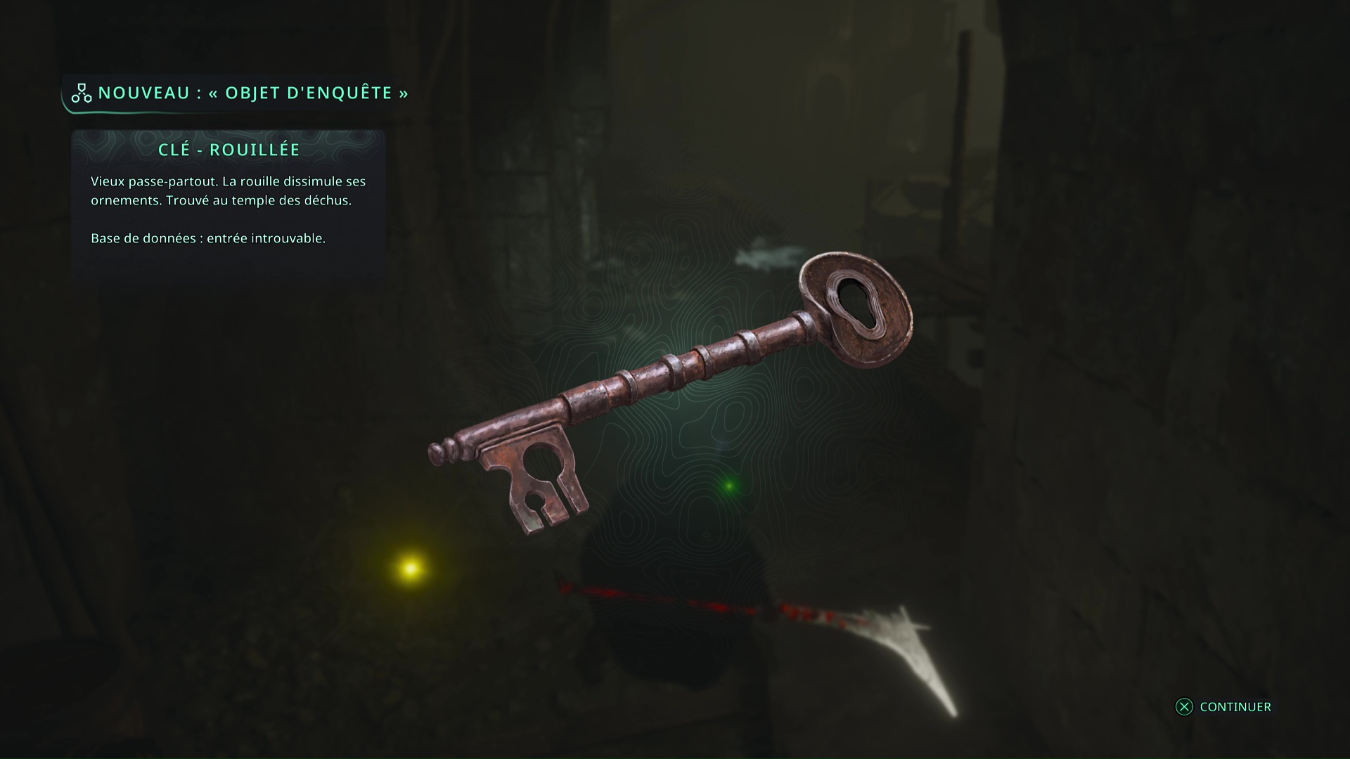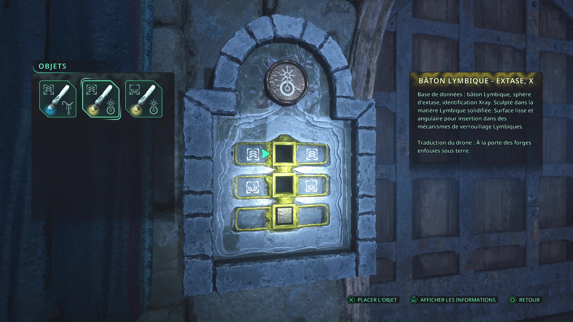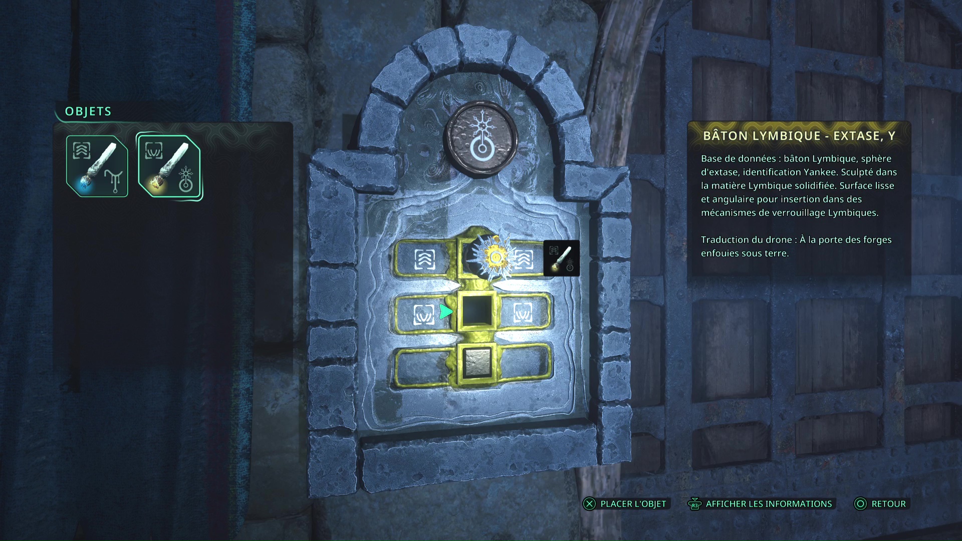Faites quelques pas pour vous retrouver au milieu de la salle et voir un point doré brillant au-dessus de votre tête. Ramassez-le, il s’agit du Bâton Lymbique – Chagrin, X et de la Note – RHO-021.