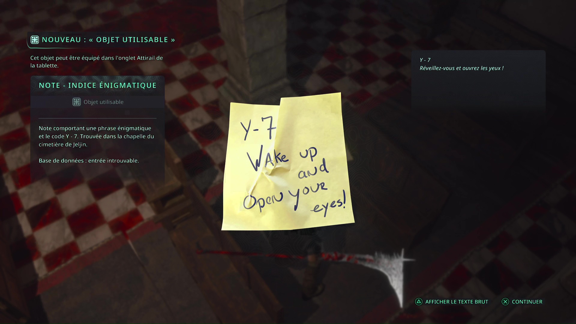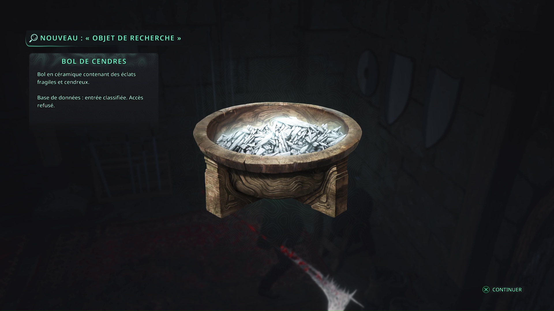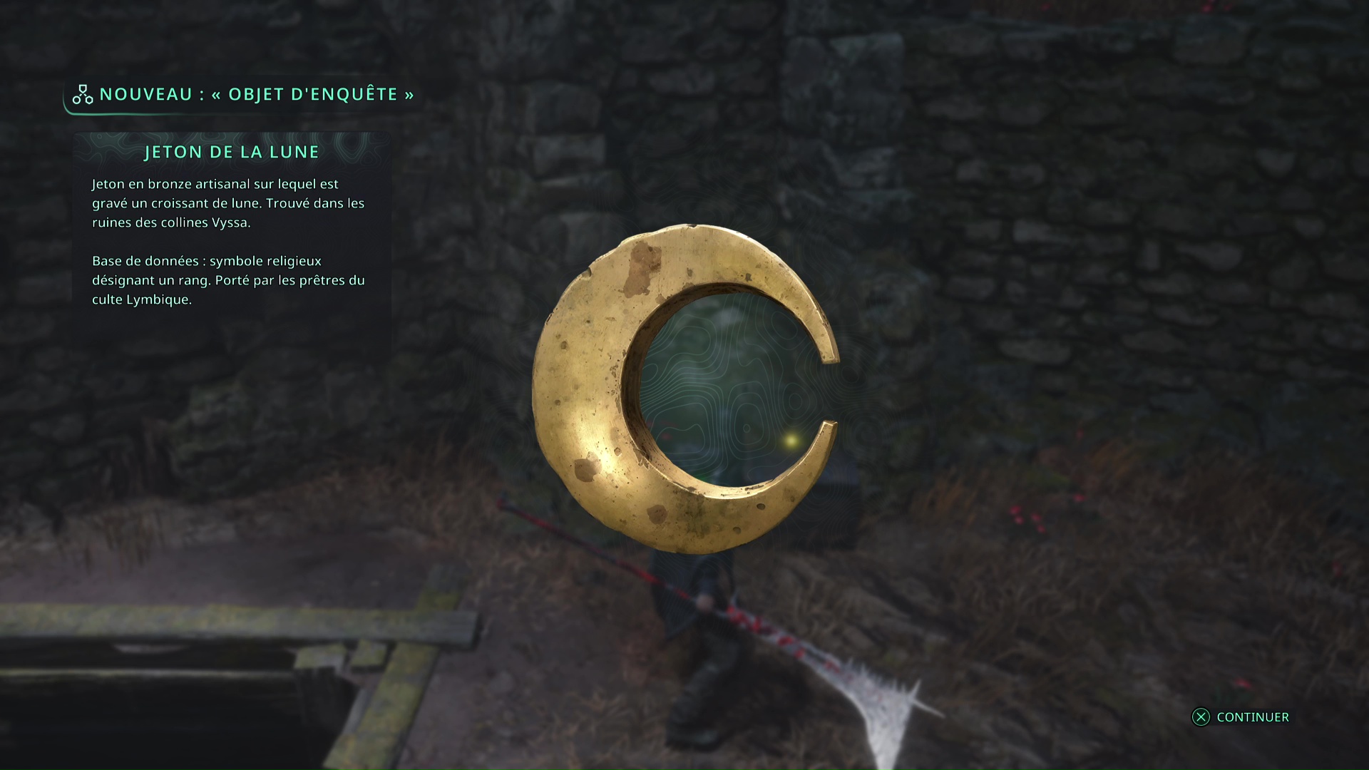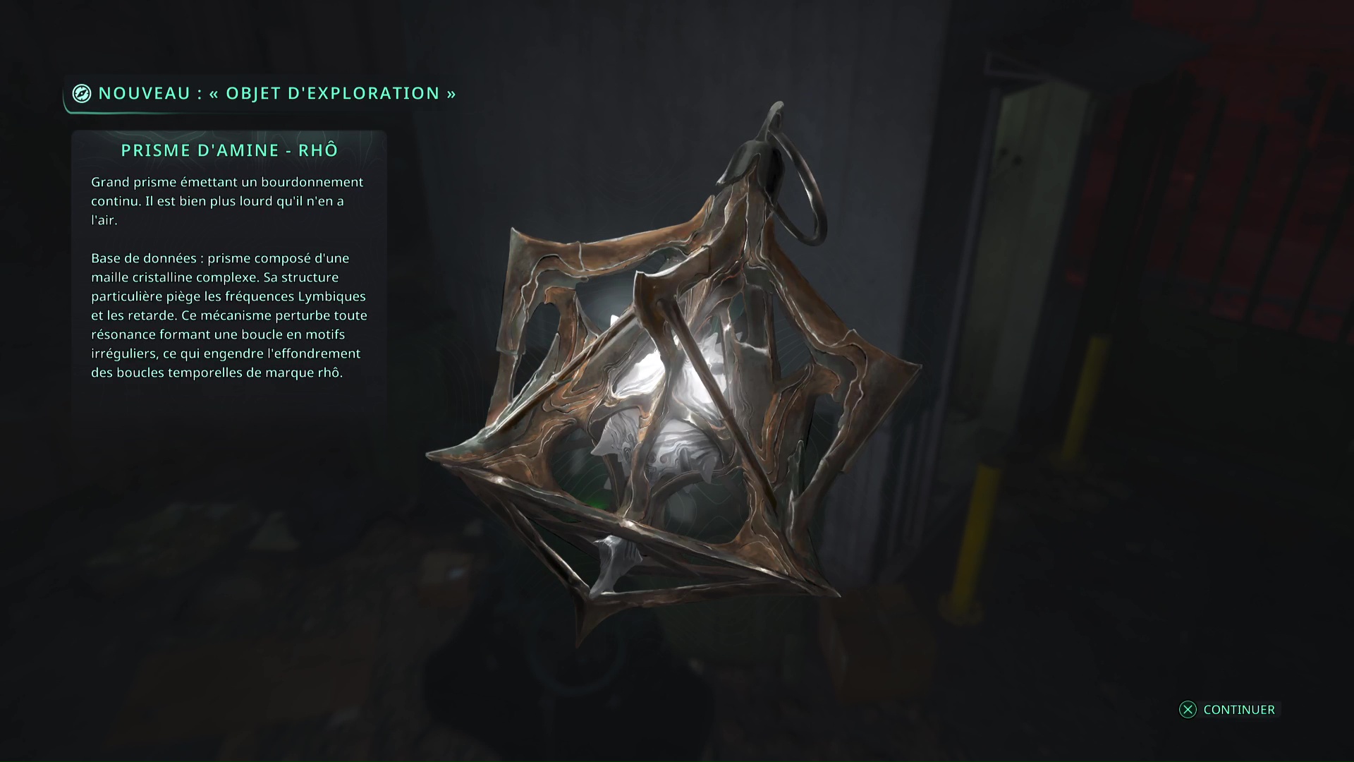 Faites quelques pas pour vous retrouver au milieu de la salle et voir un point doré brillant au-dessus de votre tête. Ramassez-le, il s’agit du Bâton Lymbique – Chagrin, X et de la Note – RHO-021.