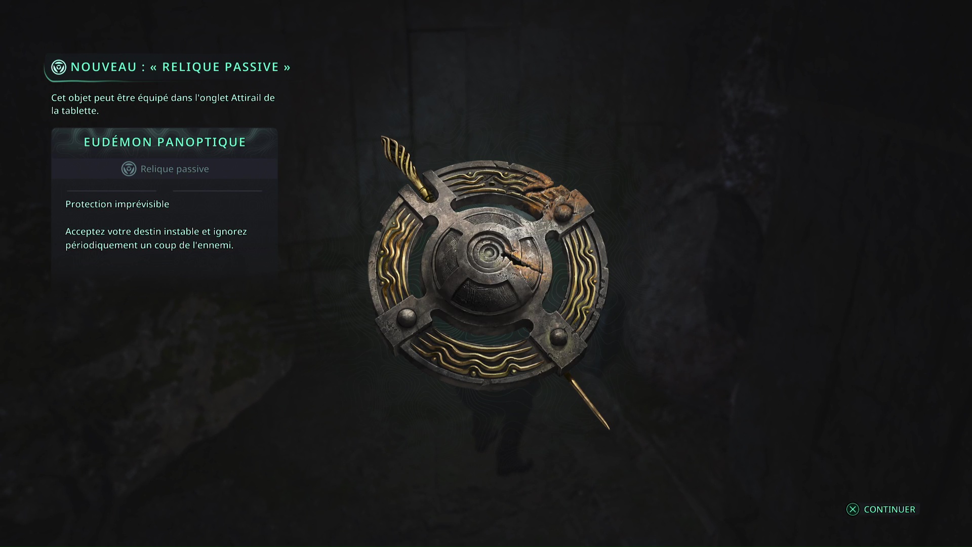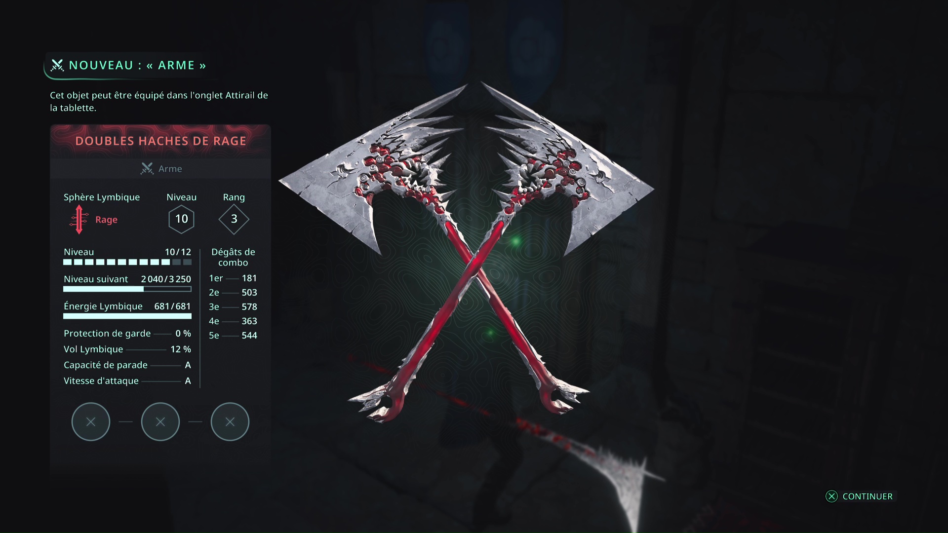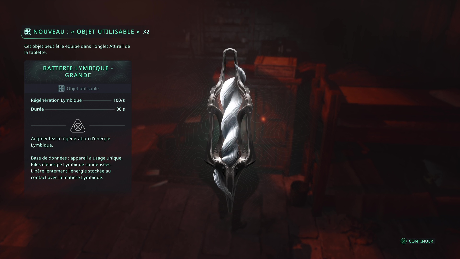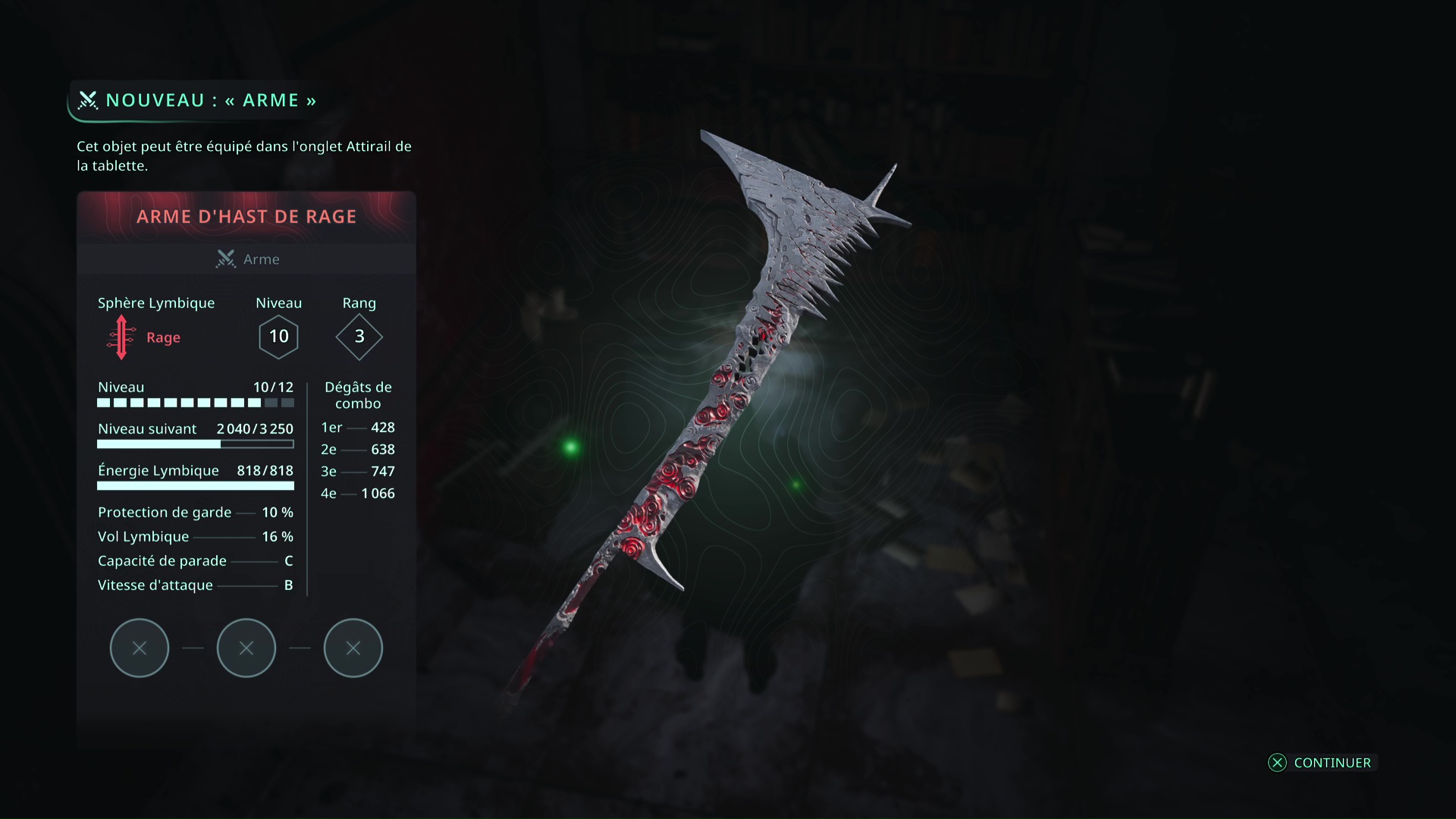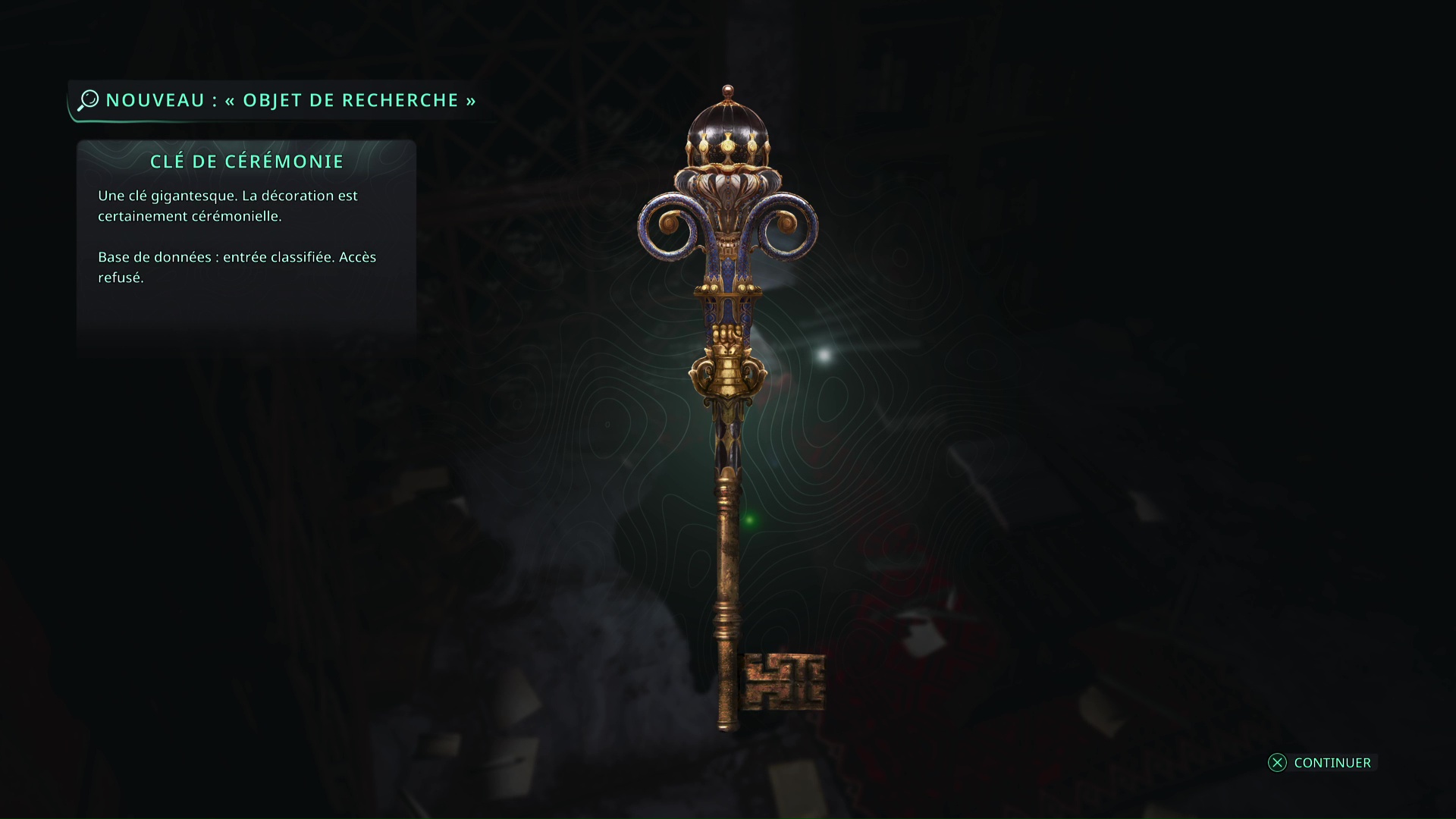Faites quelques pas pour vous retrouver au milieu de la salle et voir un point doré brillant au-dessus de votre tête. Ramassez-le, il s’agit du Bâton Lymbique – Chagrin, X et de la Note – RHO-021.