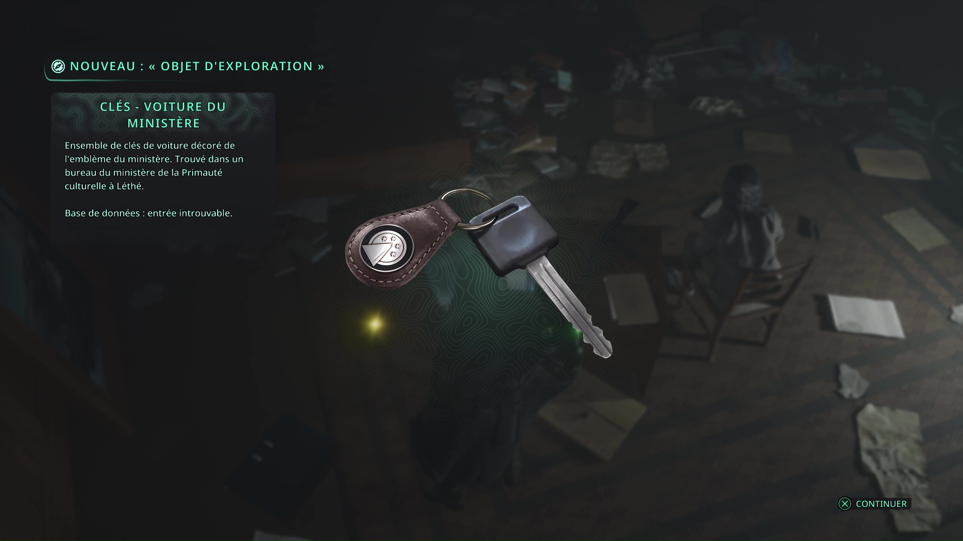 Tout peut commencer au sein du bâtiment dans le niveau Lethé – Ministère de la Primauté culturelle. Dans l’une des premières pièces accessibles, vous tomberez sur une femme du nom de Ahiji Evans. Elle est assise devant un bureau. Faites le tour du bureau pour ramasser les Clés – Voiture du ministère.