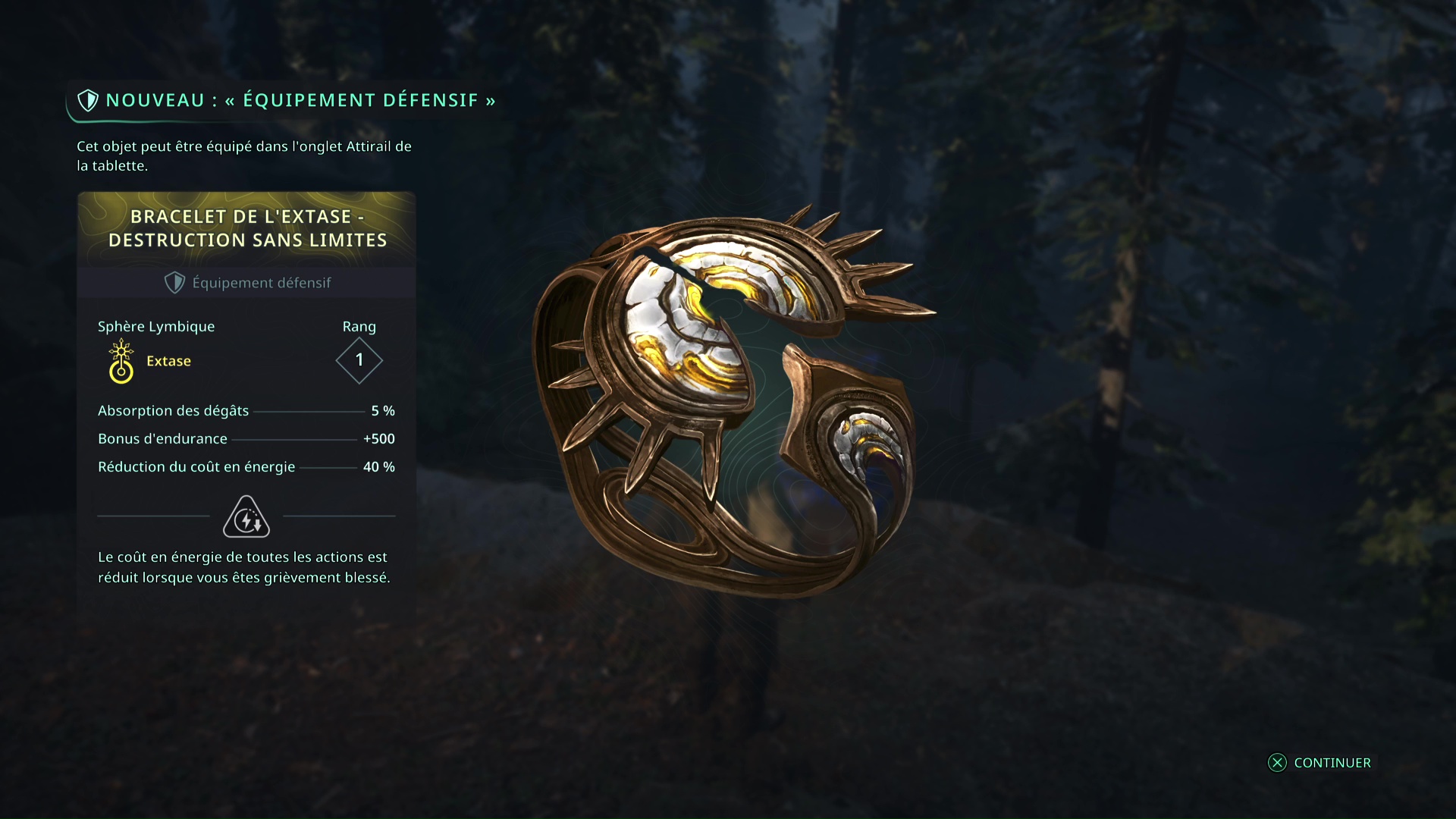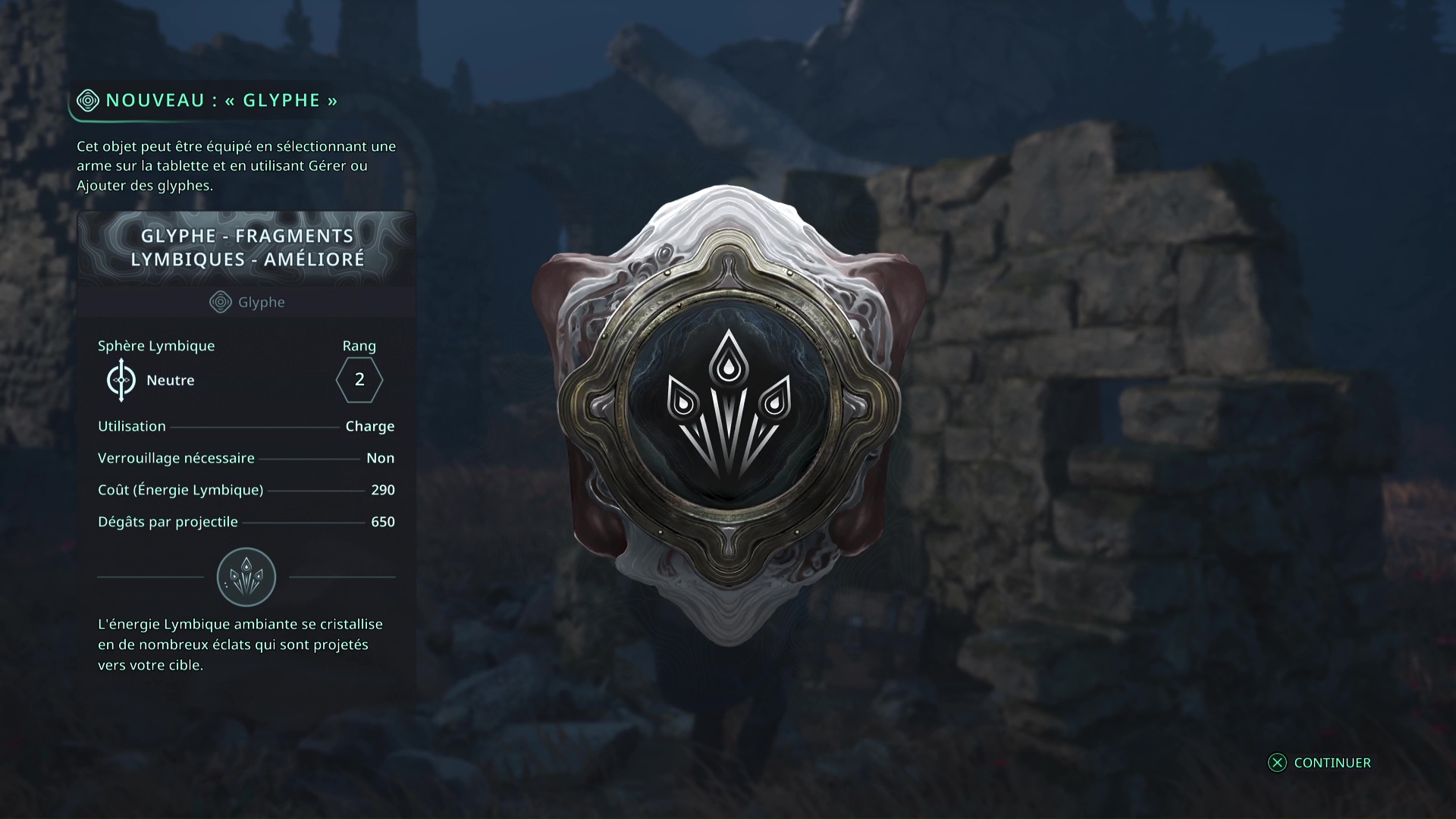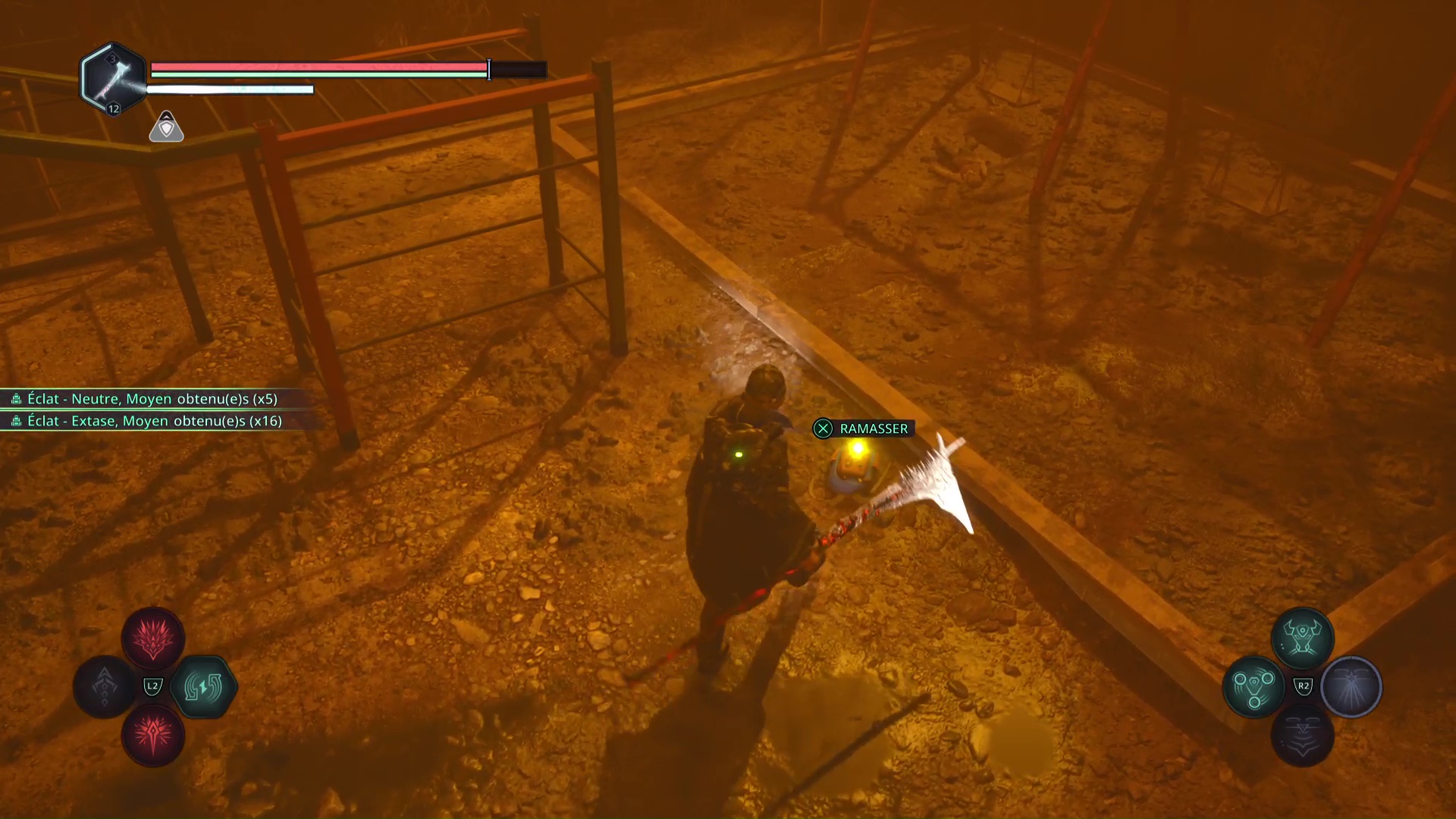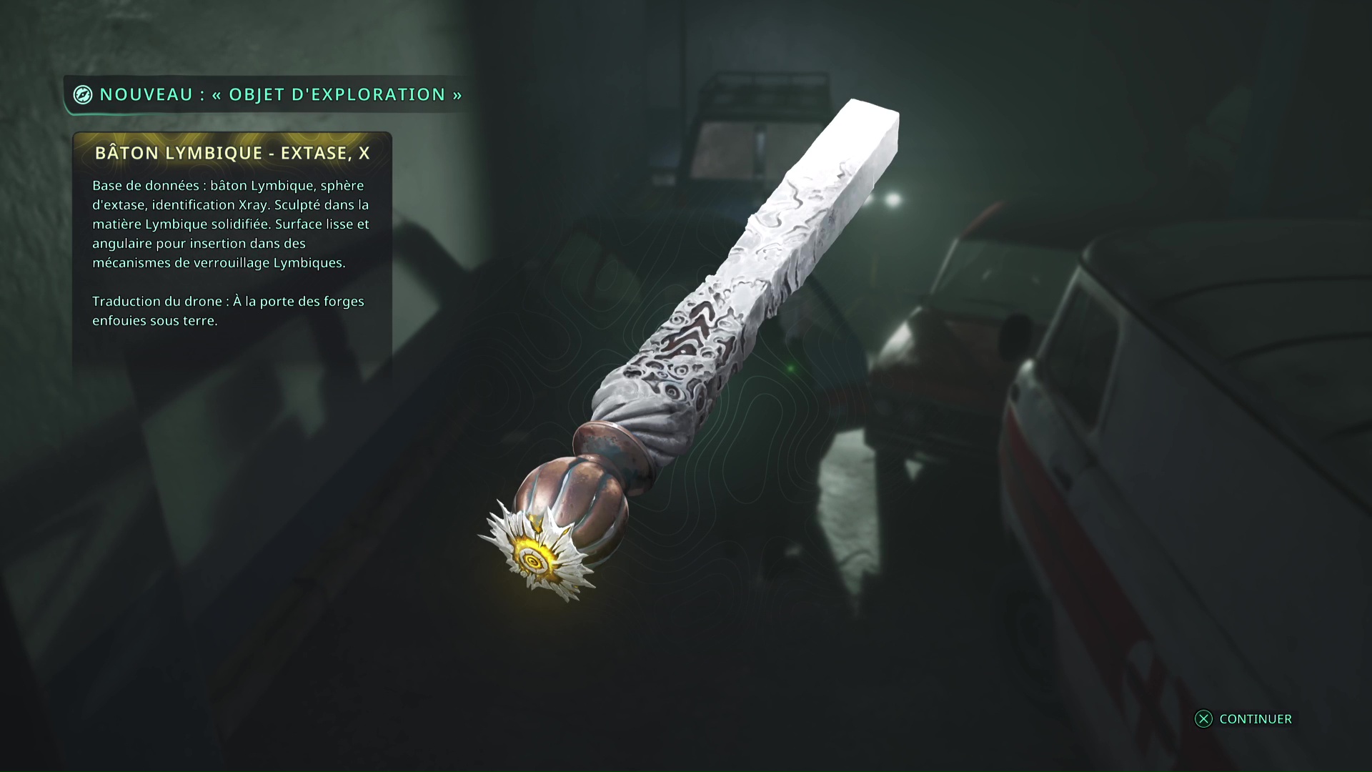 Il va falloir faire le tour par la droite en faisant attention à l’ennemi qui vous tire dessus et à un autre qui ne va pas tarder à vous sauter dessus. Une fois tranquille, ramassez l’objet, il s’agit du Bâton Lymbique – Extase, V.