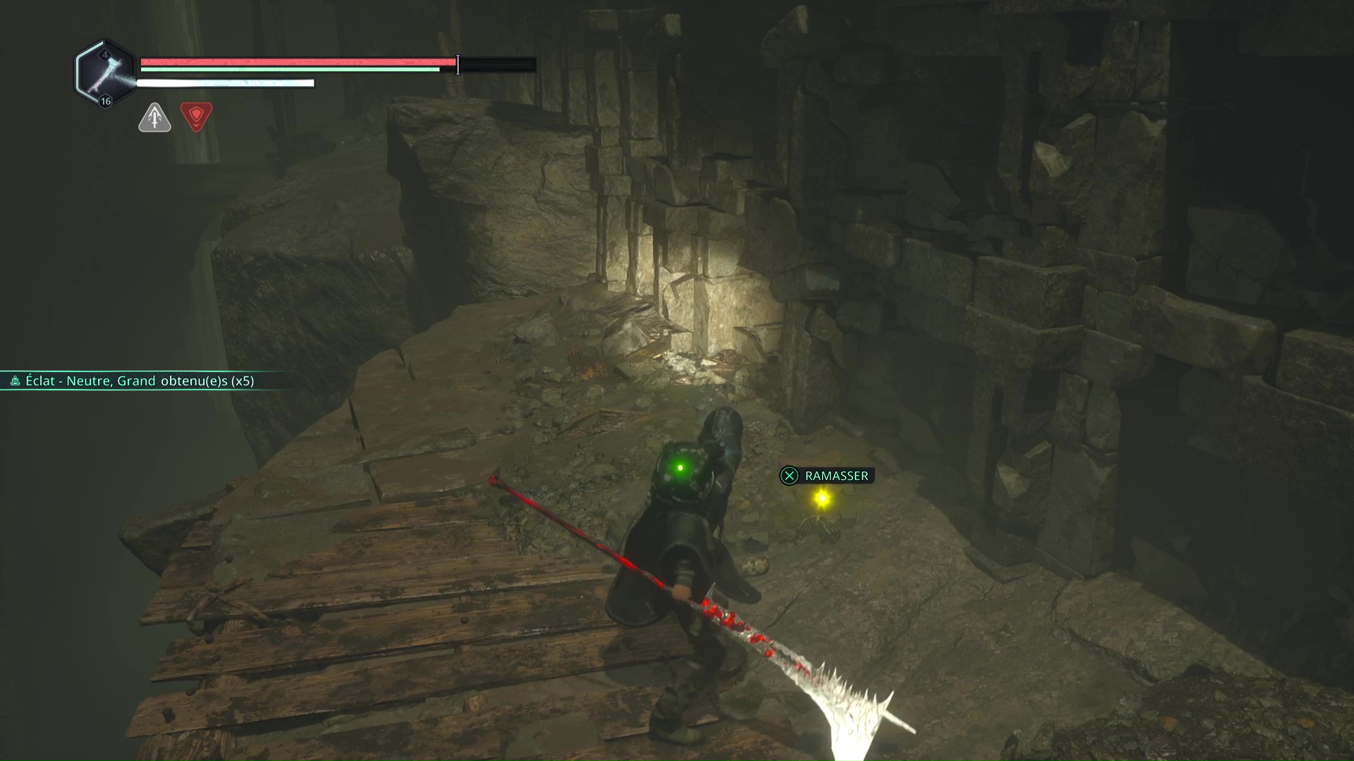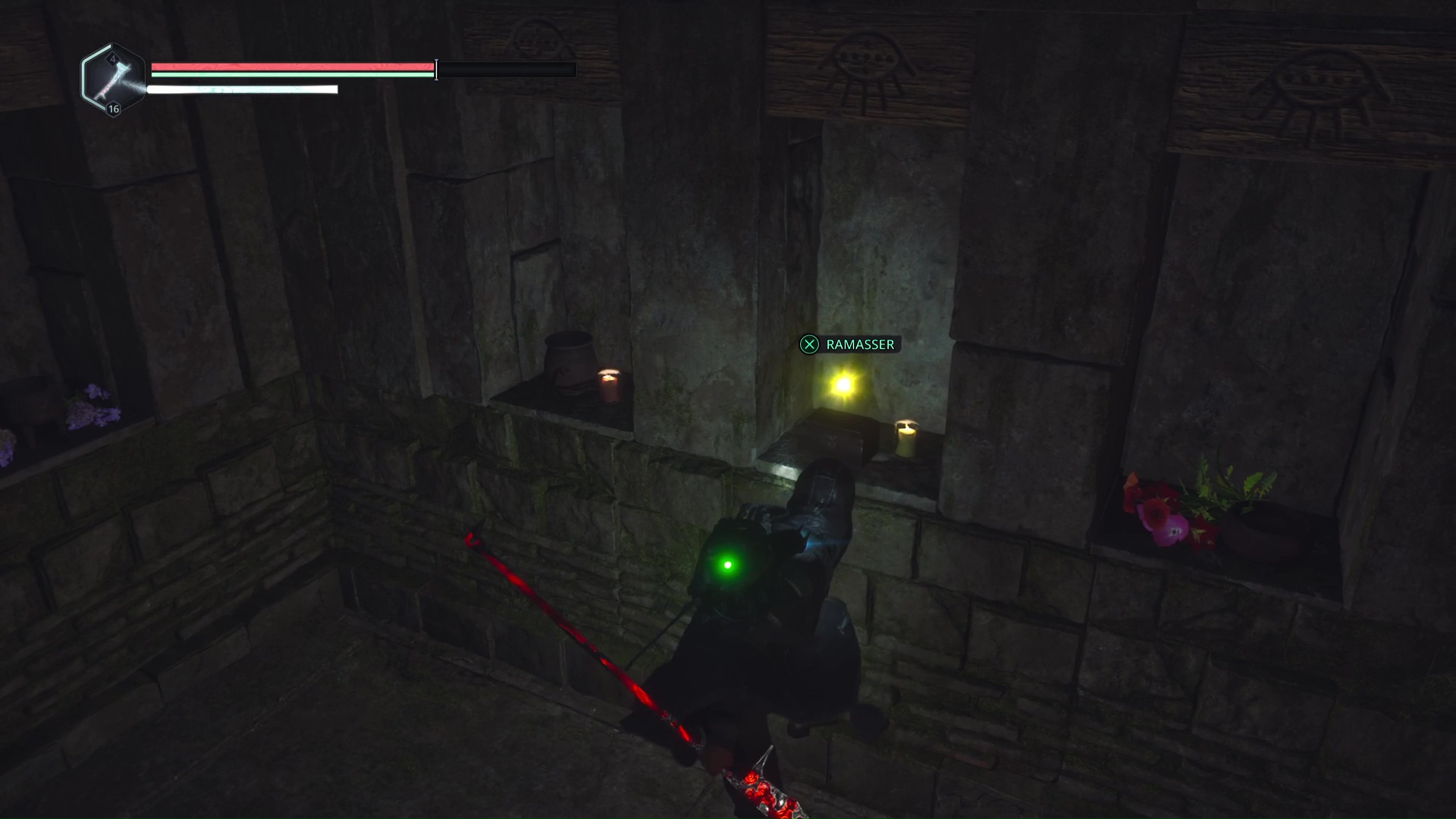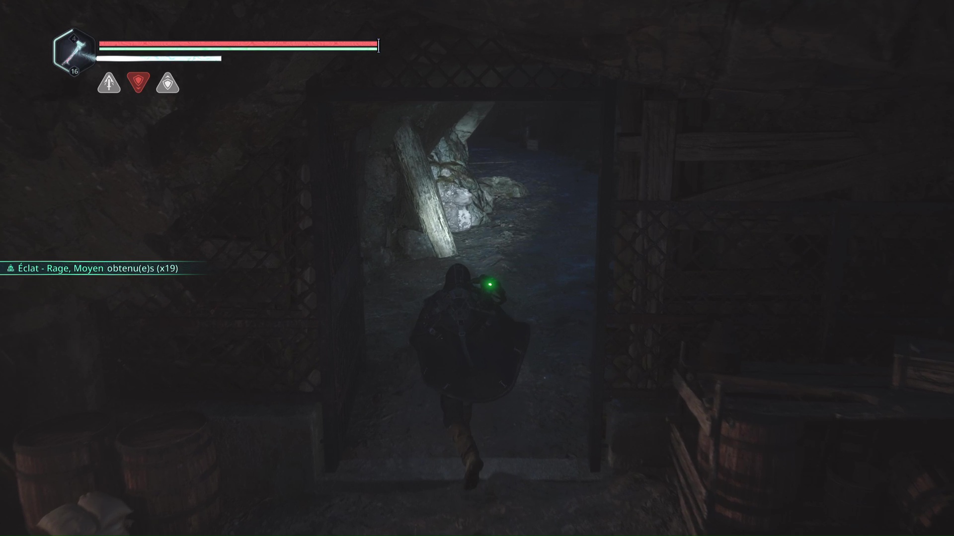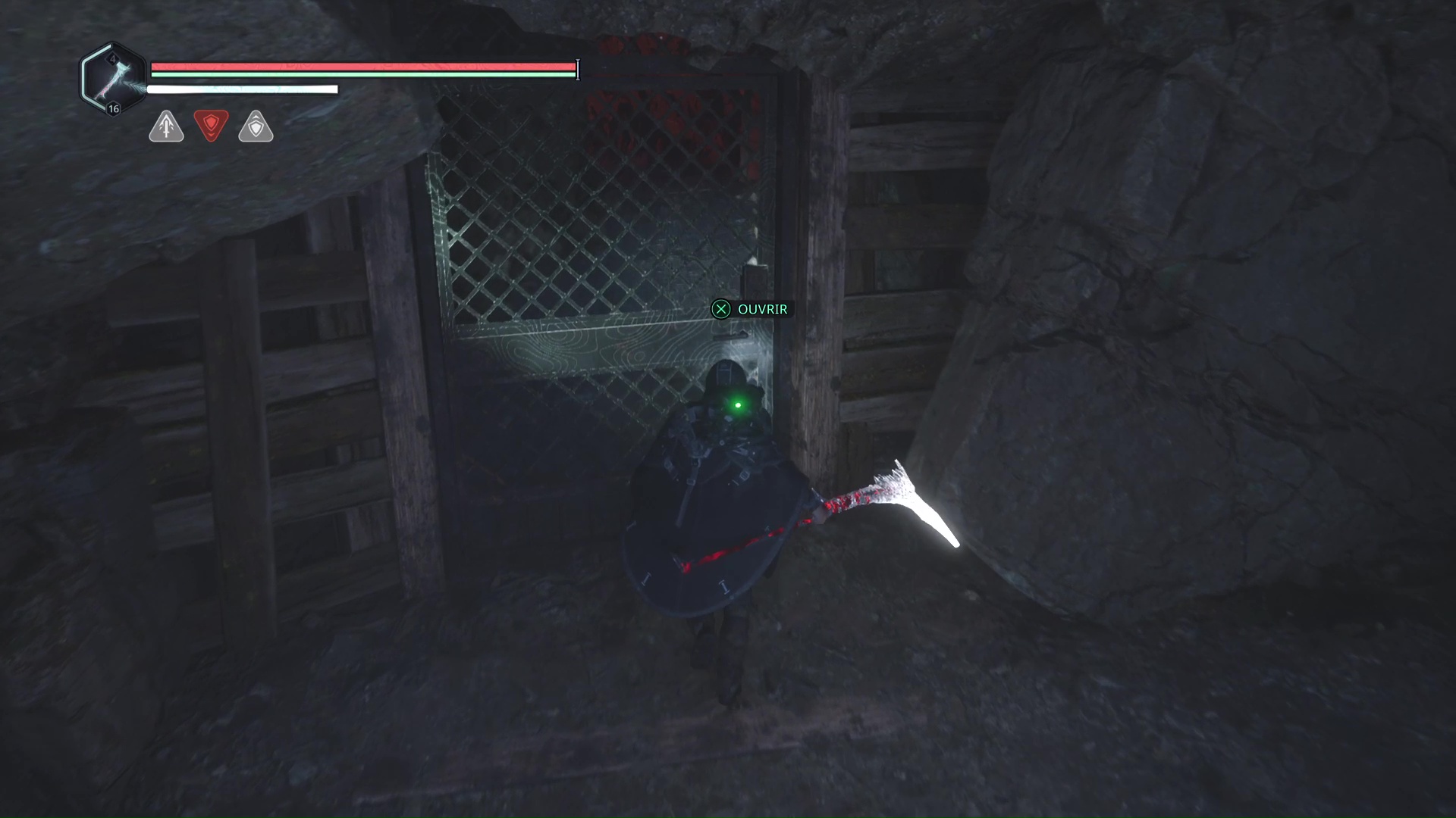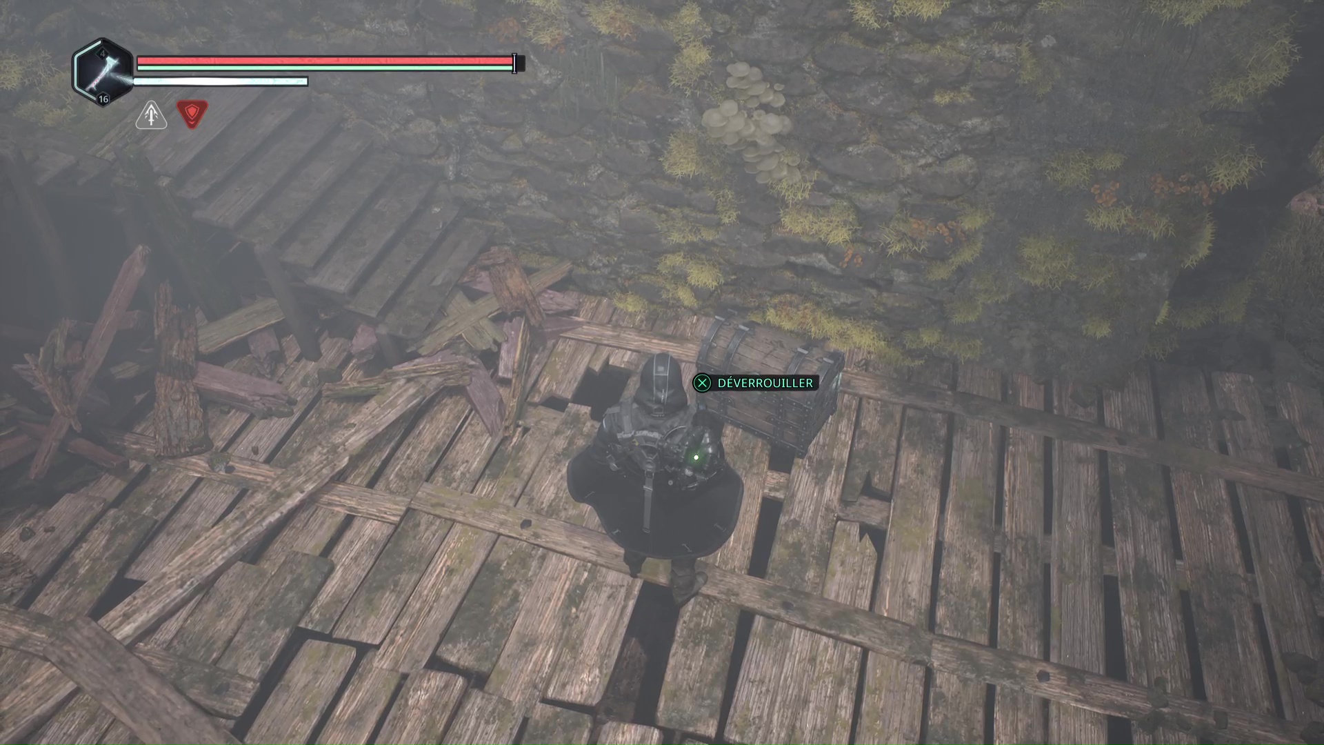 Continuez ensuite le donjon tranquillement jusqu’à atteindre un Hollow Walker protecteur. Battez-le et approchez-vous de l’échaffaudage en bois sur la droite. Montez à l’échelle et, une fois en haut, allez sur la droite. Un autre Hollow Walker portecteur viendra vous embêter.