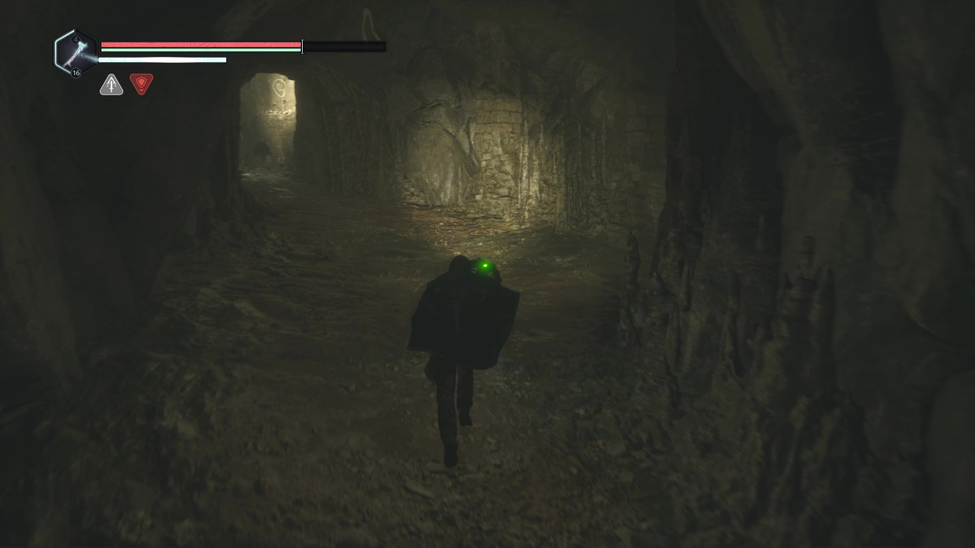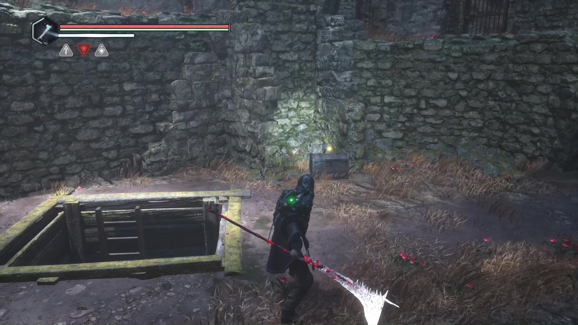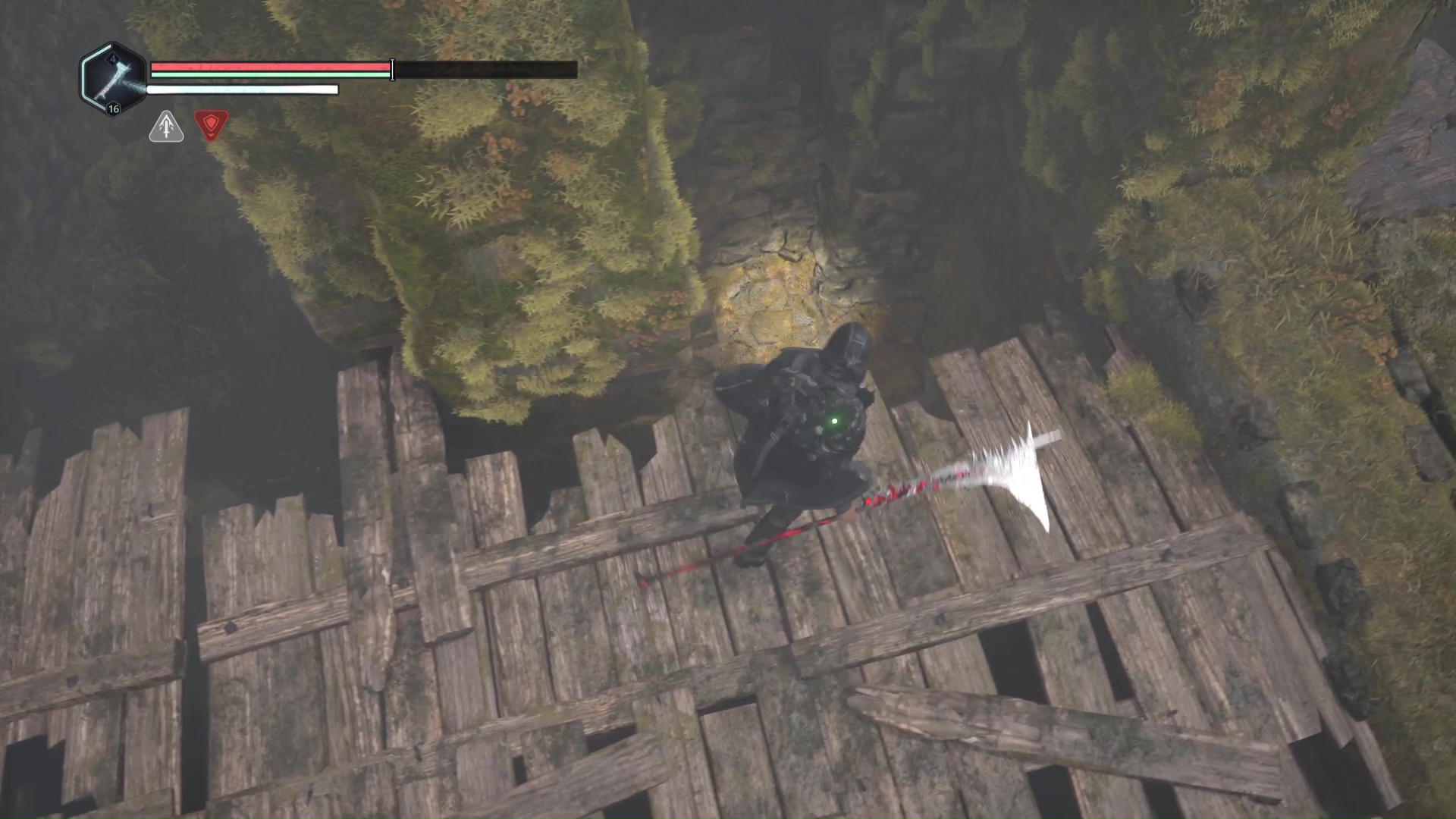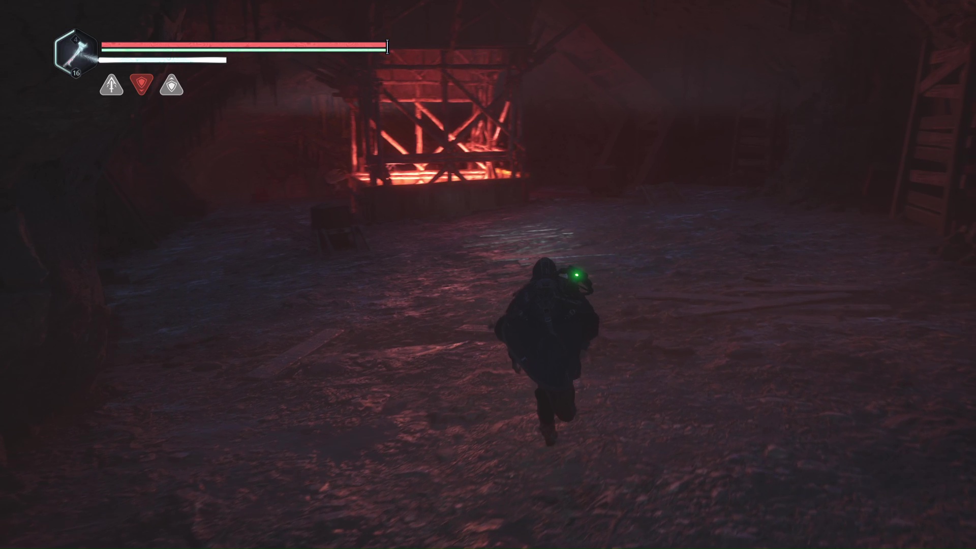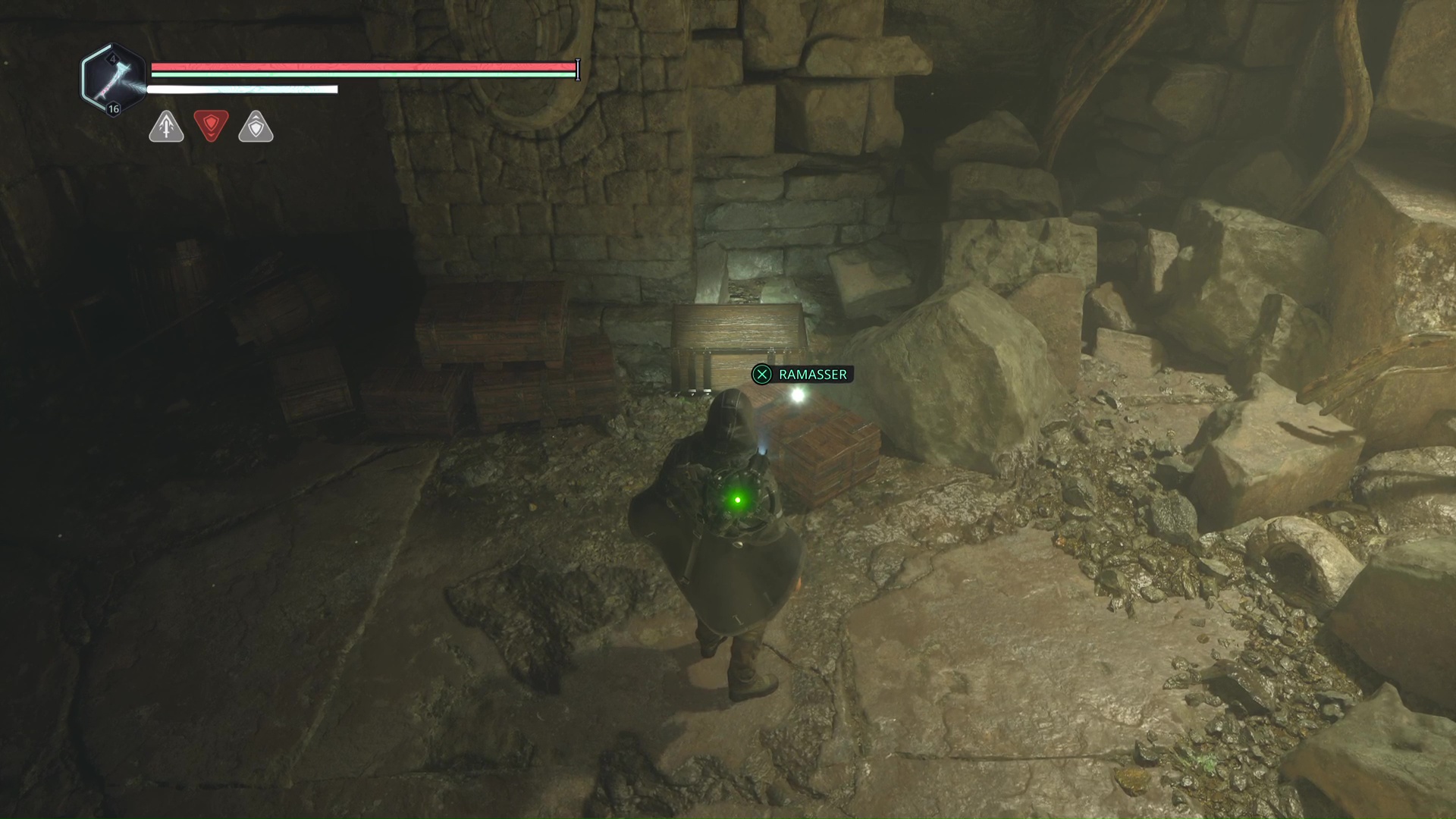 Continuez ensuite le donjon tranquillement jusqu’à atteindre un Hollow Walker protecteur. Battez-le et approchez-vous de l’échaffaudage en bois sur la droite. Montez à l’échelle et, une fois en haut, allez sur la droite. Un autre Hollow Walker portecteur viendra vous embêter.