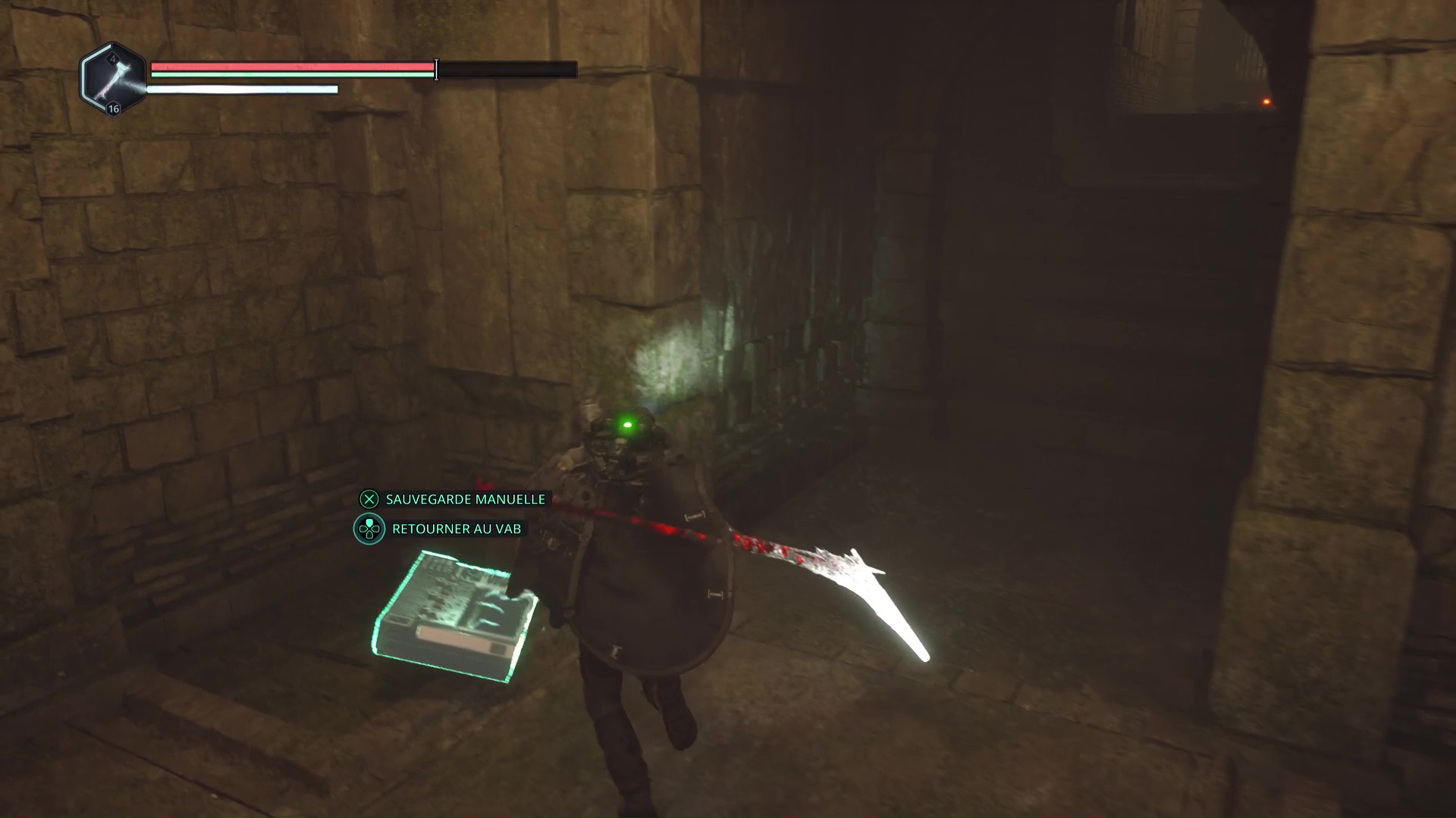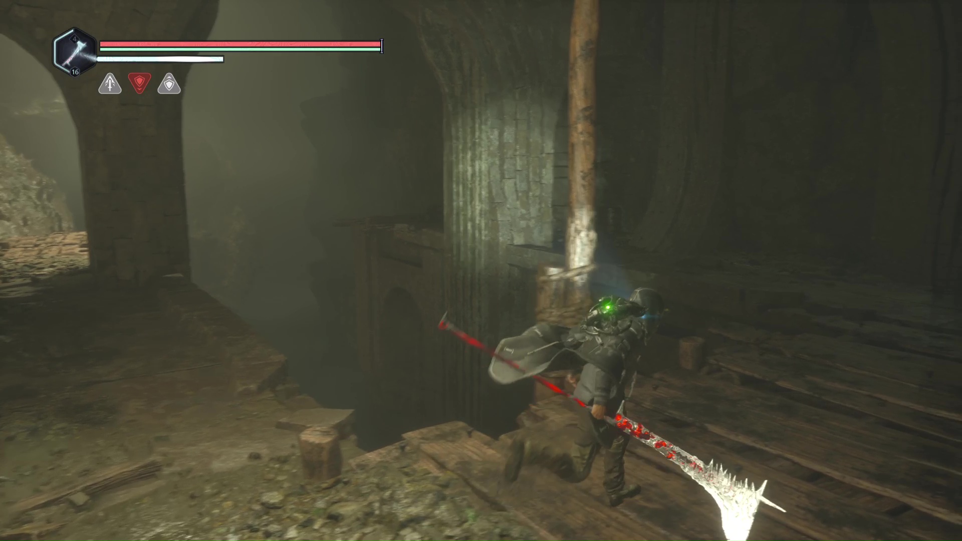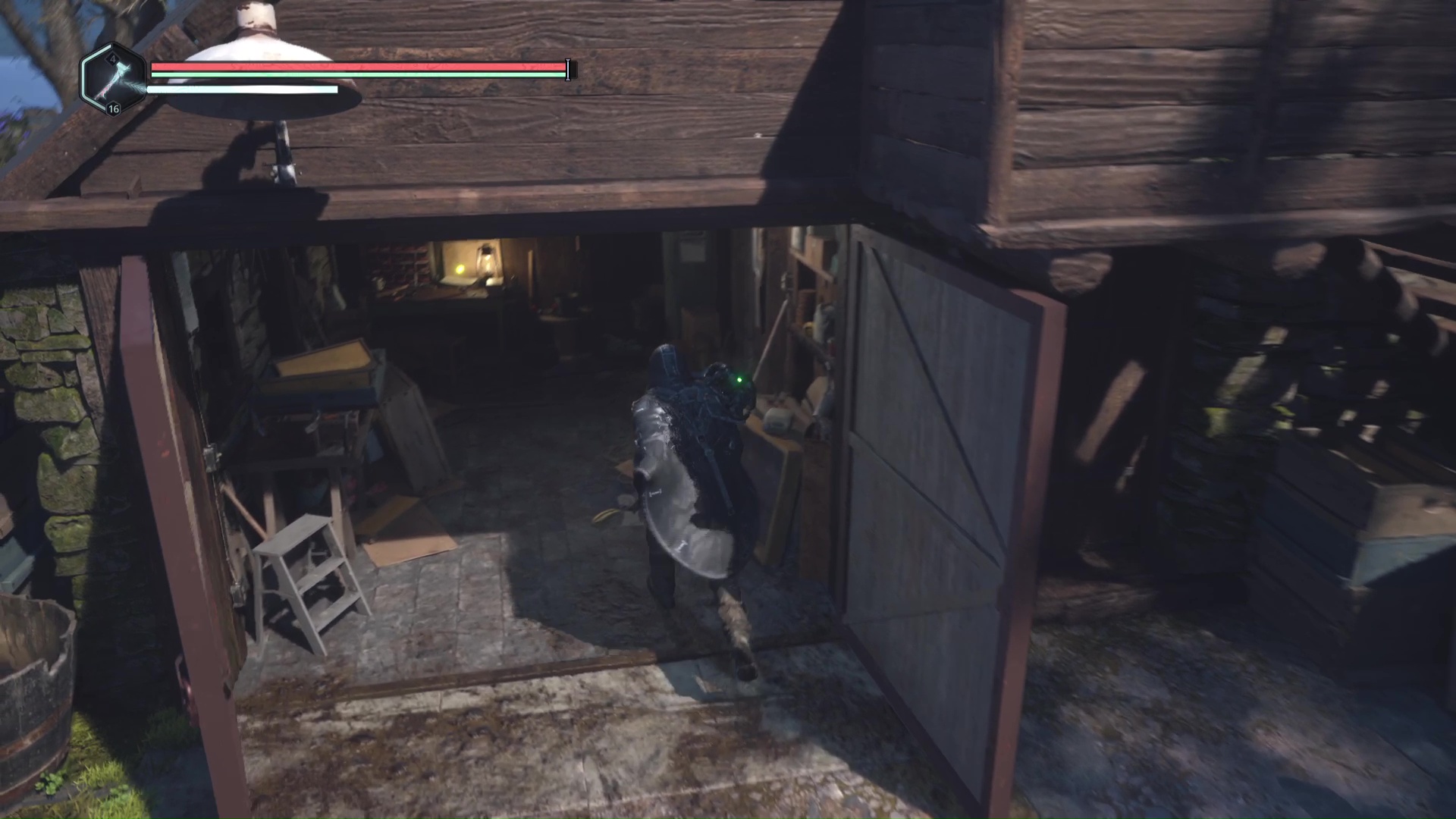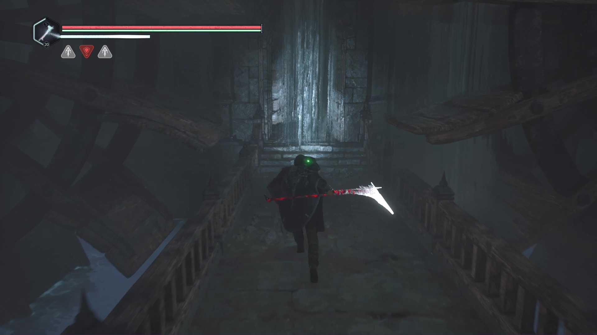 Continuez ensuite le donjon tranquillement jusqu’à atteindre un Hollow Walker protecteur. Battez-le et approchez-vous de l’échaffaudage en bois sur la droite. Montez à l’échelle et, une fois en haut, allez sur la droite. Un autre Hollow Walker portecteur viendra vous embêter.
