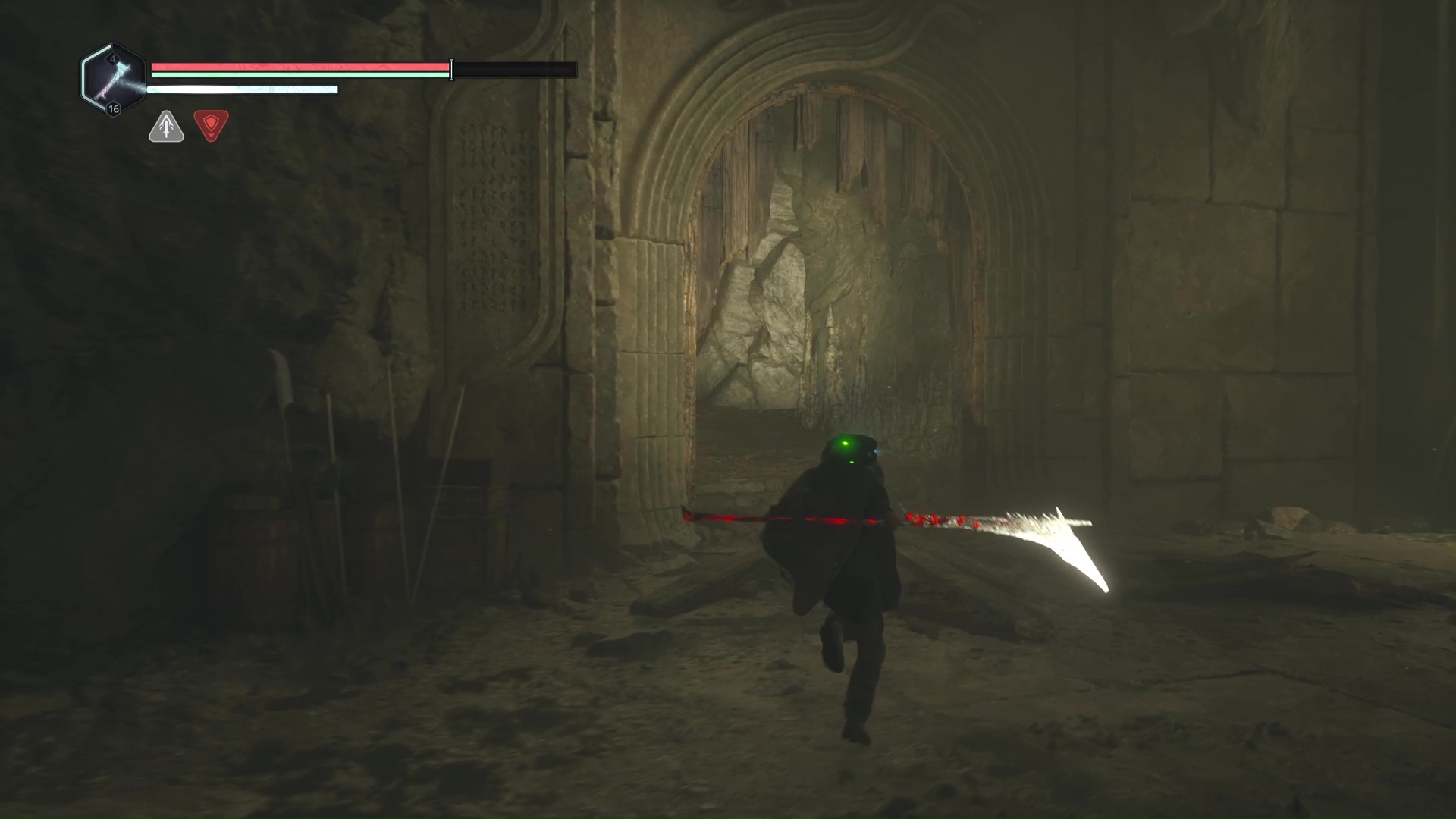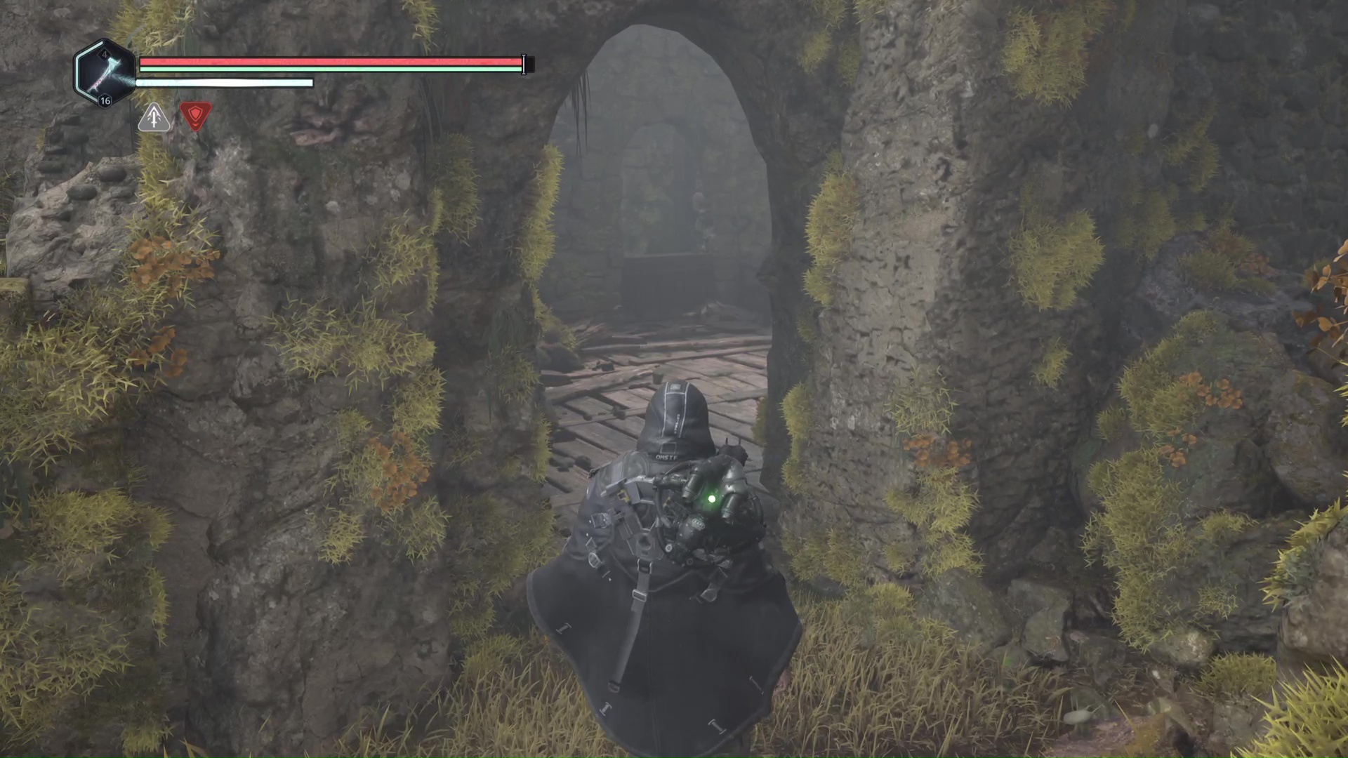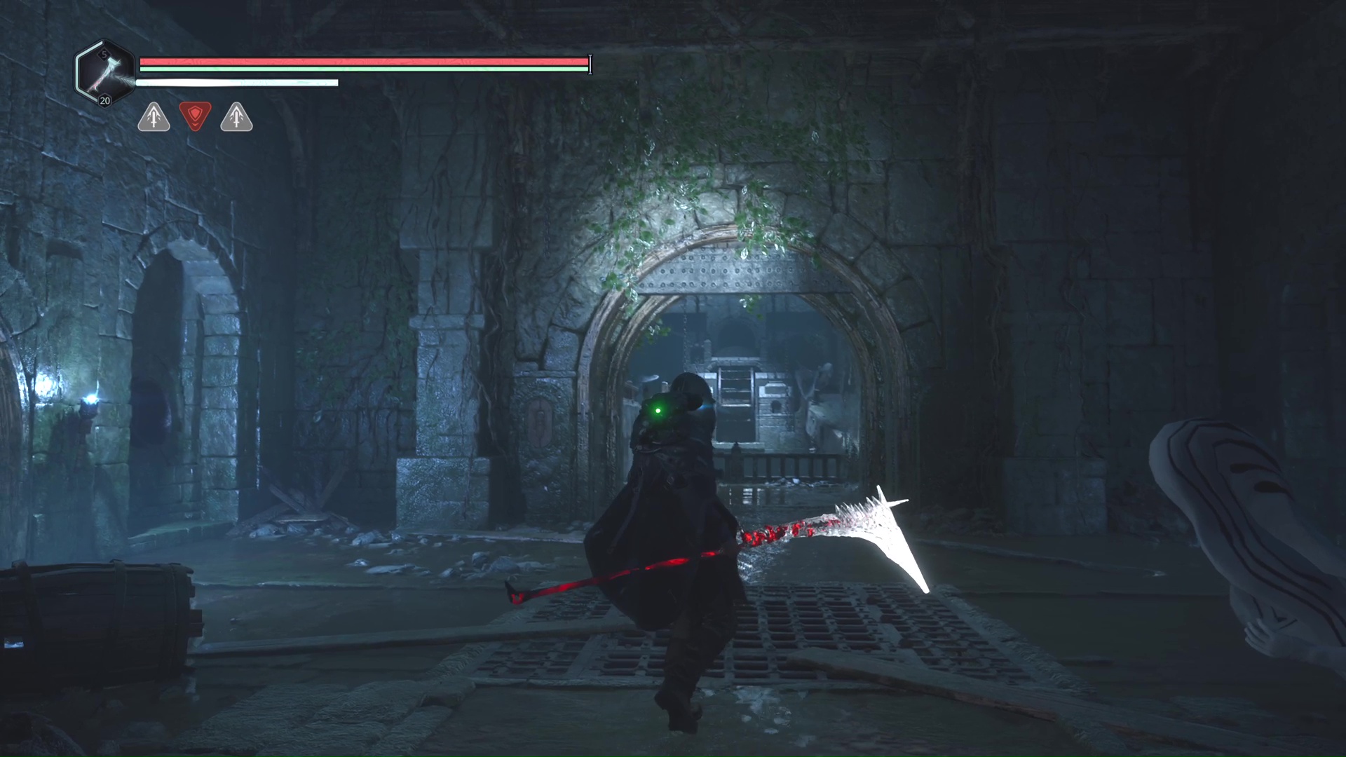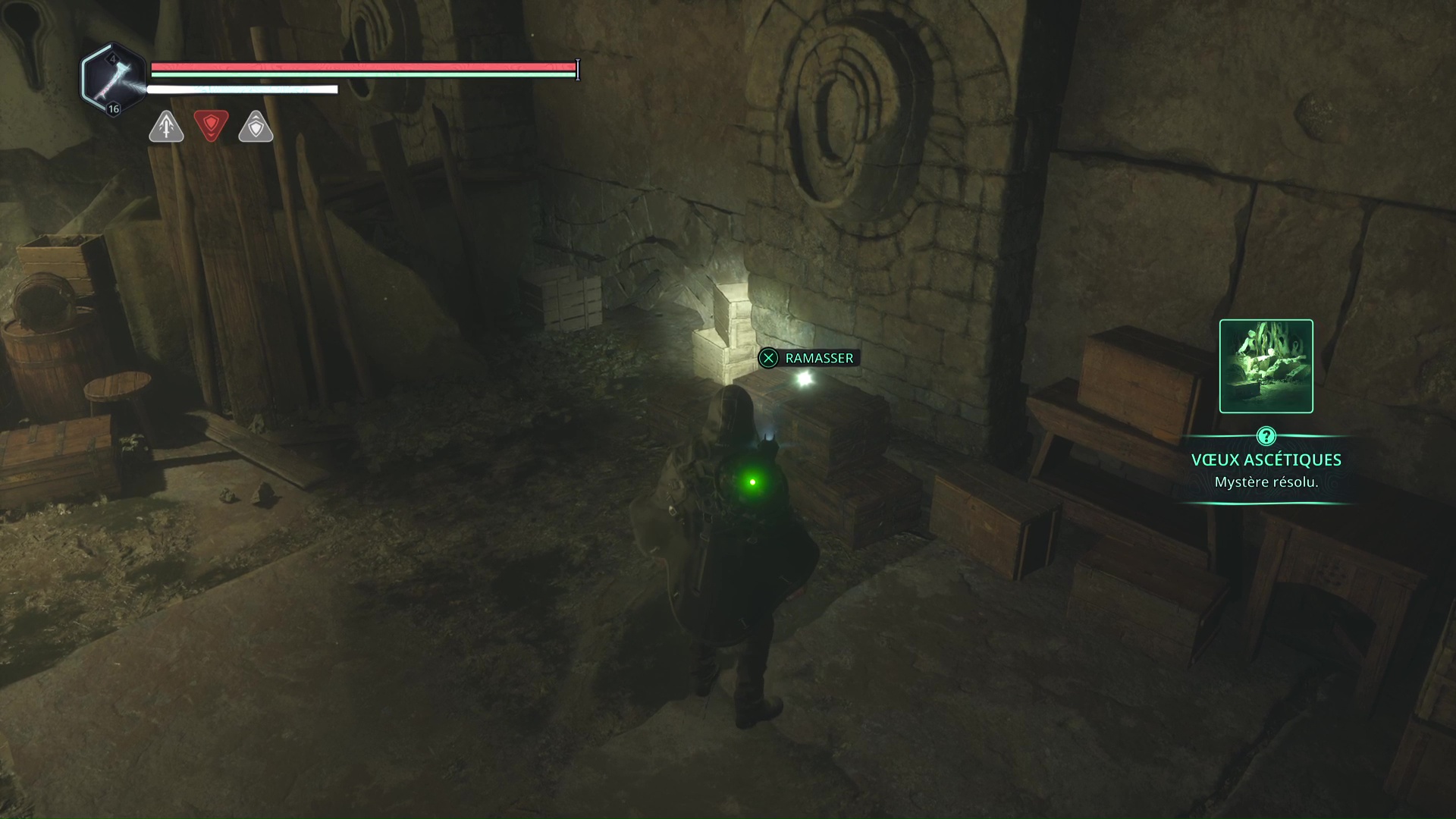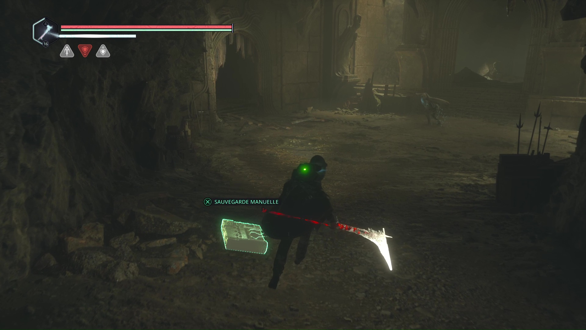 Continuez ensuite le donjon tranquillement jusqu’à atteindre un Hollow Walker protecteur. Battez-le et approchez-vous de l’échaffaudage en bois sur la droite. Montez à l’échelle et, une fois en haut, allez sur la droite. Un autre Hollow Walker portecteur viendra vous embêter.