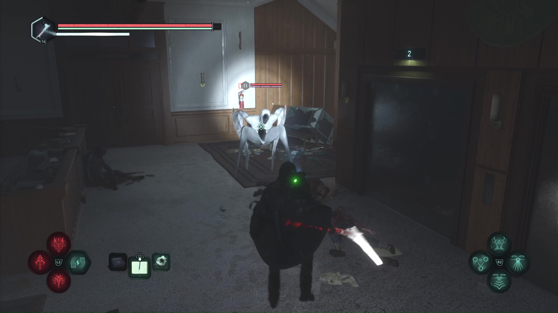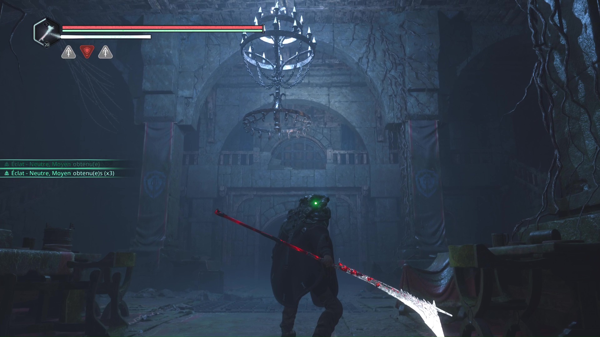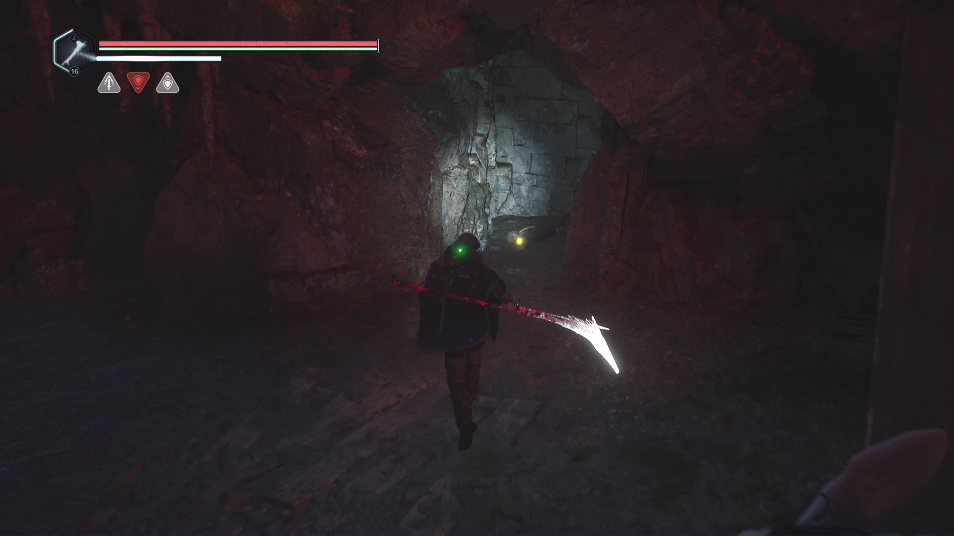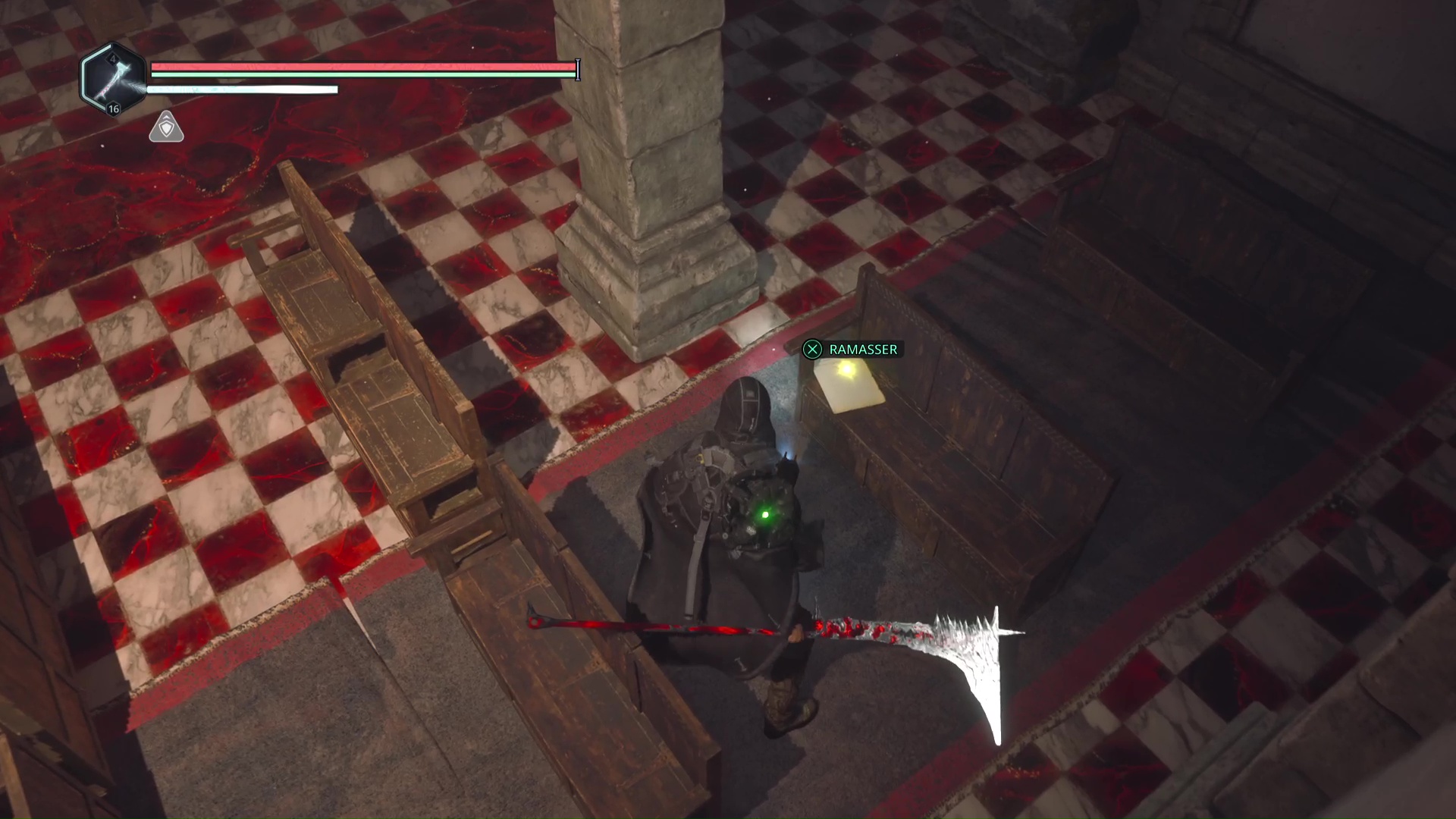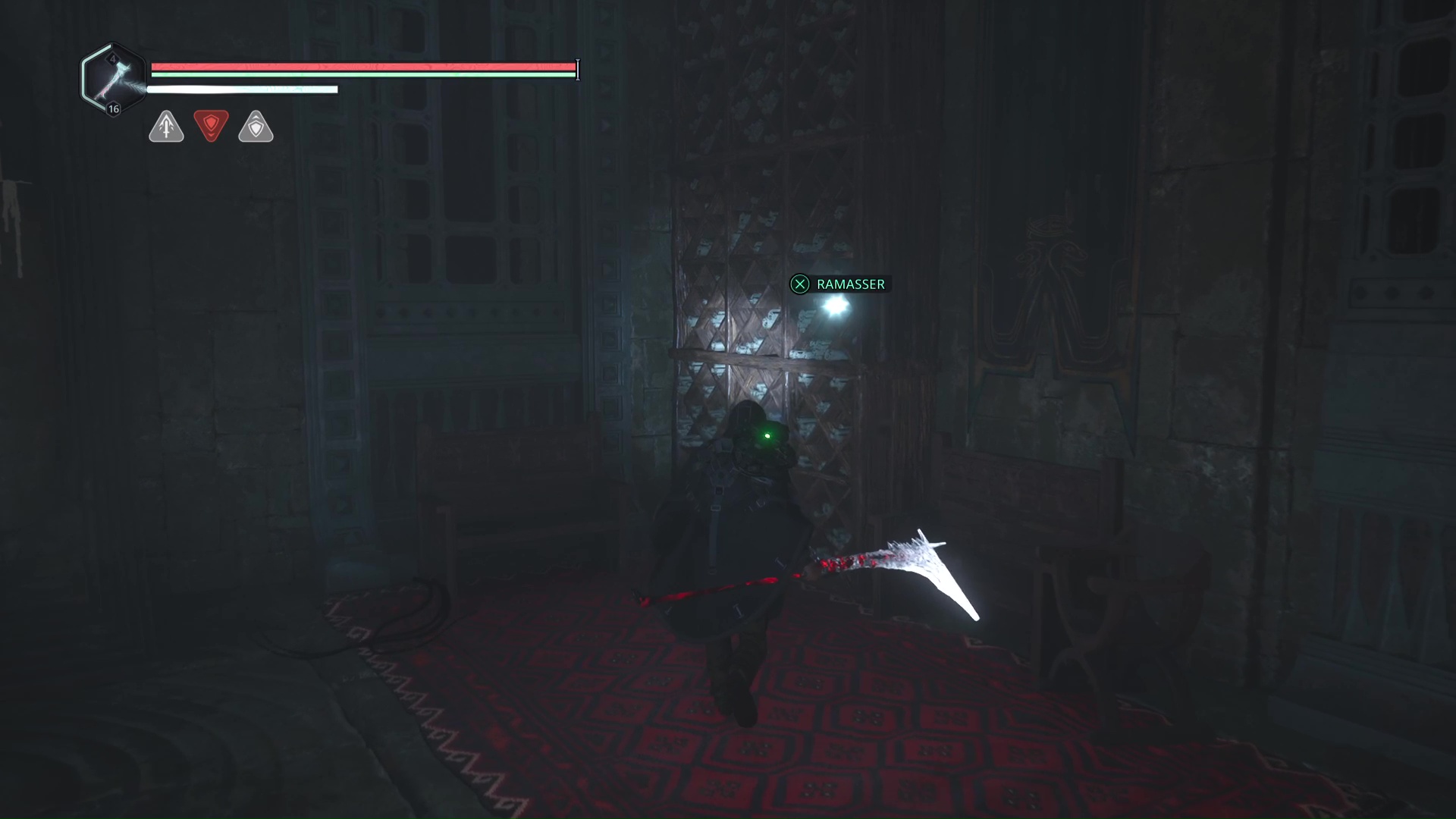 Vous arriverez dans une grande zone éclairée en rouge. Progressez encore un peu pour tomber sur deux Hollow Walkers – Haze d’extase. Tuez-les et remarquez le petit recoin sur la droite où se trouve un point doré brillant. Il s’agit du Bâton Lymbique – Chagrin, V.