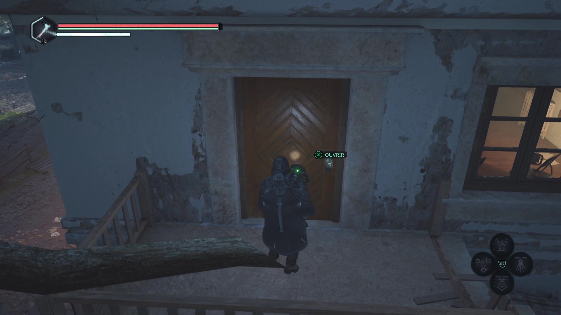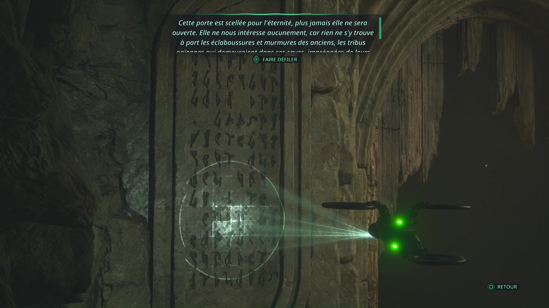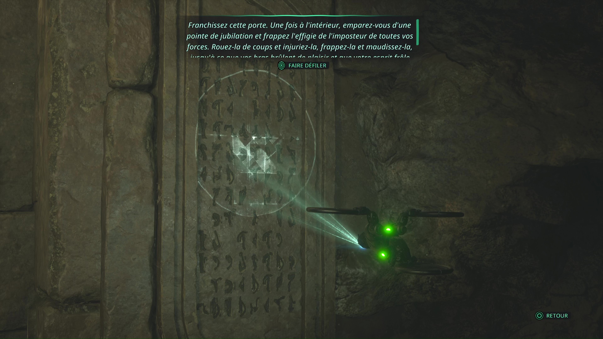 Après avoir battu l’Hollow Walker-Haze de chagrin, prenez le chemin de droite, où le message lisible par le drone commence par « Franchissez cette porte ».