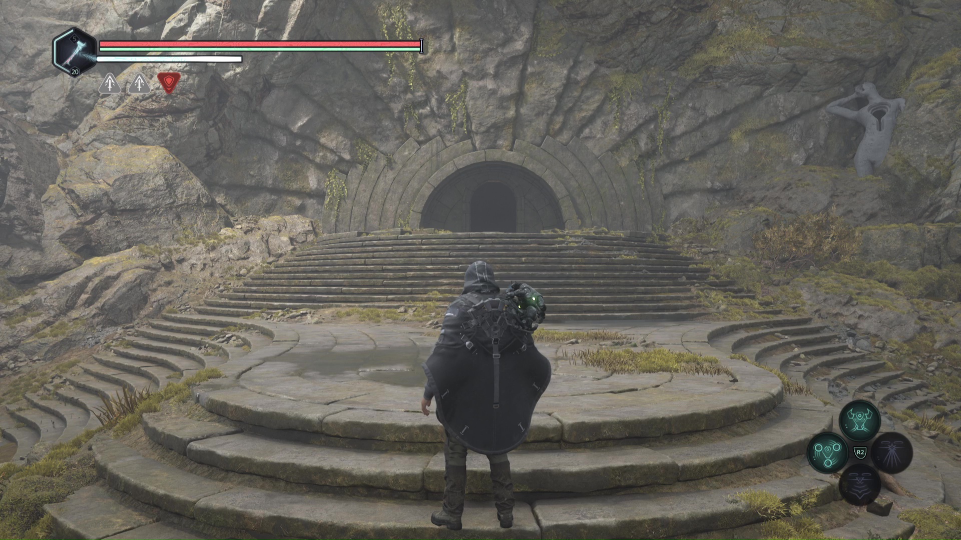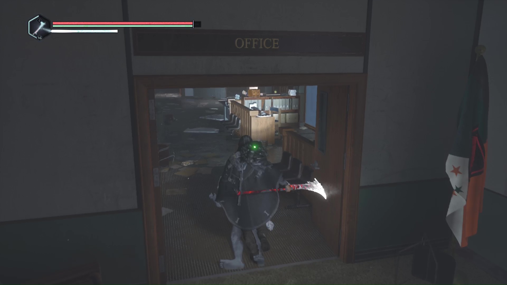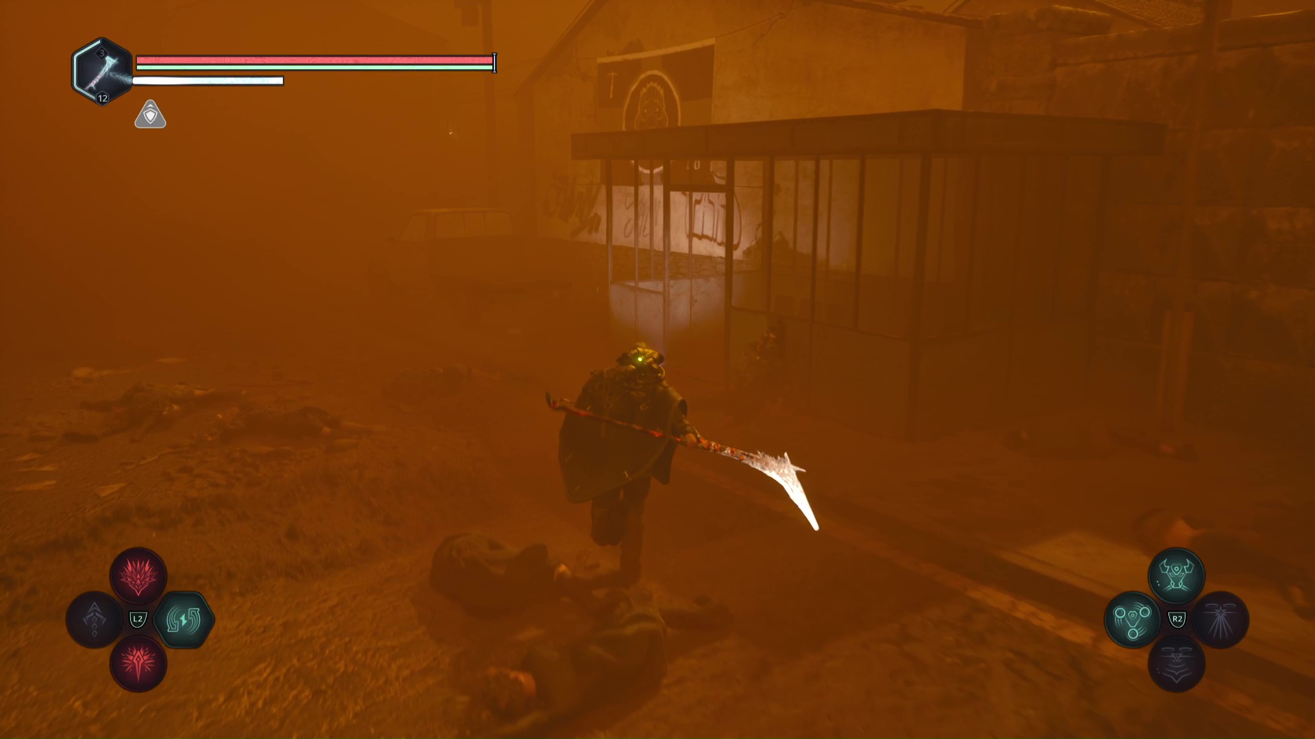 Après avoir battu l’Hollow Walker-Haze de chagrin, prenez le chemin de droite, où le message lisible par le drone commence par « Franchissez cette porte ».