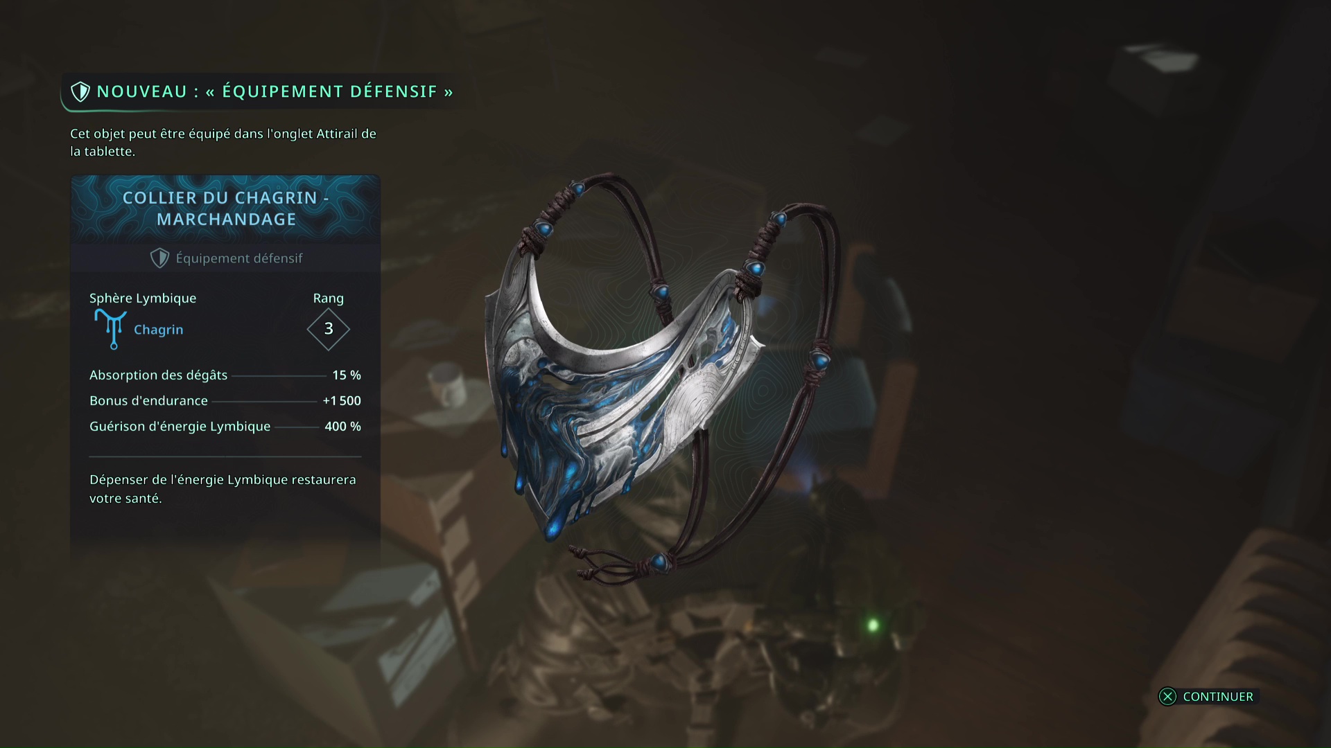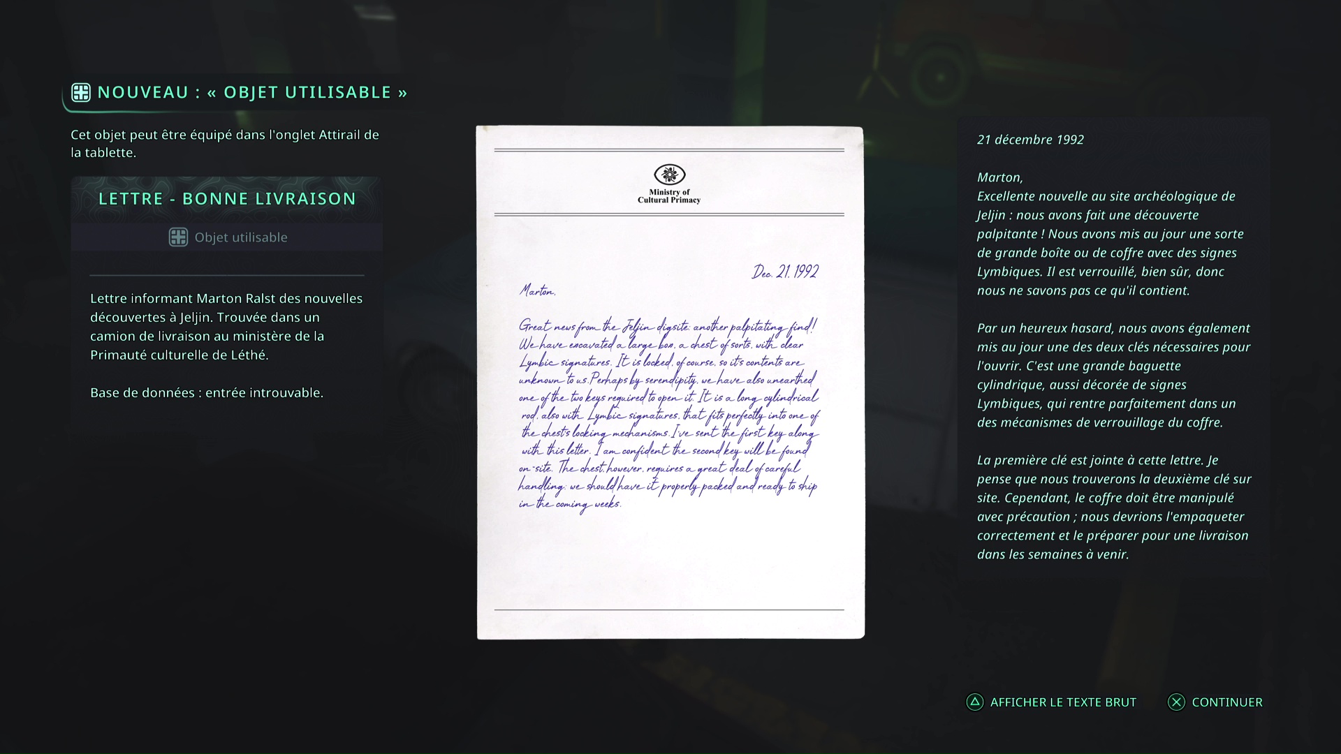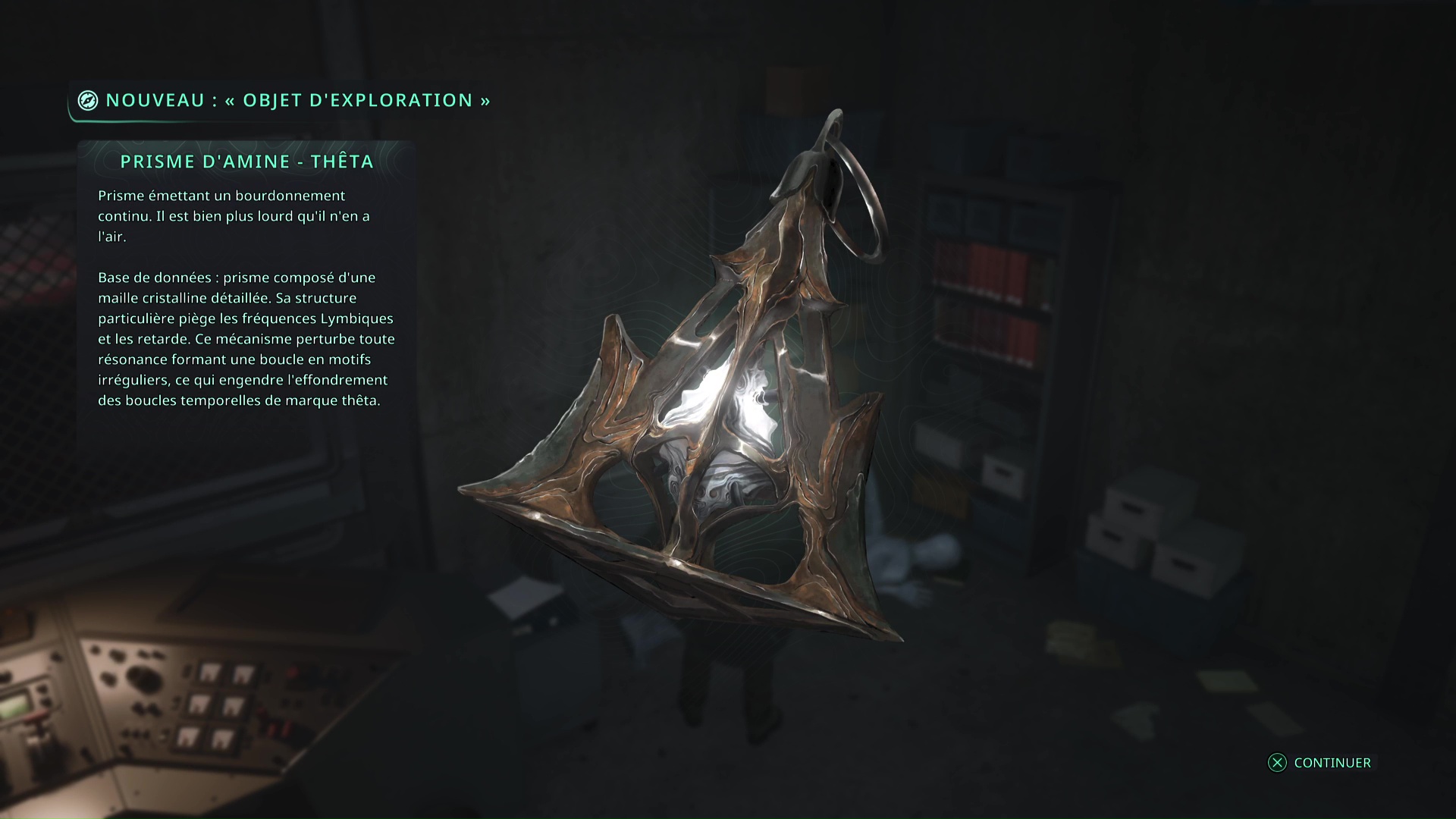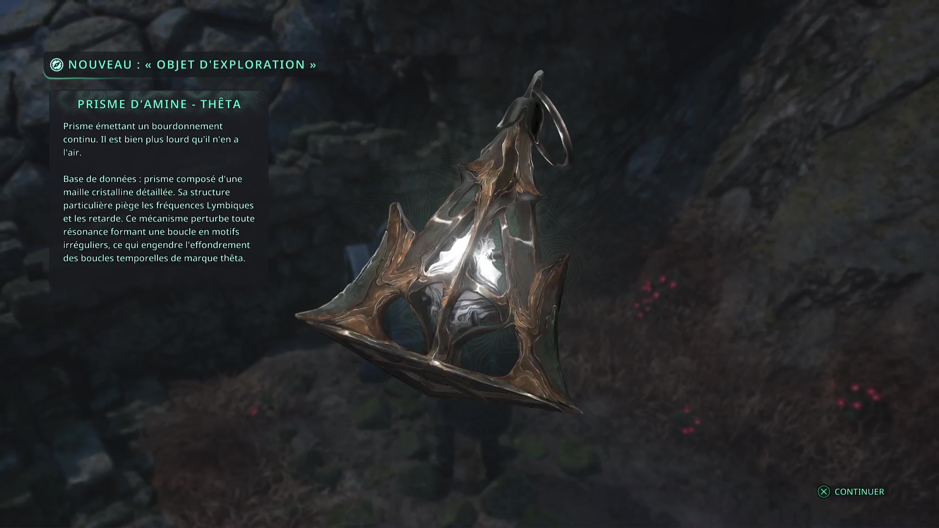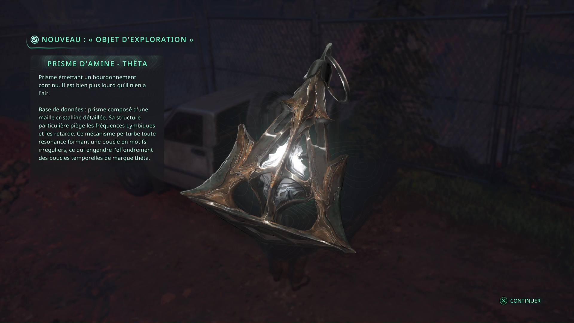 Les deux bâtons en votre possession, retournez au niveau de la tente du campement archéologique de Jeljin pour ouvrir le coffre lymbique placé sur une remorque. Vous obtiendrez un Prisme d’amine – Thêta.