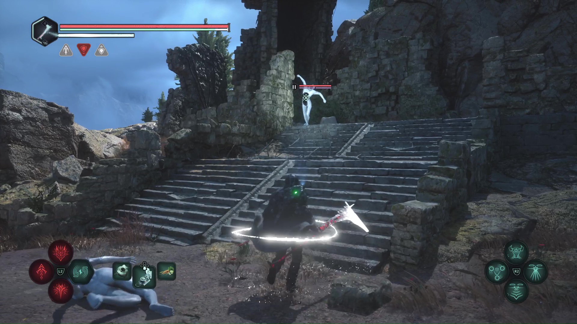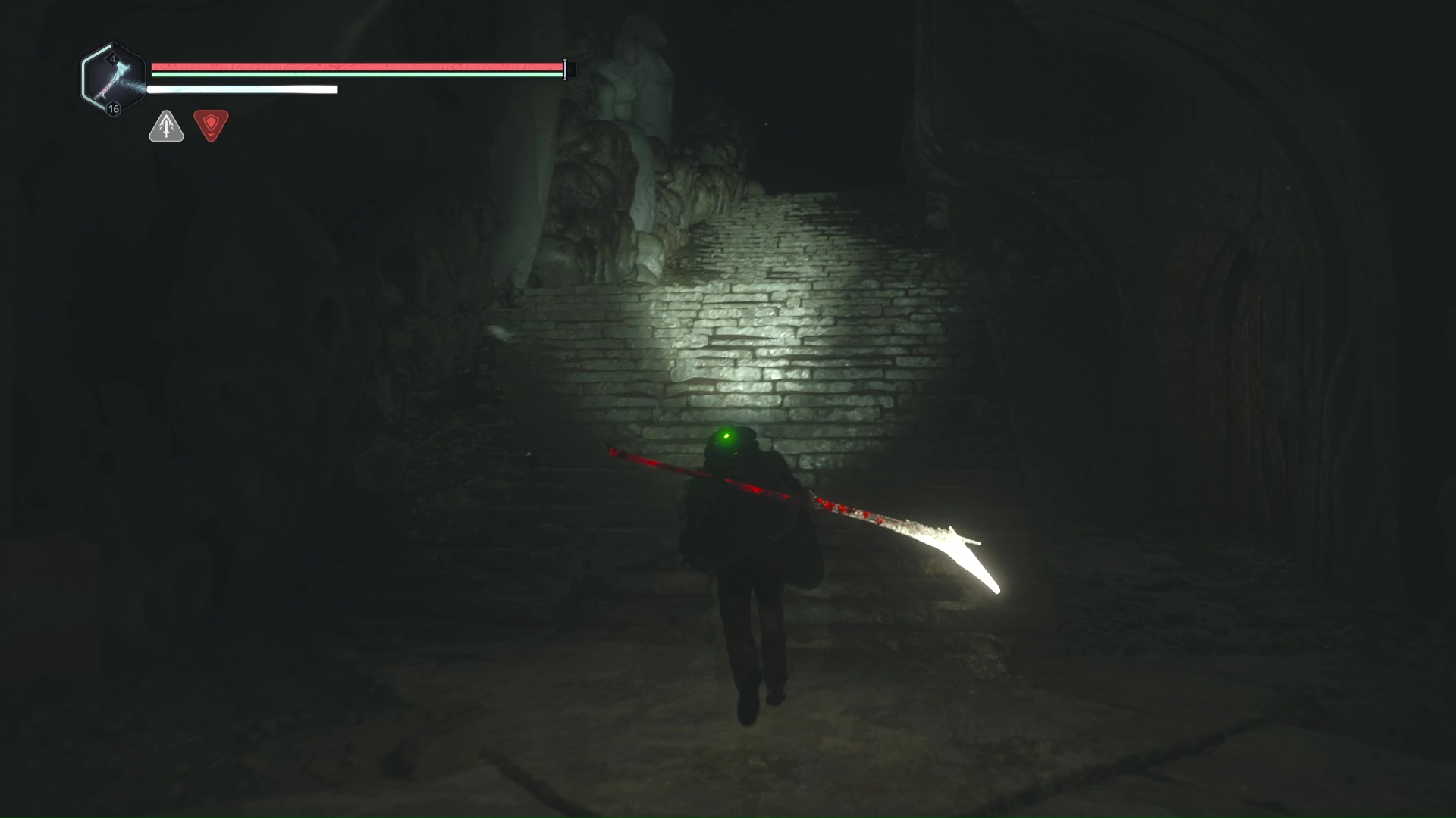 Après avoir pris le grand ascenseur en bois, continuez d’avancer dans la Tour d’Arcas jusqu’à entrer dans une salle avec de très nombreux Hollow Walkers. Battez-les et grimpez l’escalier en colimaçon. Avancez encore et laissez-vous tomber sur un grand escalier. Très vite, vous arrivez devant un trou béant.