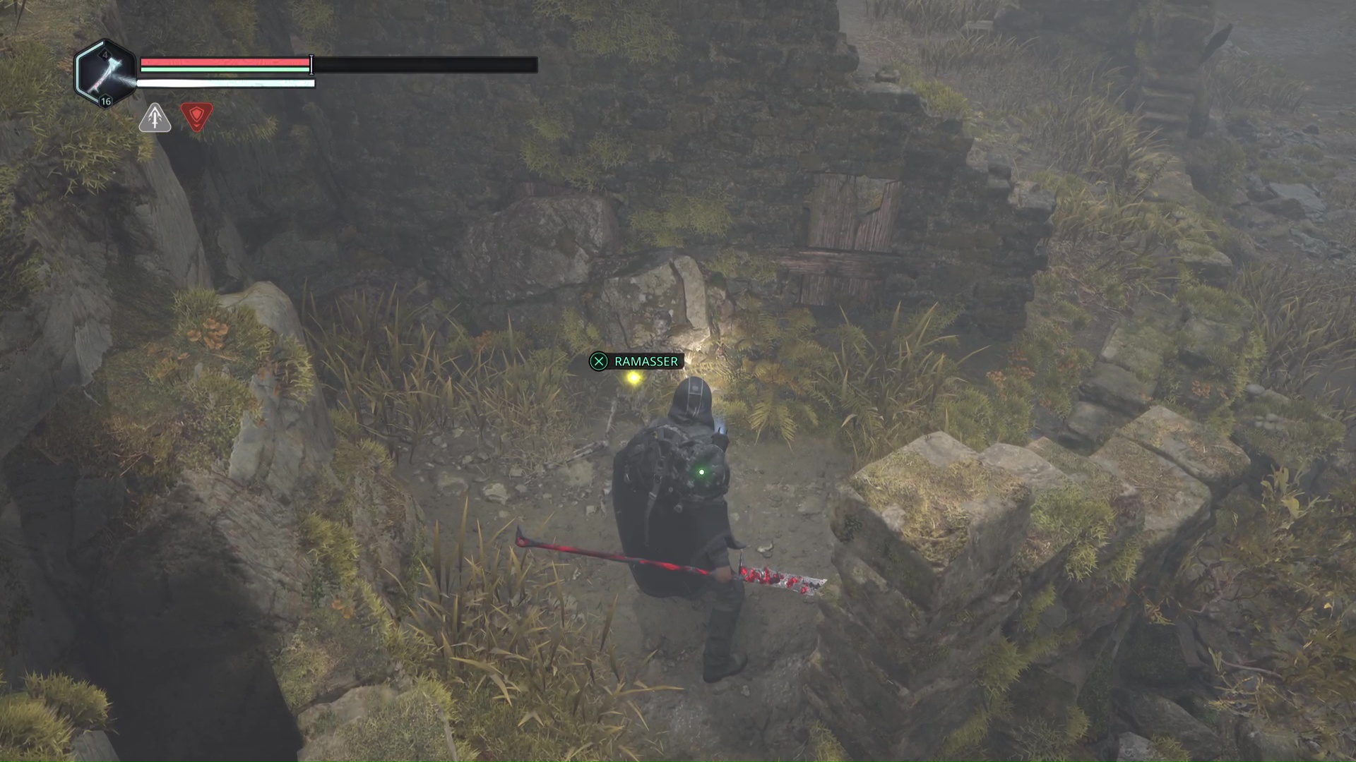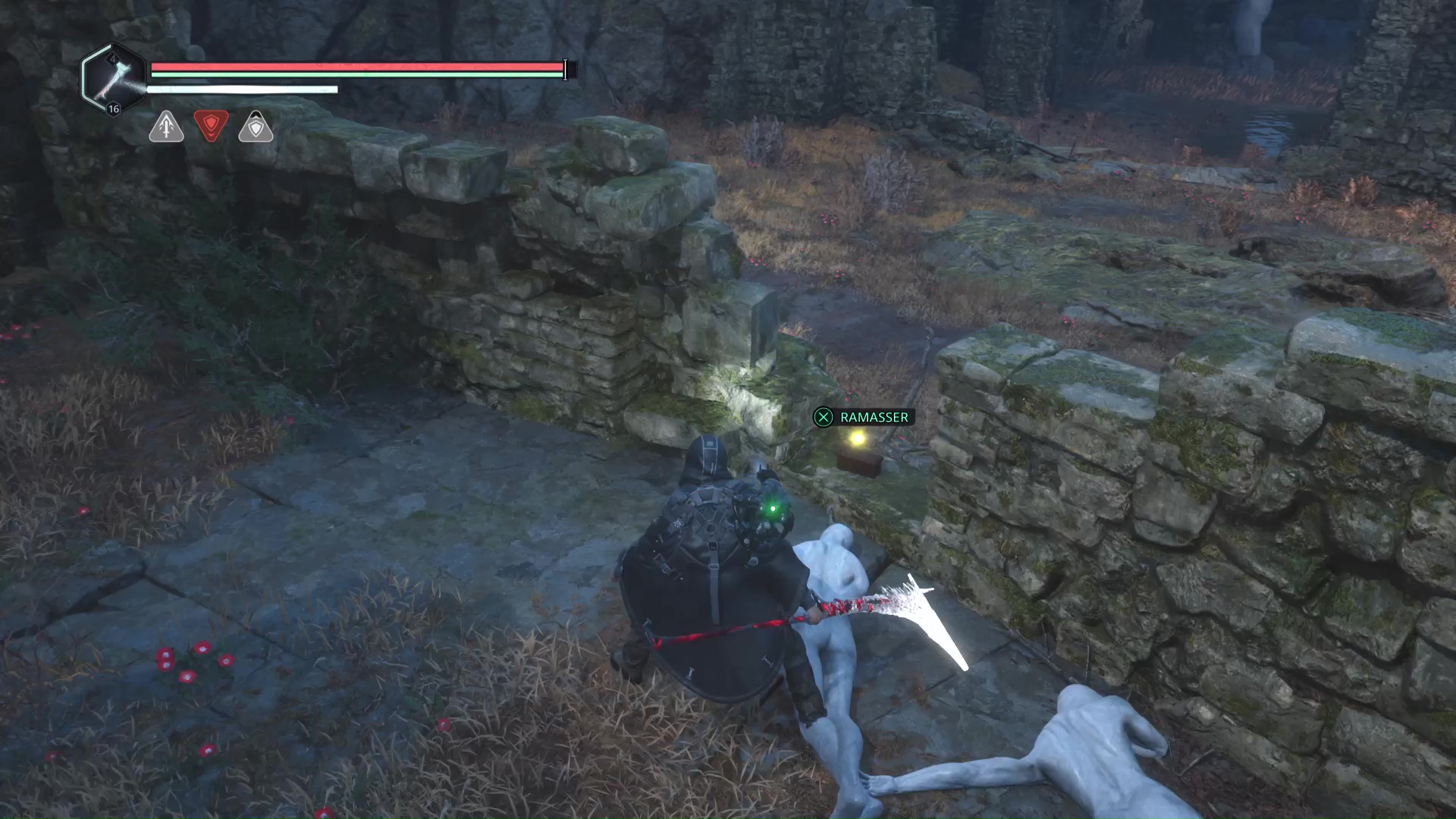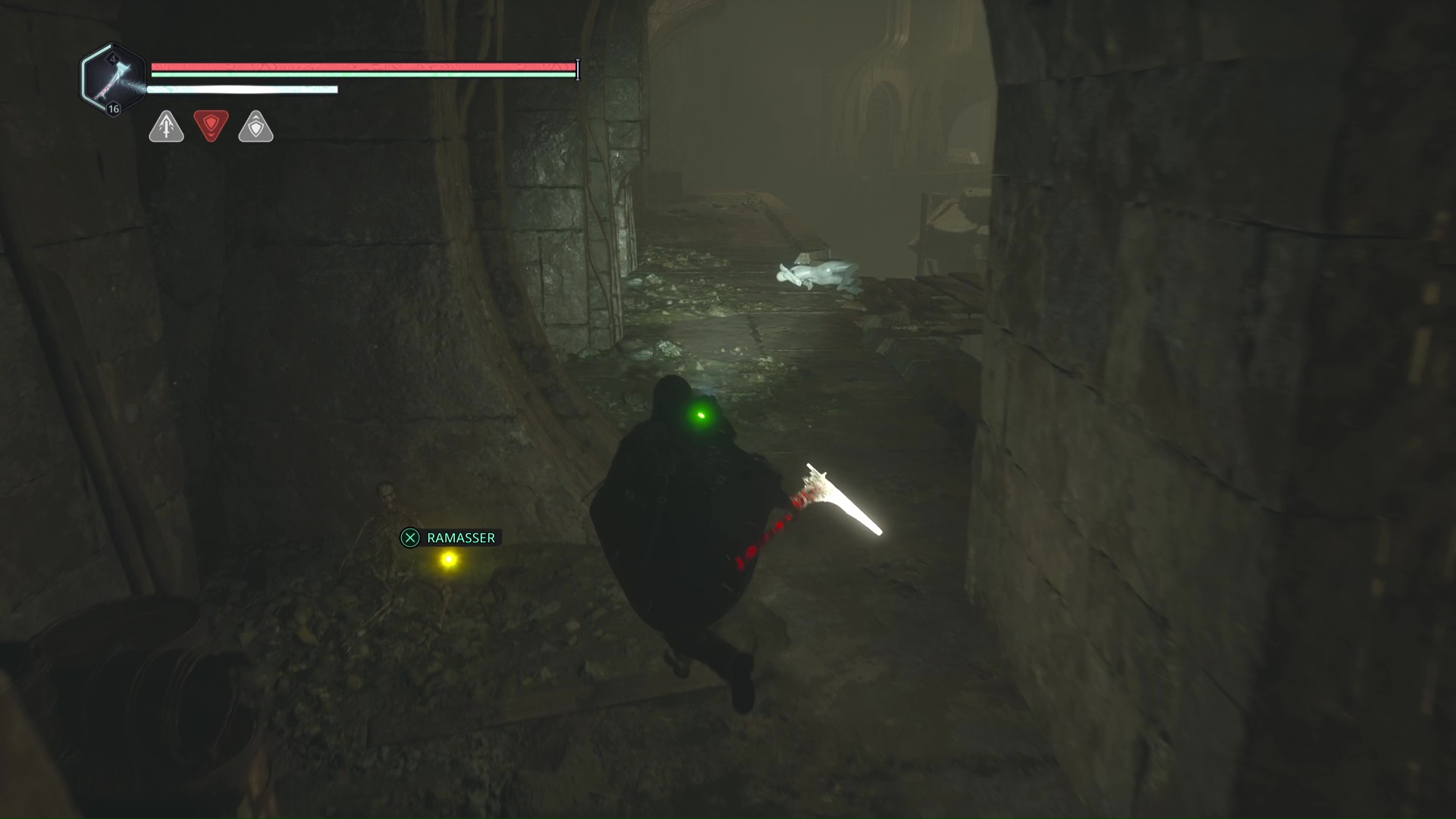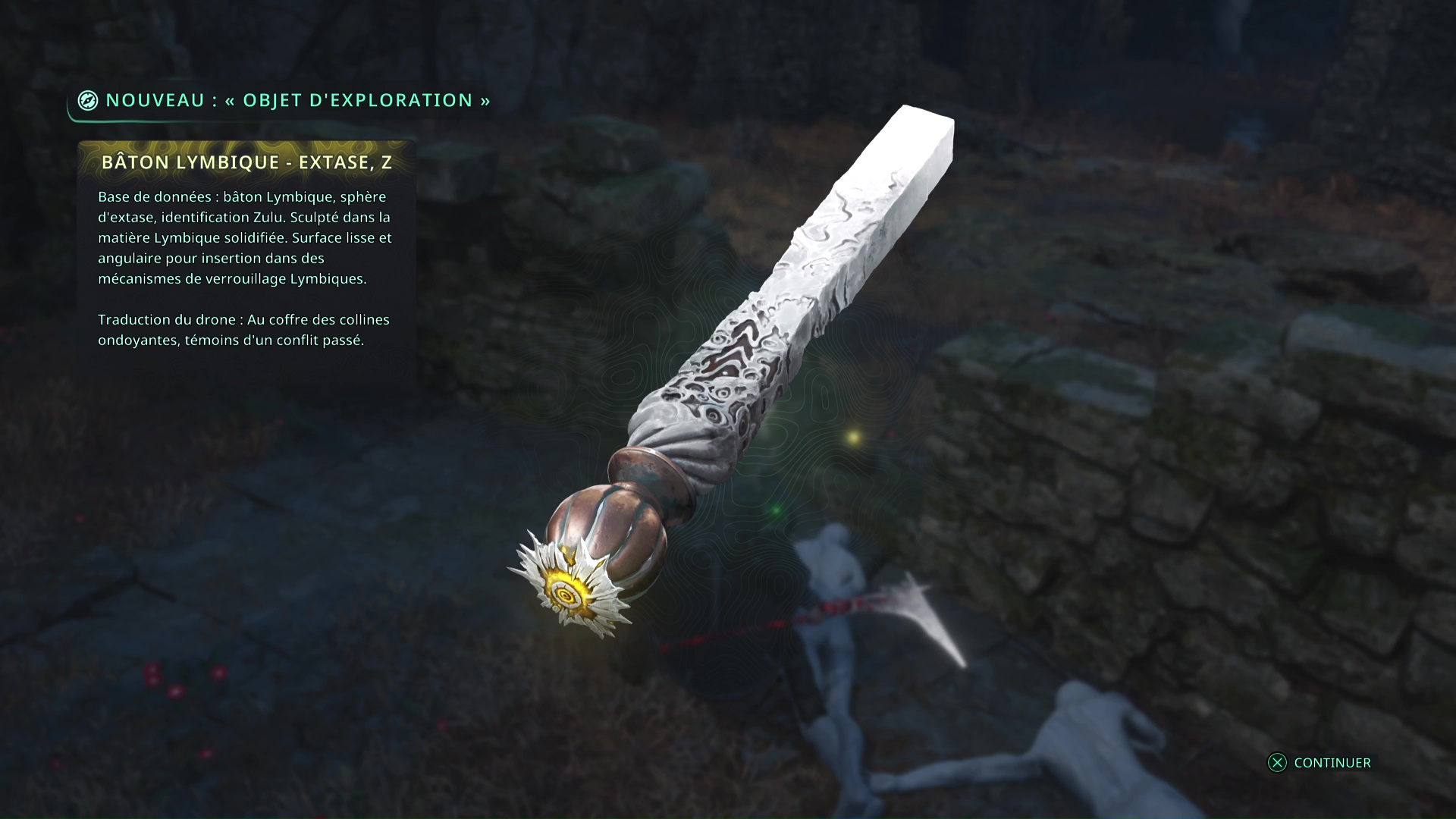 Eliminez-les et montez au niveau du tireur à distance. Progressez jusqu’à tomber sur d’autre Hollow Walkers à tuer. Sur votre gauche, un point brille par terre. Ramassez-le, c’est le Bâton Lymbique – Extase, W.