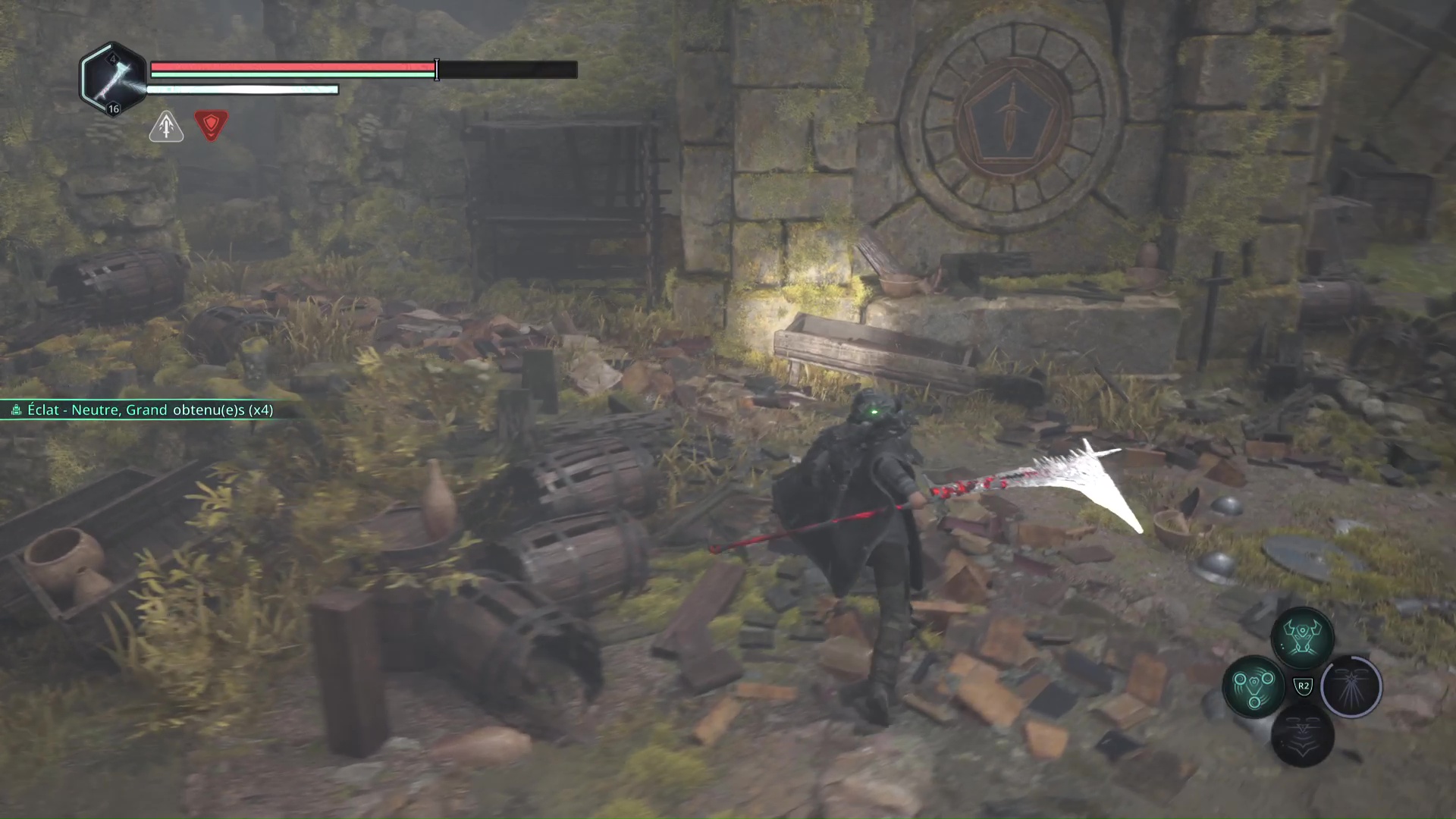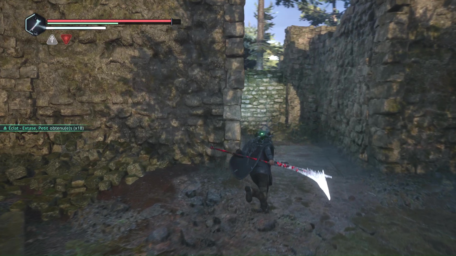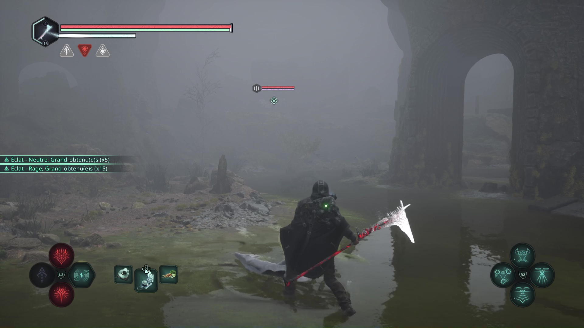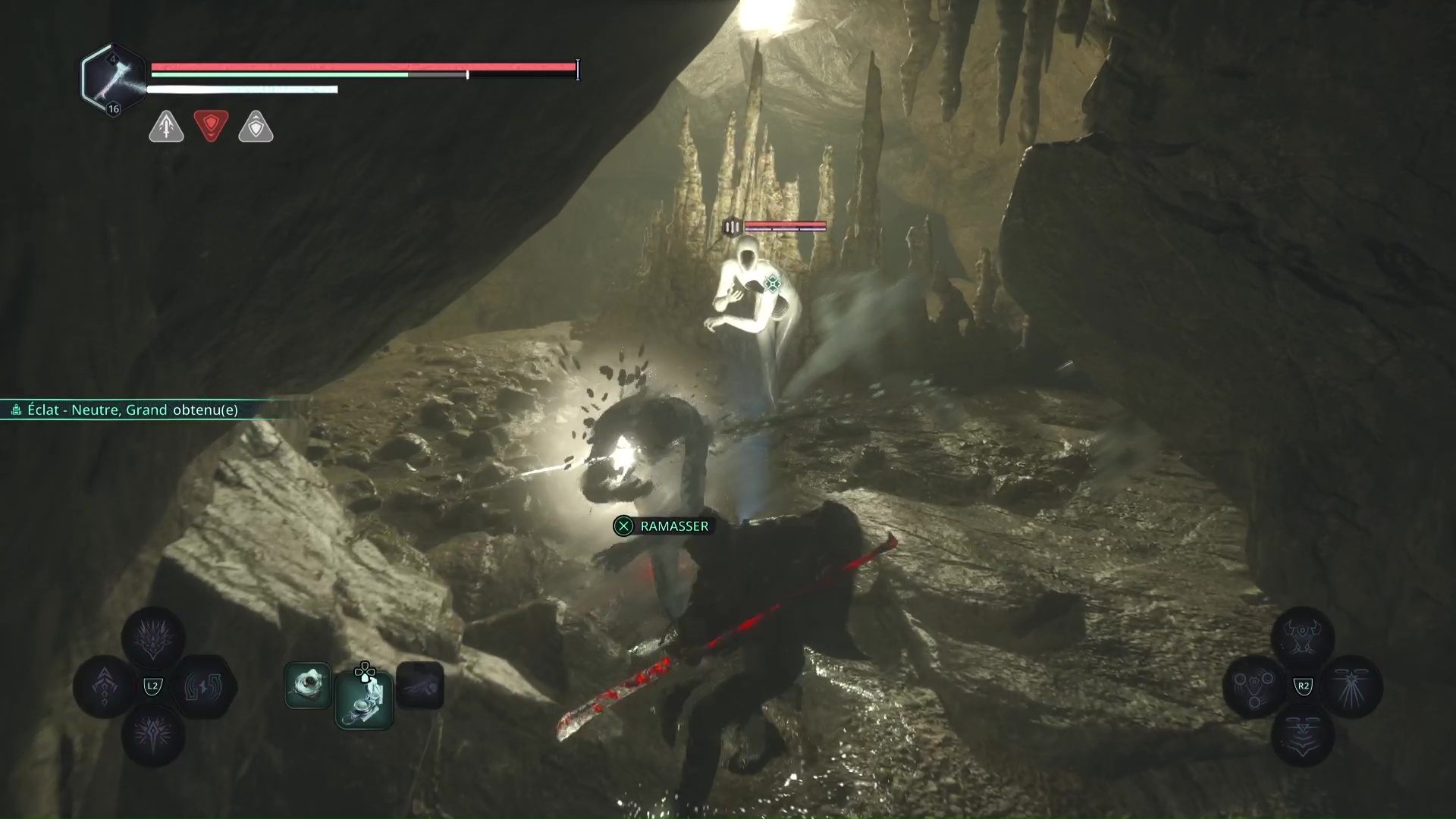Eliminez-les et montez au niveau du tireur à distance. Progressez jusqu’à tomber sur d’autre Hollow Walkers à tuer. Sur votre gauche, un point brille par terre. Ramassez-le, c’est le Bâton Lymbique – Extase, W.