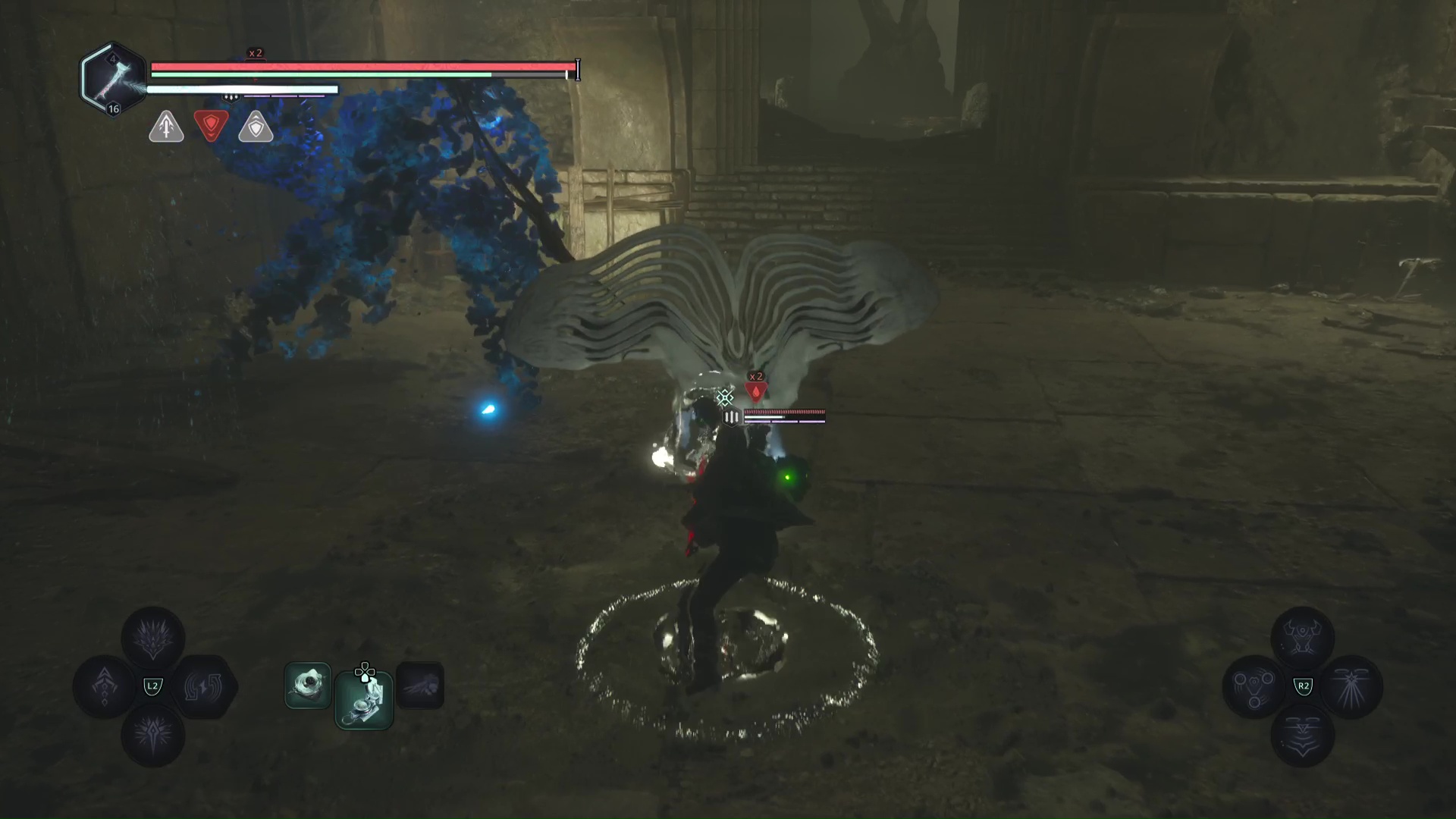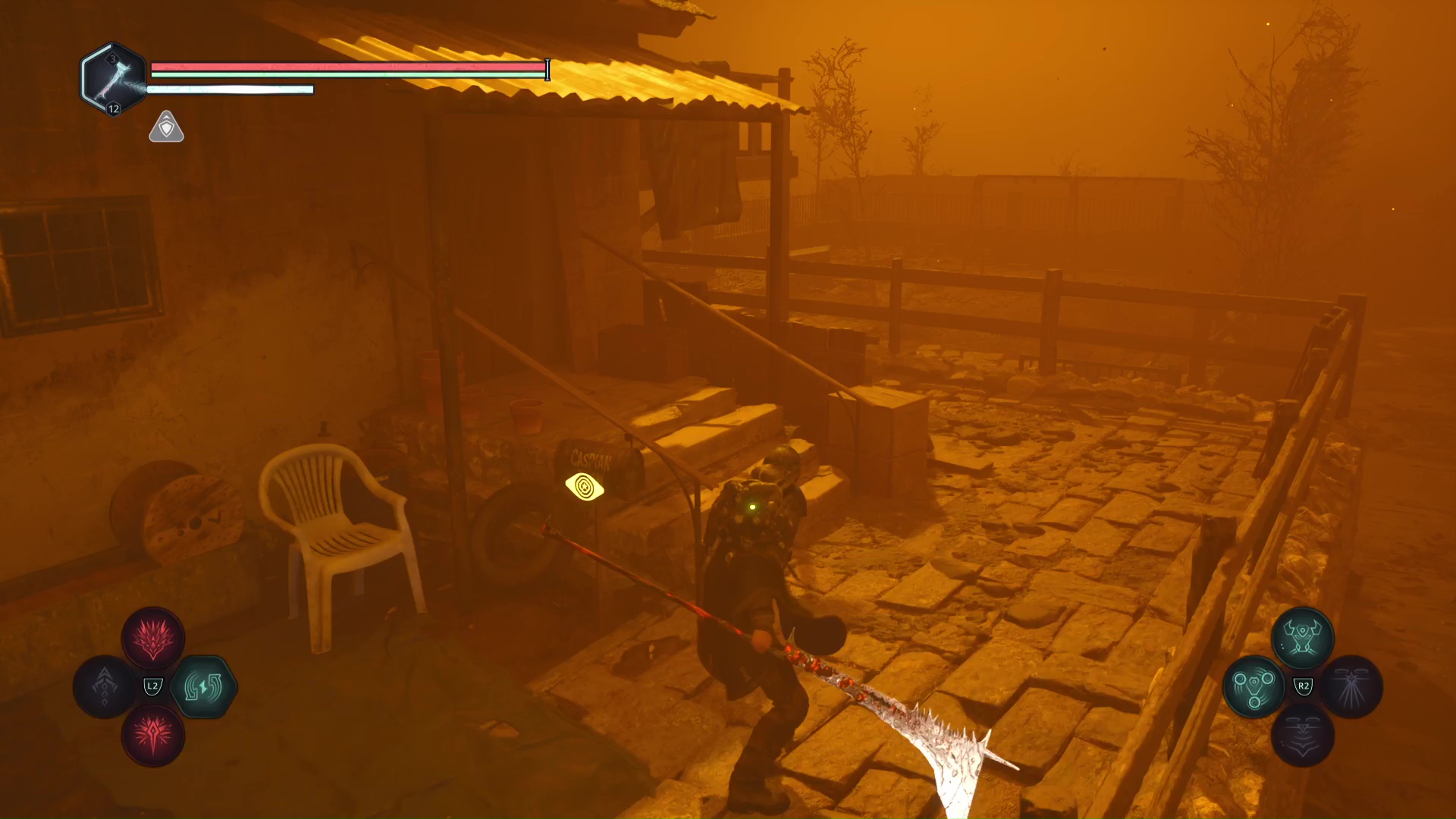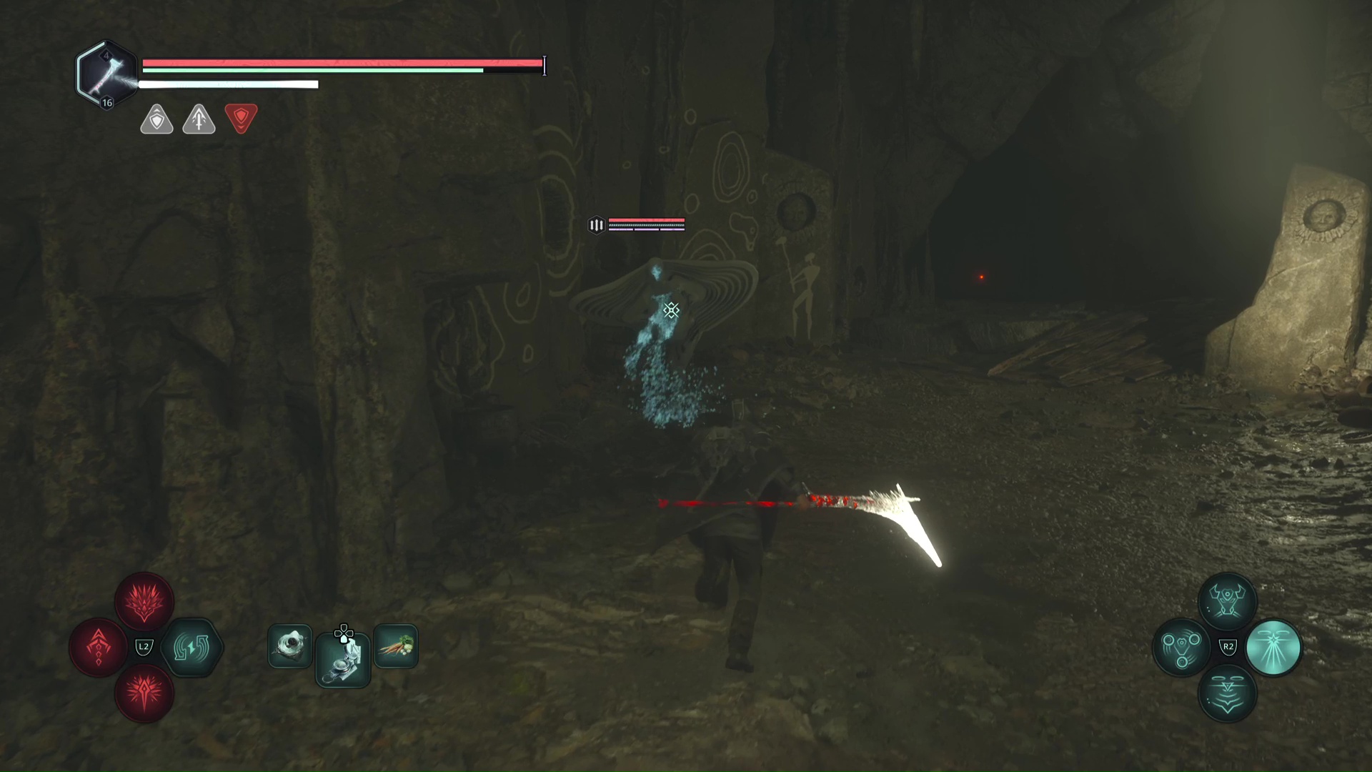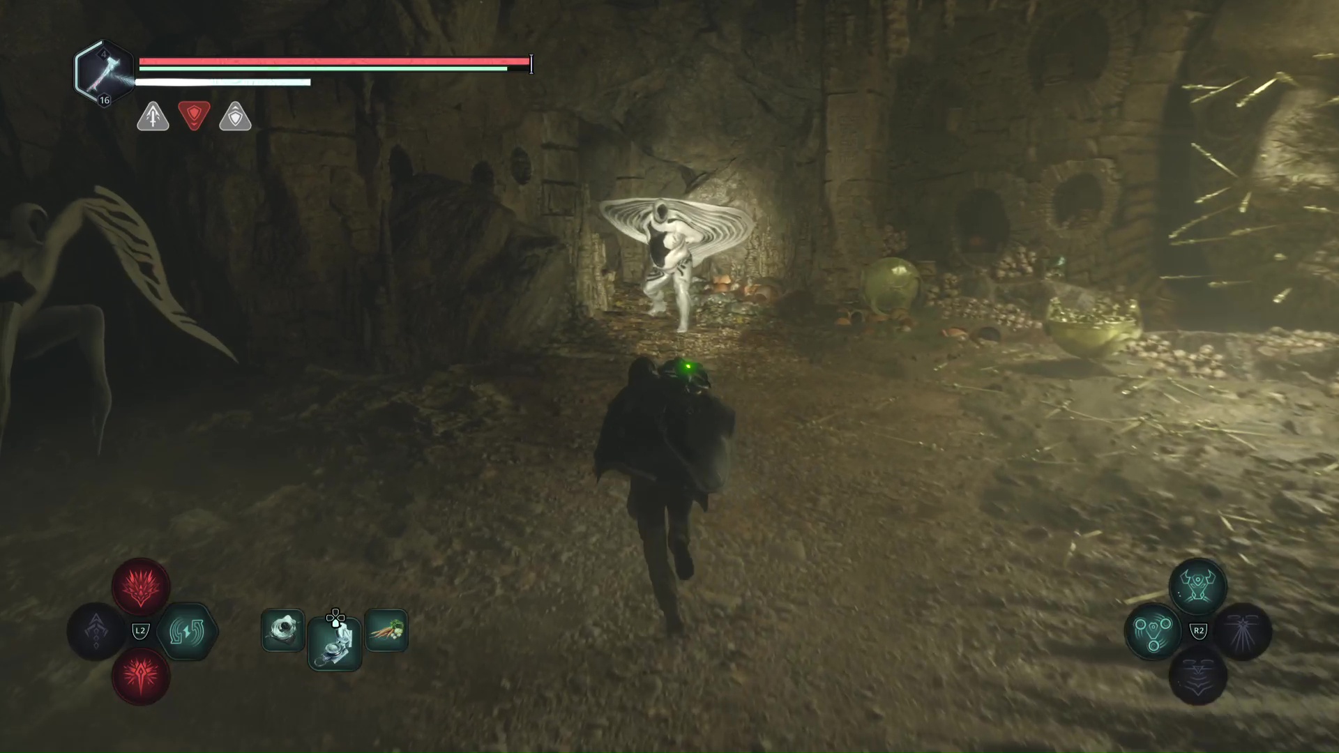Eliminez-les et montez au niveau du tireur à distance. Progressez jusqu’à tomber sur d’autre Hollow Walkers à tuer. Sur votre gauche, un point brille par terre. Ramassez-le, c’est le Bâton Lymbique – Extase, W.