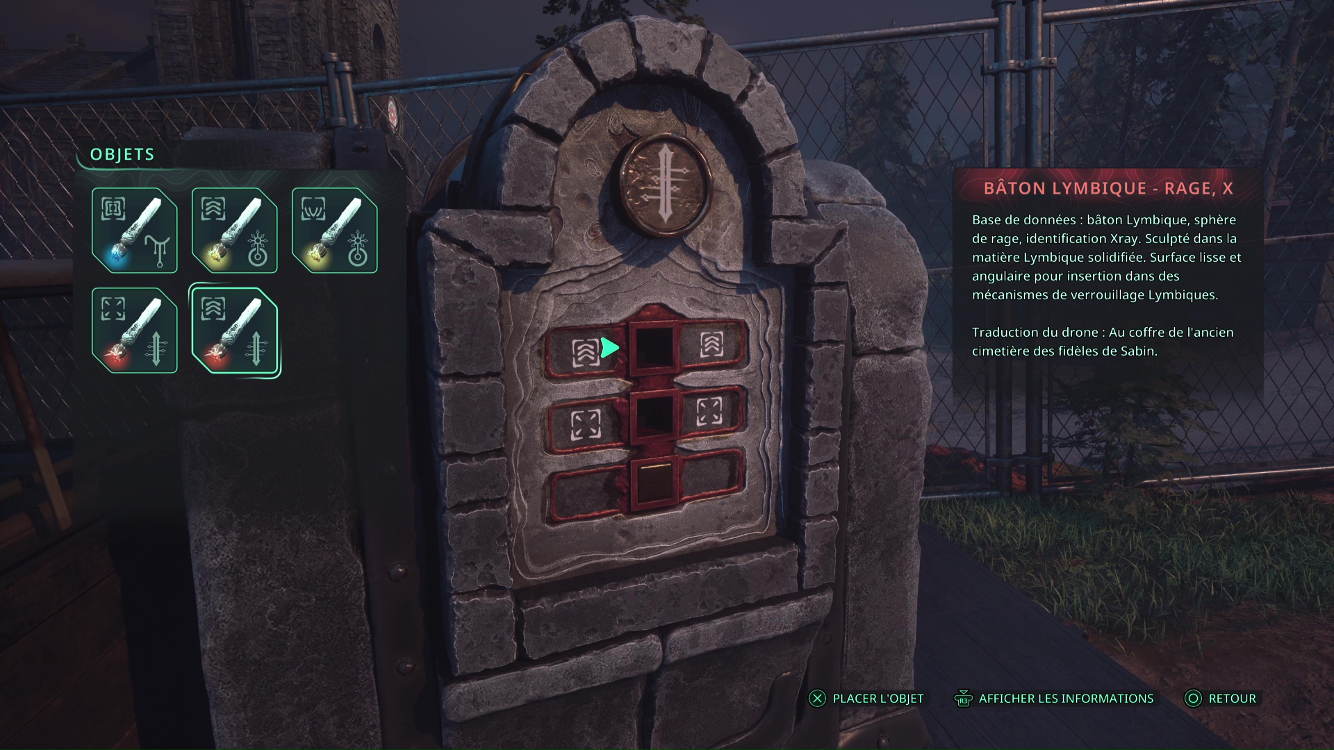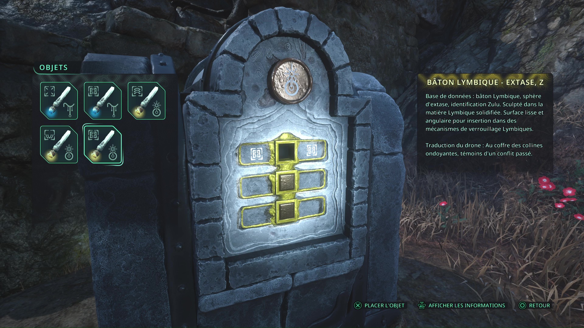 Lors de votre exploration du Nid du Guetteur, aux Collines Vyssa, vous devrez vous rendre sur la tombe d’Algea Pentos pour ramasser des jetons afin de réussir l’énigme. Juste derrière cette combe, par terre, se trouve le Bâton Lymbique – Chagrin, Z.