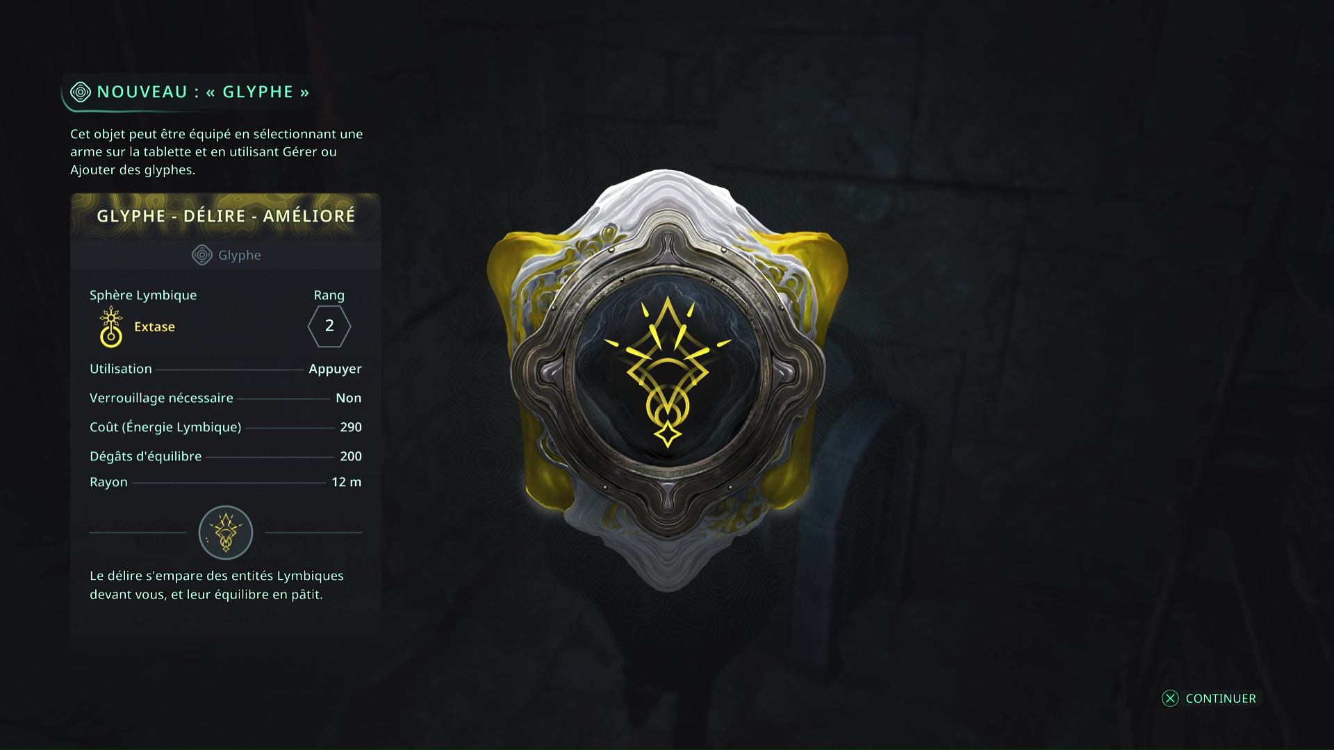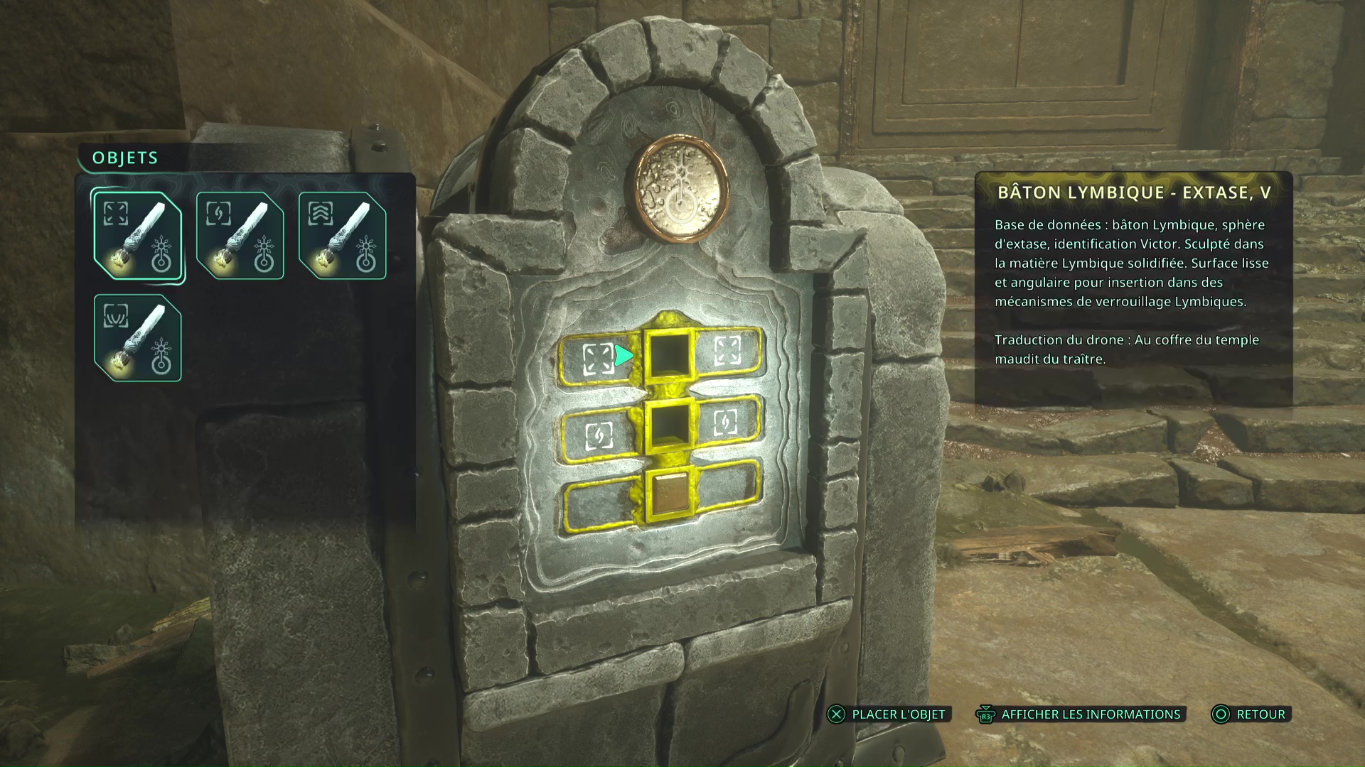 Le précieux bâton en main, revenez à la salle des clés des émotions, passez sous la cascade et déverrouillez le coffre. Vous obtiendrez 3 Condensateurs lymbiques – Moyens, un Glyphe jaune – Délire – Amélioré (Rang 2).