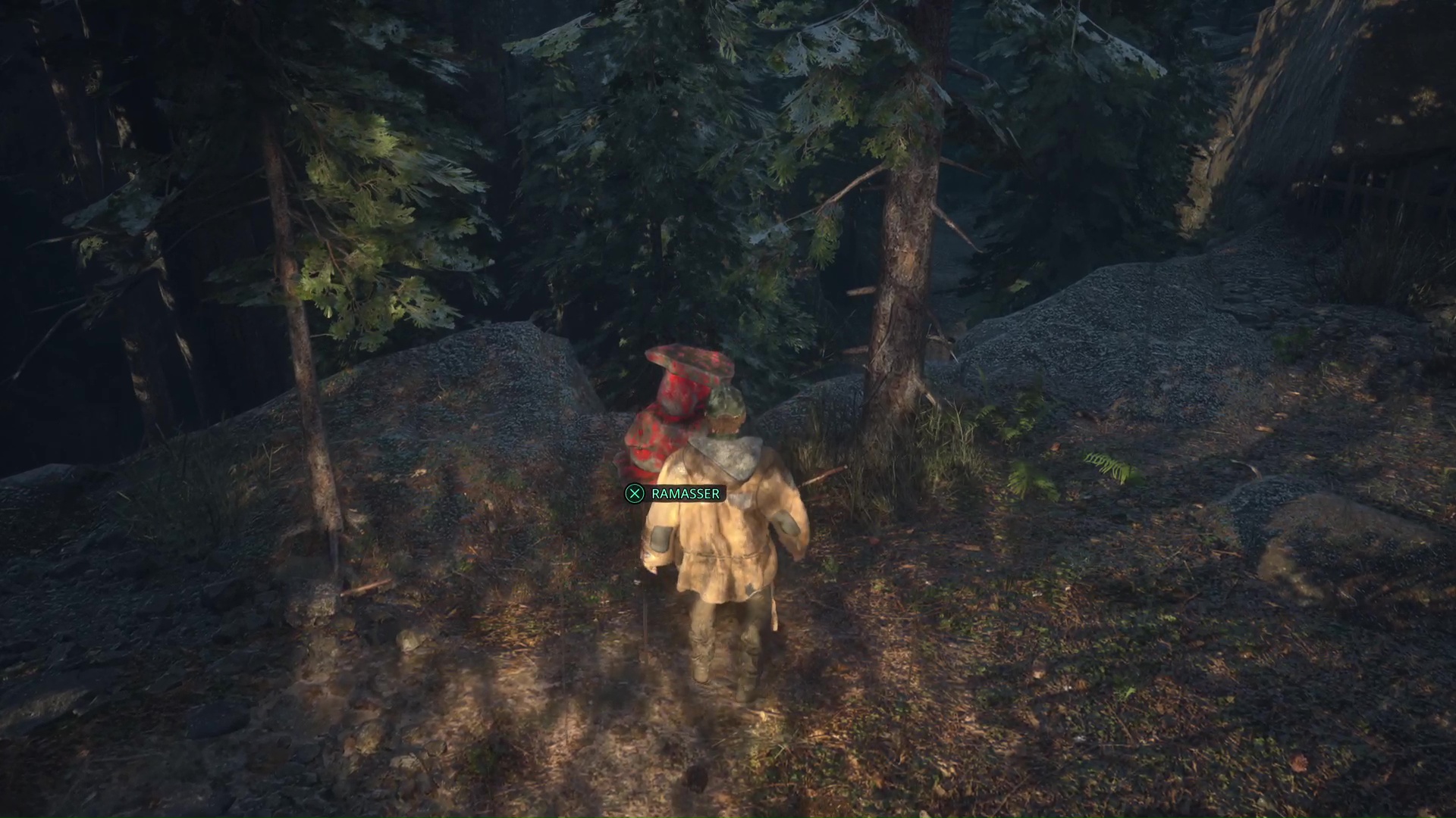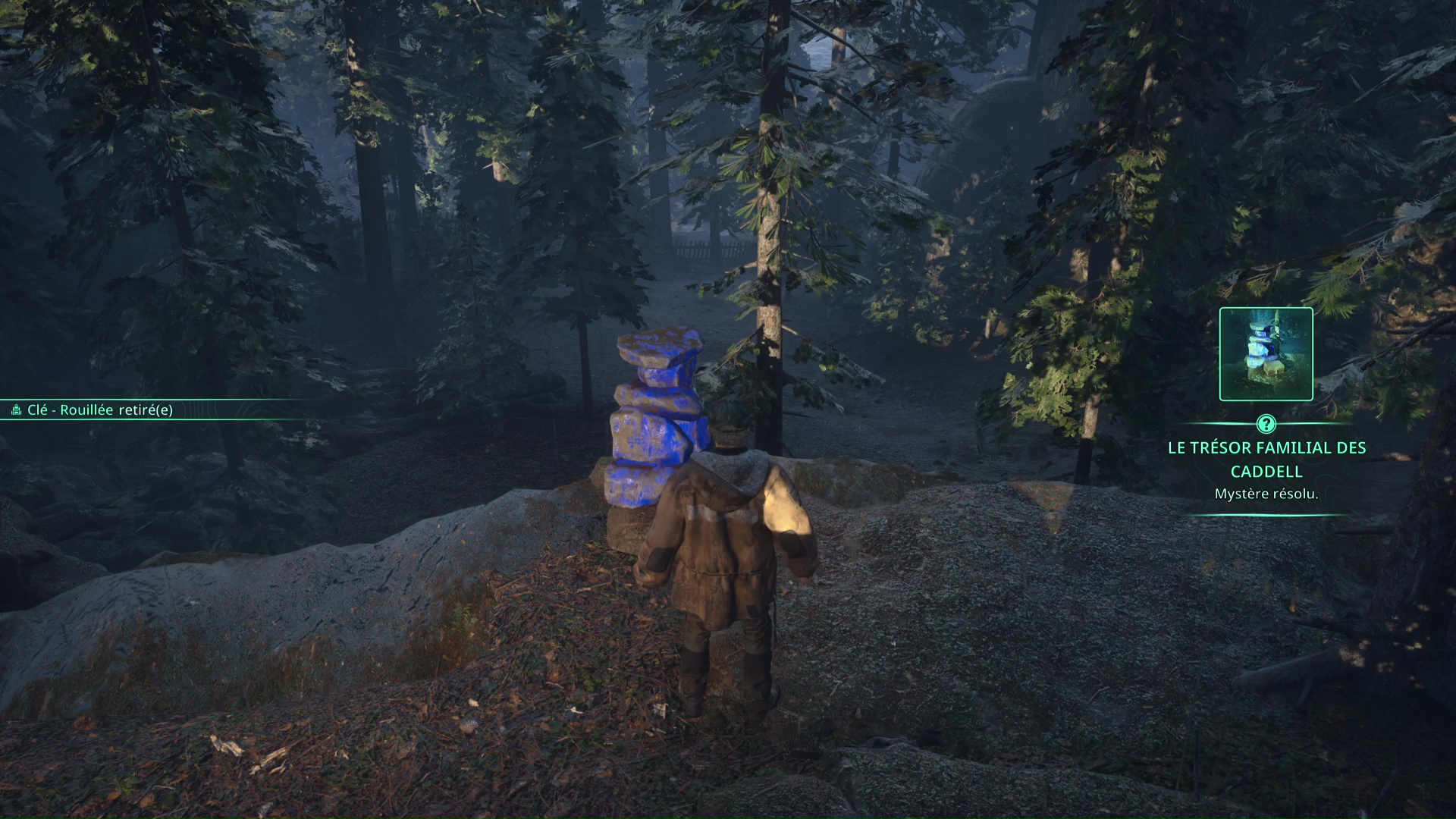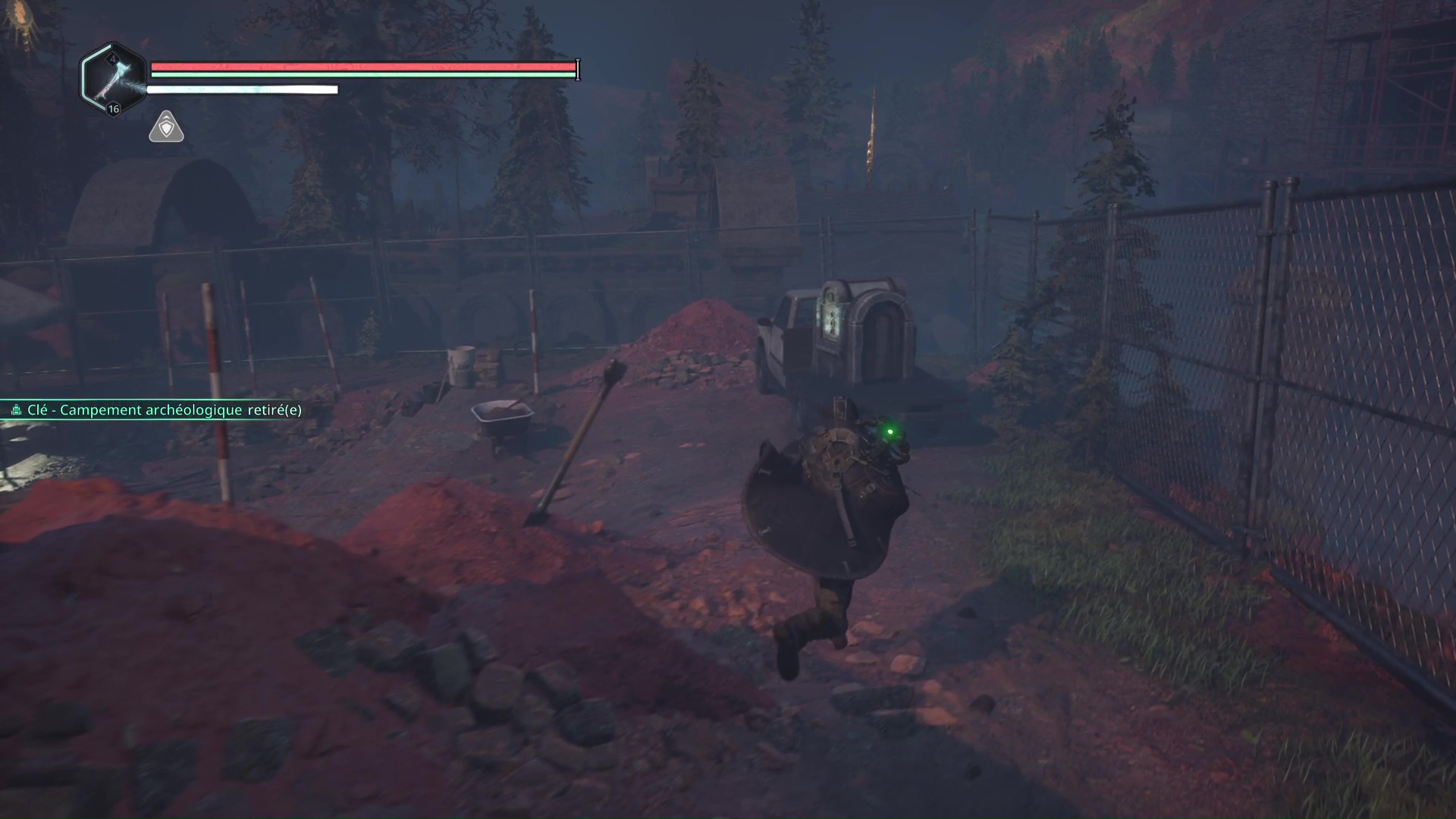 Toujours sur le chemin du campement OMSIF, vous arriverez à un nouveau croisement avec une croix blanche peinte au milieu d’un tas de rondins. Retournez-vous pour emprunter un chemin montant, au bout duquel vous trouverez un rocher peint en rouge. Examinez-le pour récupérer la Clé rouillée.