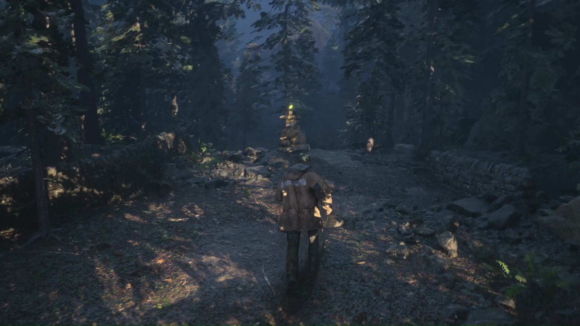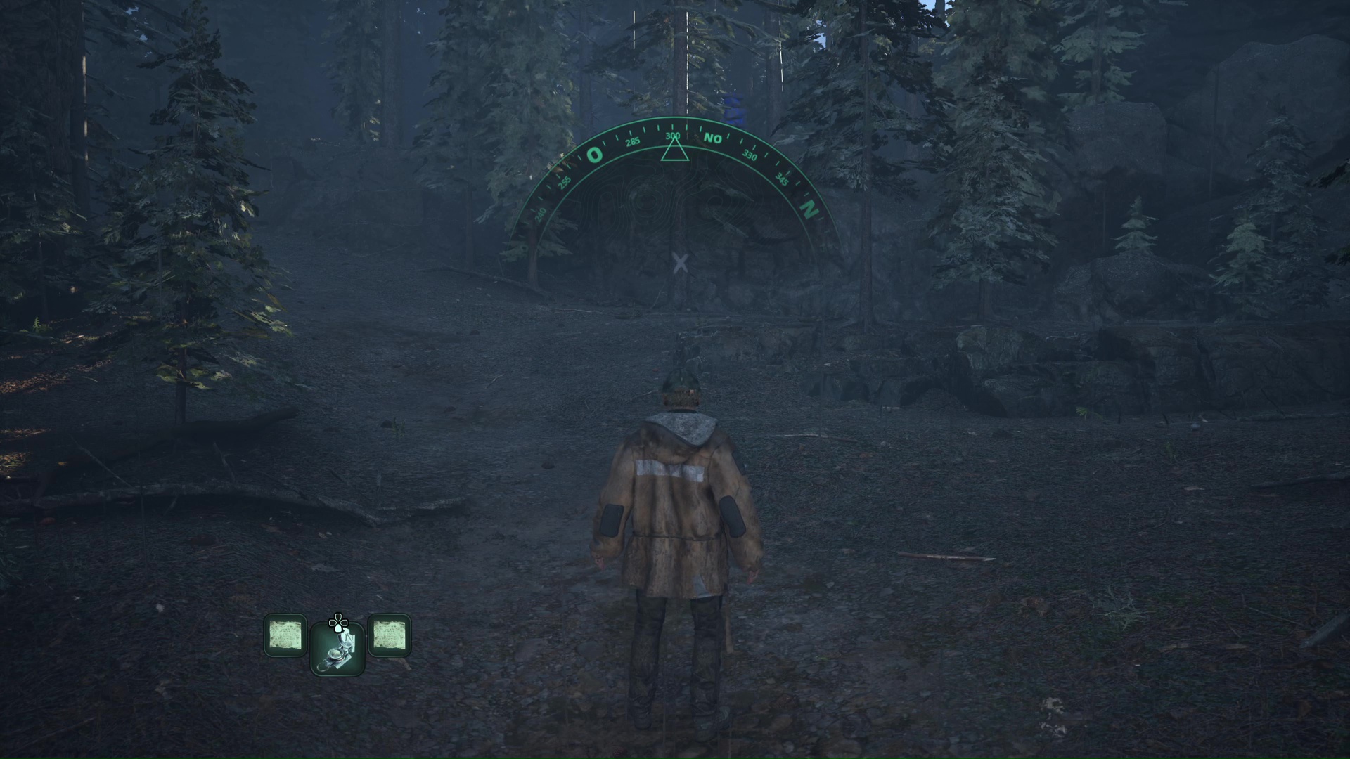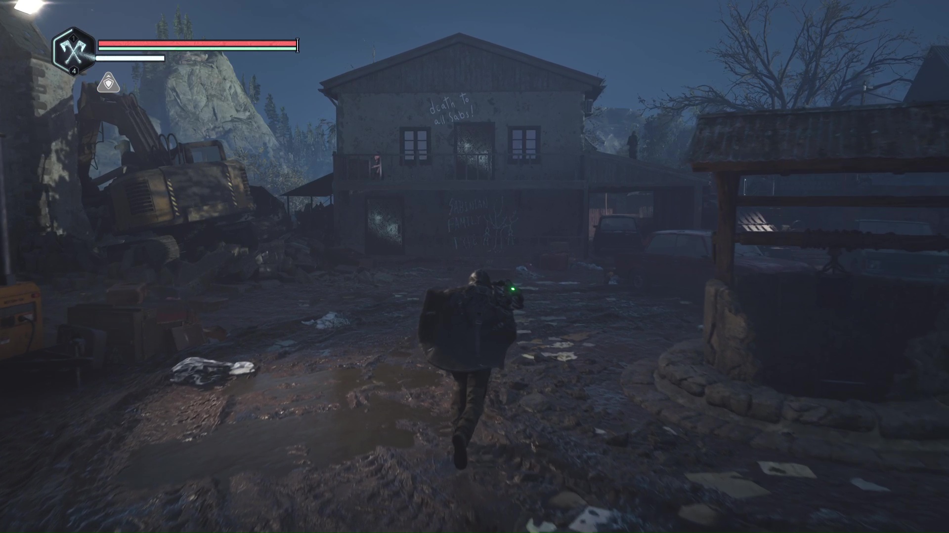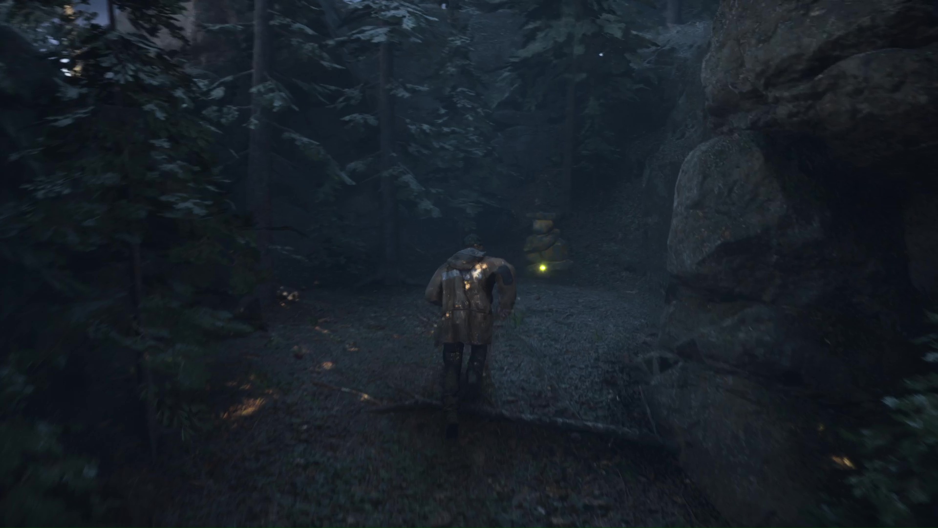 Toujours sur le chemin du campement OMSIF, vous arriverez à un nouveau croisement avec une croix blanche peinte au milieu d’un tas de rondins. Retournez-vous pour emprunter un chemin montant, au bout duquel vous trouverez un rocher peint en rouge. Examinez-le pour récupérer la Clé rouillée.