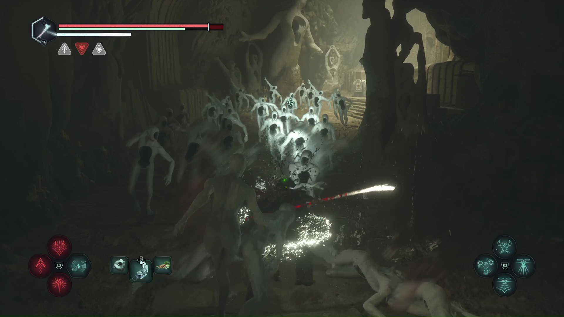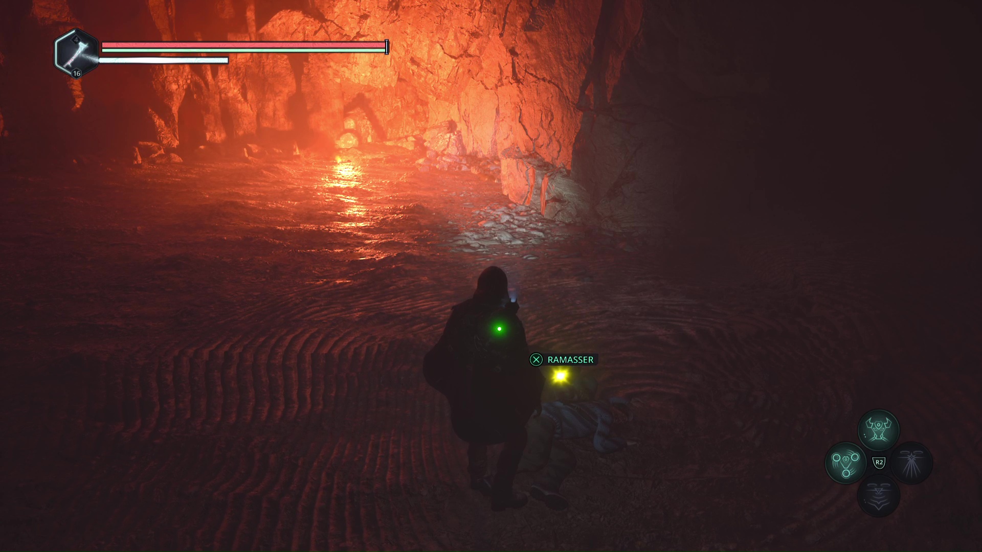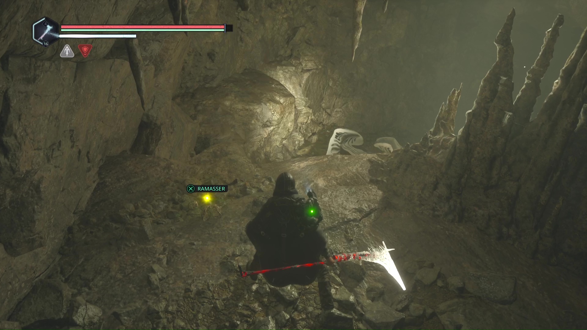 Au lieu de continuer à descendre, serrez à gauche pour vous enfoncer dans une grotte. Ne tournez pas à gauche et continuez tout droit jusqu’à rejoindre une autre échelle gardée par un Hollow Walker.