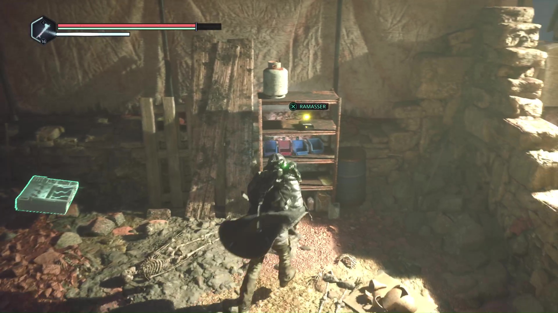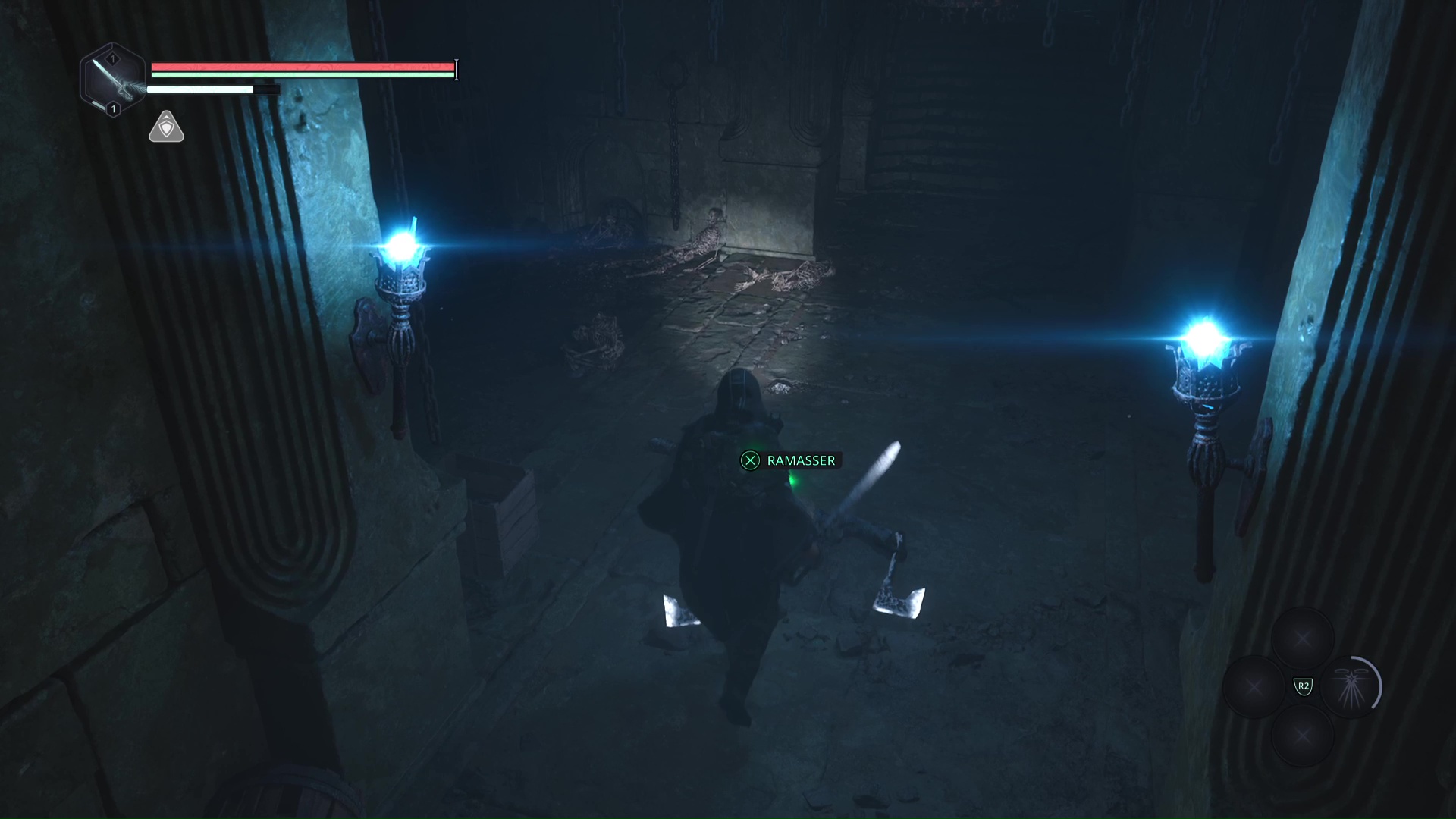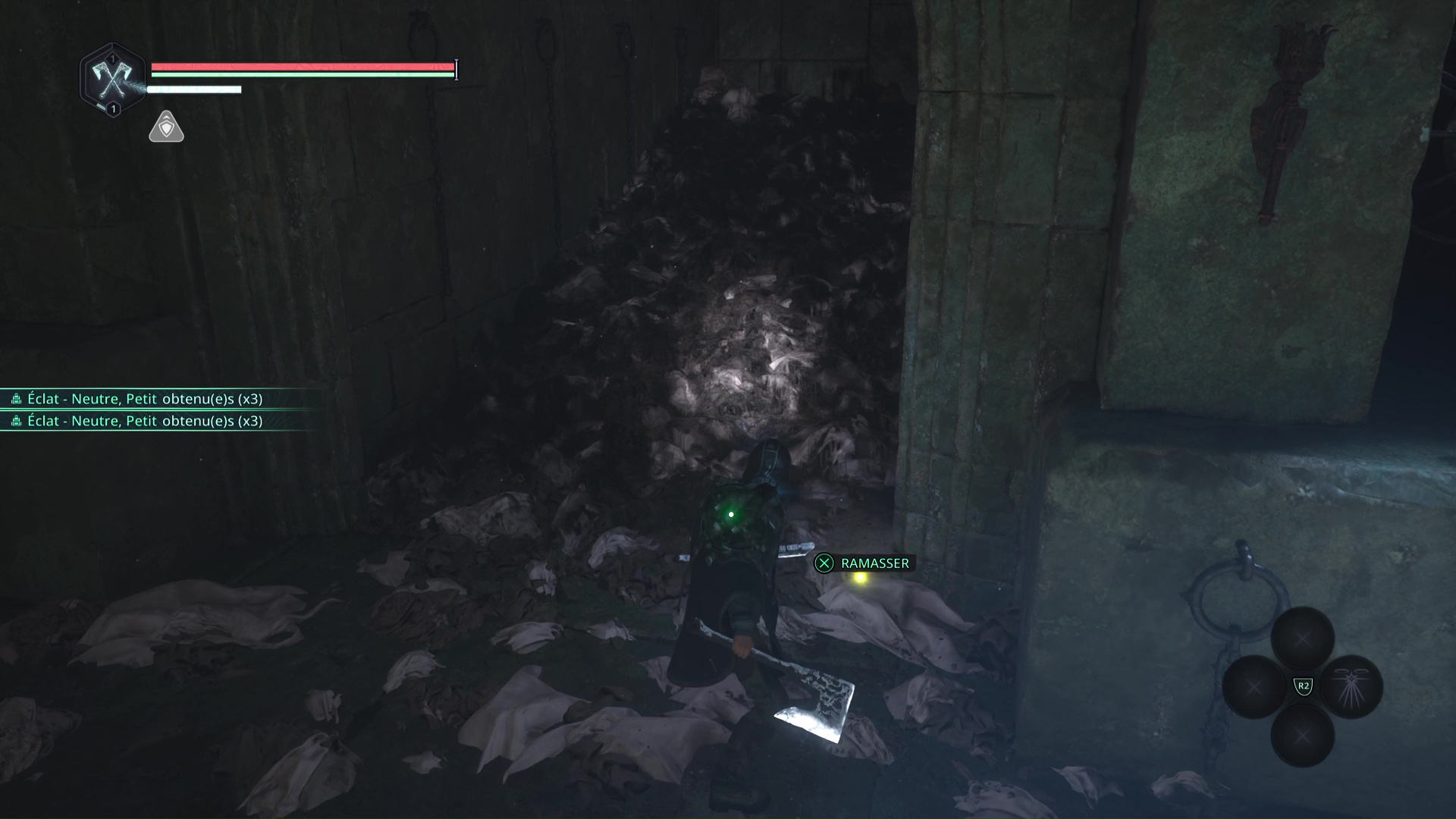 Laissez-vous tomber petit à petit et éliminez les deux Hollow Walkers-Haze de rage. Une fois le calme revenu, observez le point brillant doré sur un squelette. Ramassez-le, il s’agit d’une Clé – Laiton.