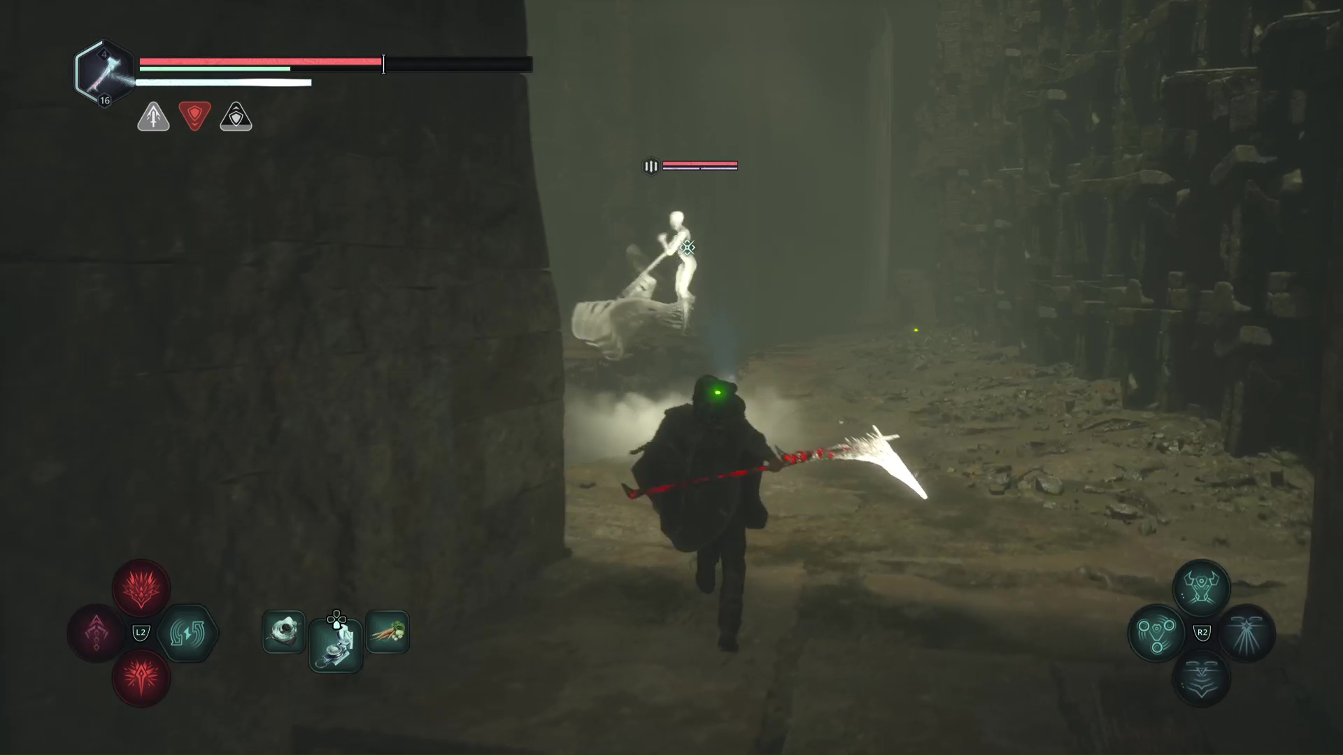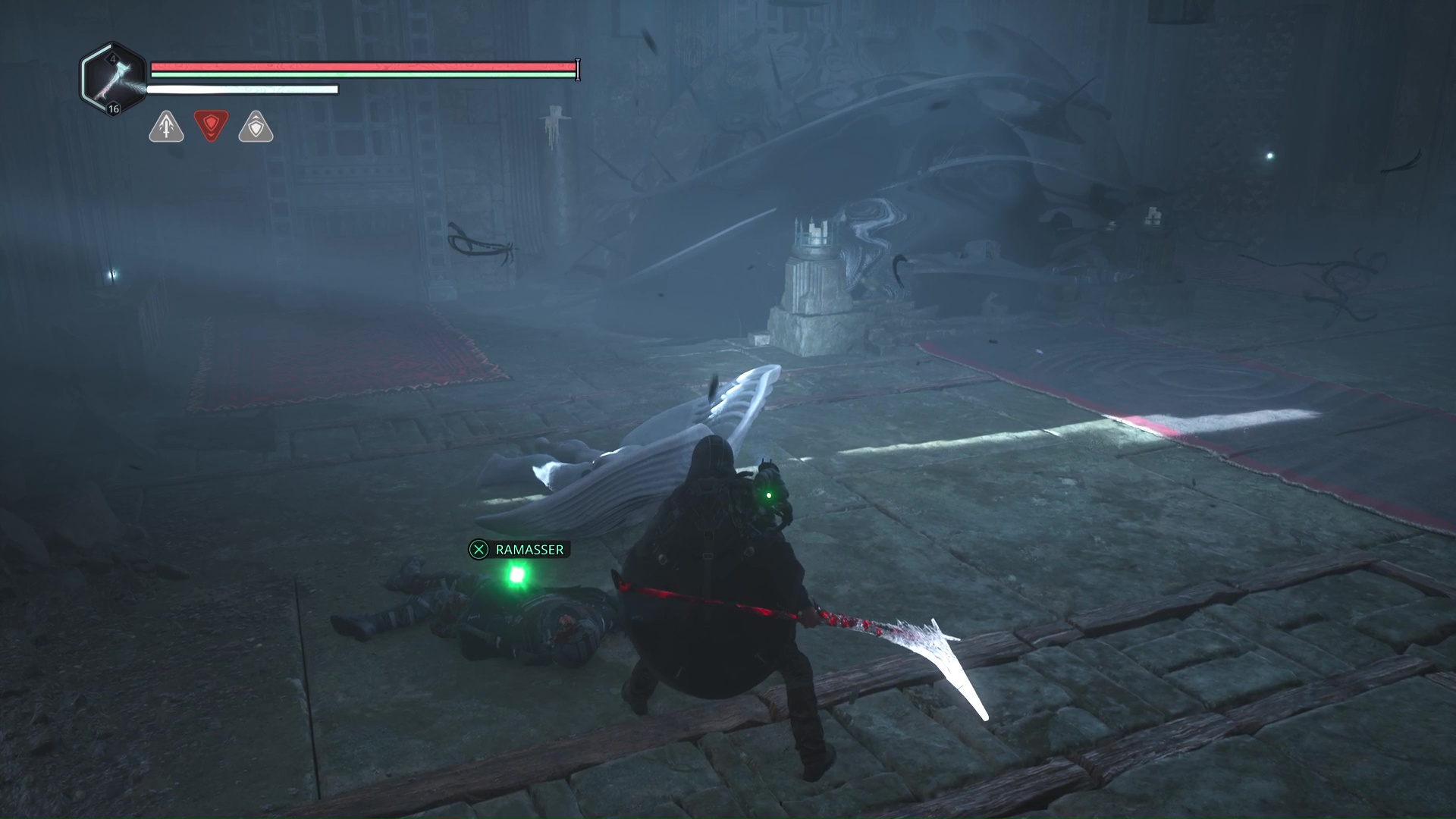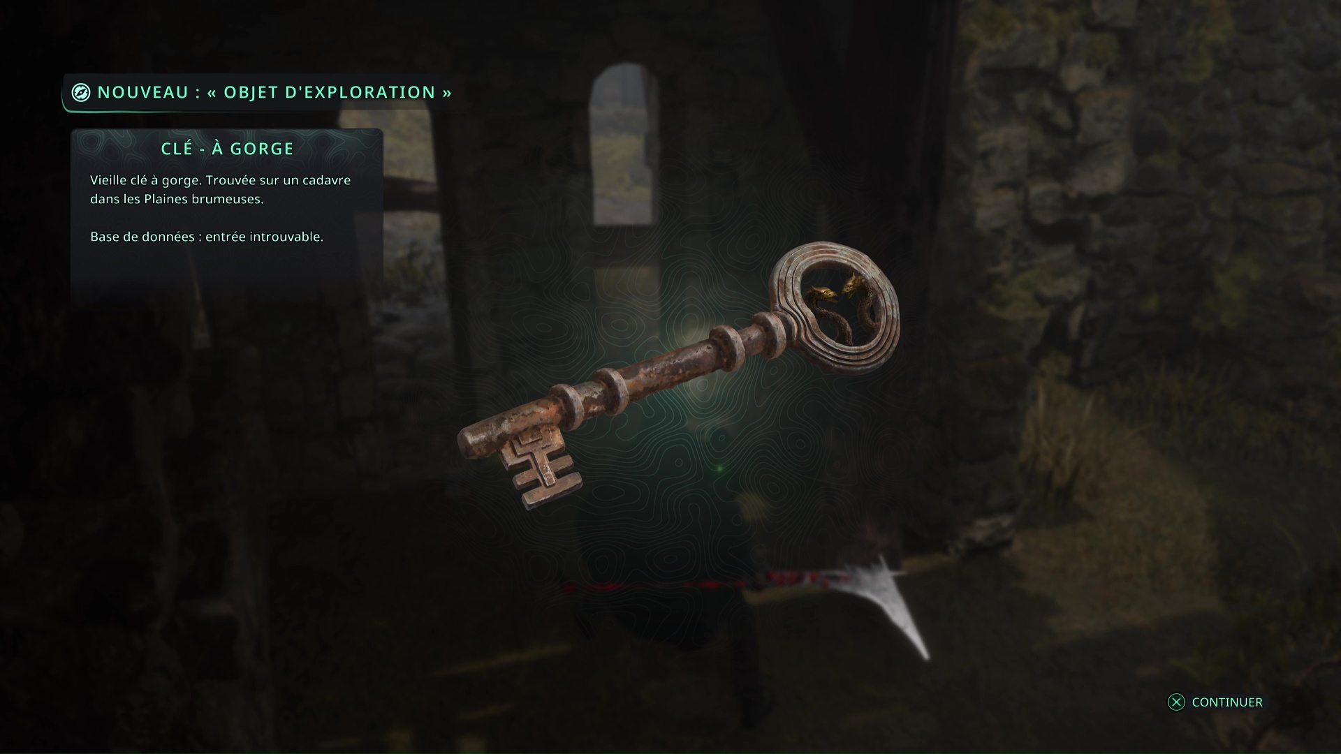 Laissez-vous tomber petit à petit et éliminez les deux Hollow Walkers-Haze de rage. Une fois le calme revenu, observez le point brillant doré sur un squelette. Ramassez-le, il s’agit d’une Clé – Laiton.
