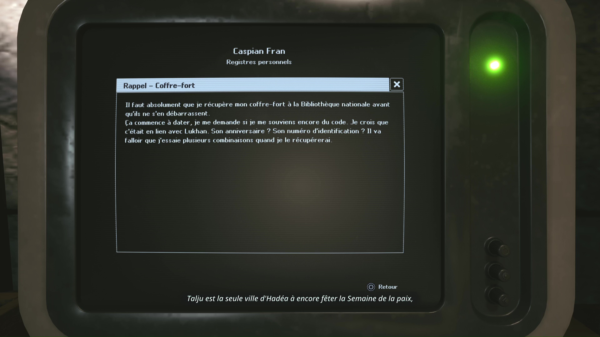Toutes ces notes constituent un mot de passe à rentrer dans l’ordinateur de Lethé – Bibliothèque nationale. Cet ordinateur se trouve à l’étage, dans la pièce où un hélicoptèe à traversé le plafond. Les lettres doivent être remises en ordre et font référence à l’ancien dirigeant d’Hadéa : Y-A-N-K-E-L. Le code est donc 731596. Profitez ensuite des « révélations » disponibles au sein des trois fichiers.