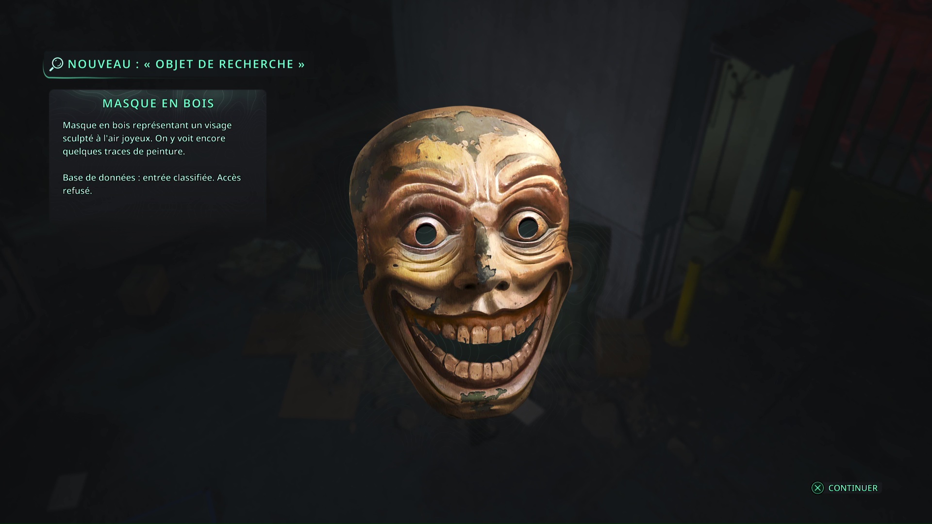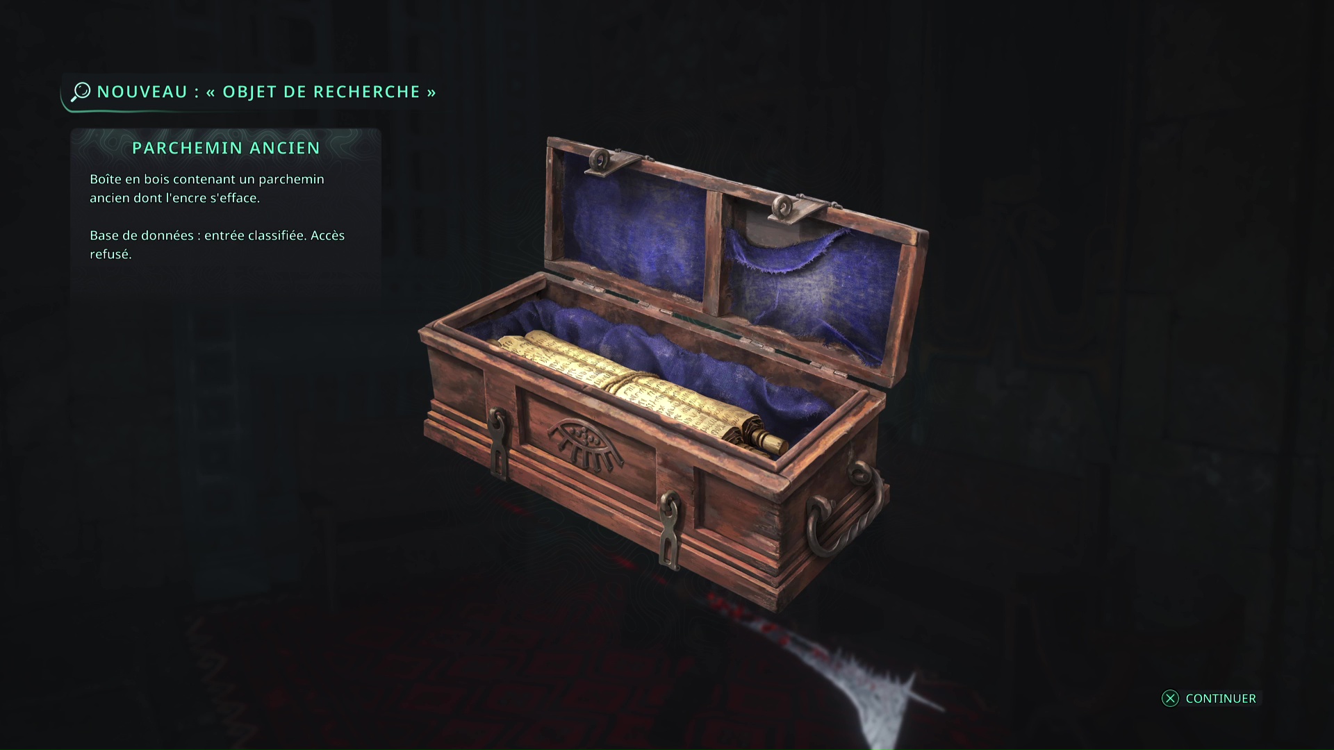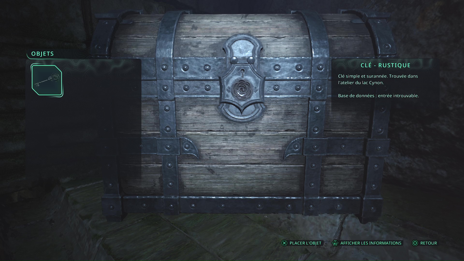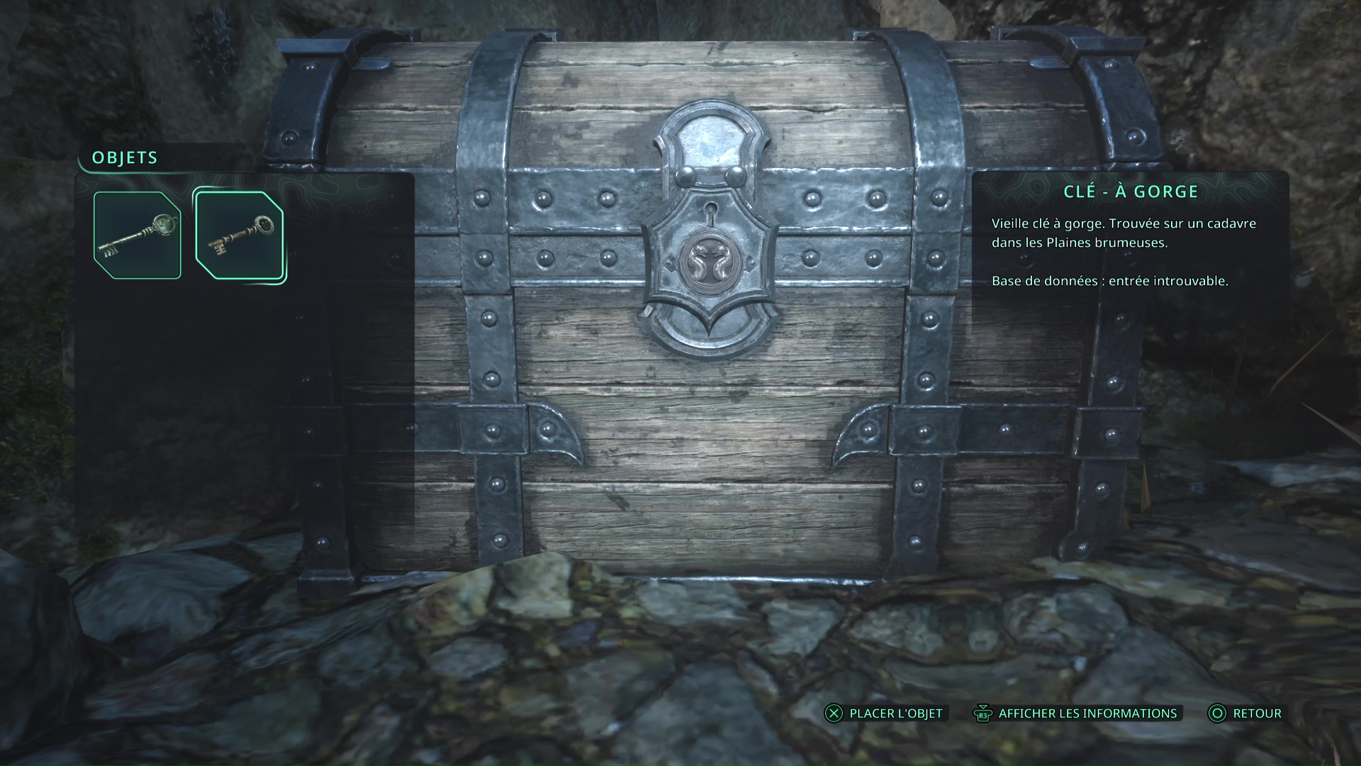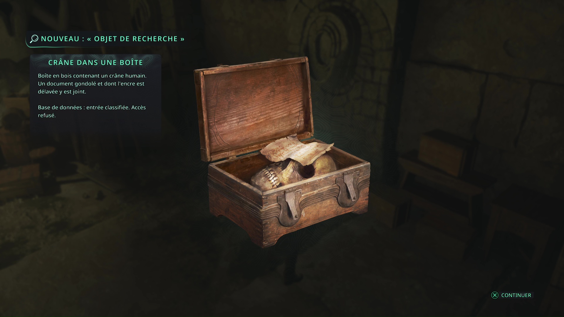 Une fois la porte ouverte, le mystère est résolu. Dans cette salle, vous trouverez, entre autres, l’objet de recherche Crâne dans une boîte.