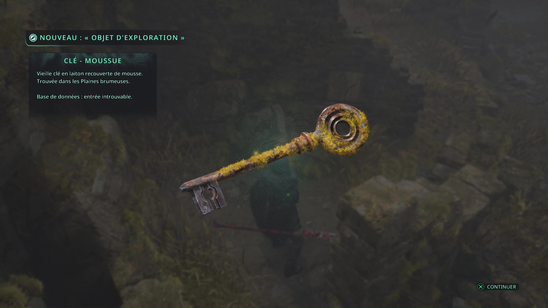 Restez ensuite dans cette zone en allant tout au bout du chemin. A un moment, sur votre droite, et juste après le symbole de l’épée utile pour l’énigme de la porte, vous verrez les ruines d’une maison. Au pied du mur de la maison, côté extérieur, ramassez le point brillant doré. Il s’agit d’une Clé – Moussue.